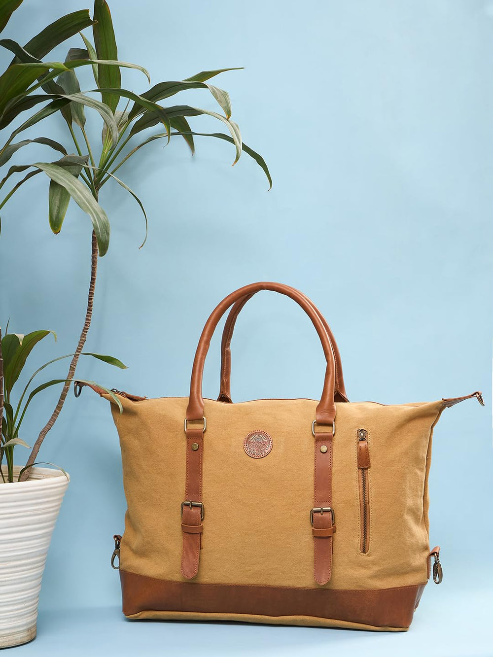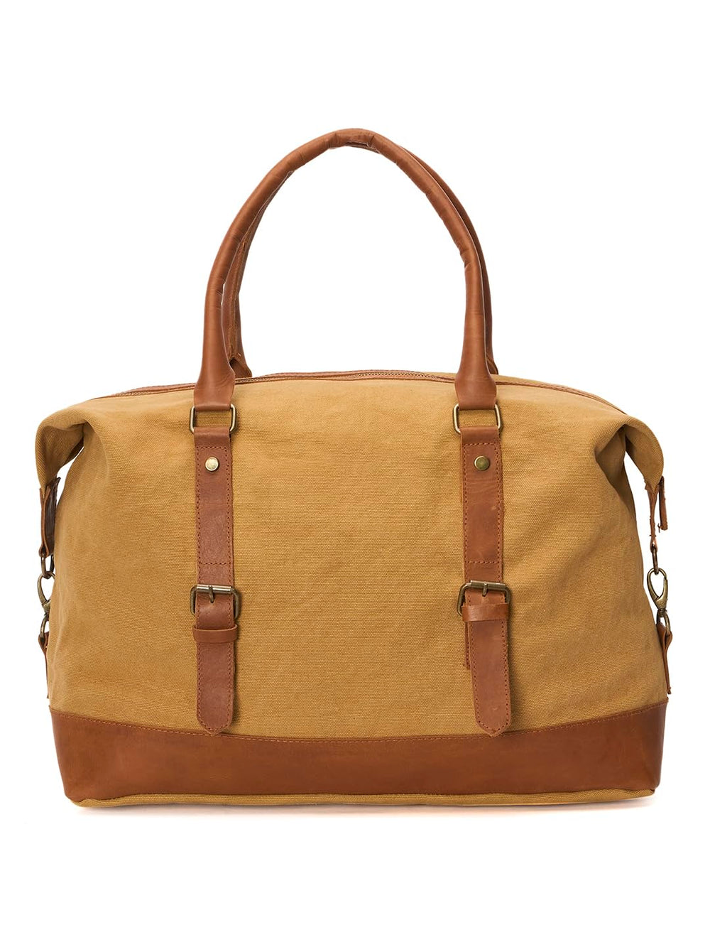 Canvas Leather Weekender Bag, Vintage Travel Duffle with Shoulder Strap, Tan