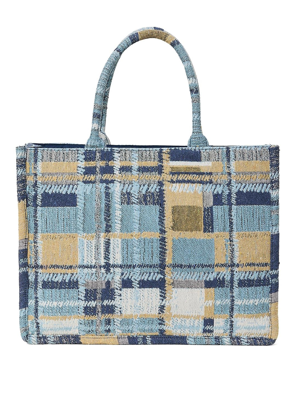 Elevate your style with this chic and versatile hand bag for women. Crafted with intricate woven patterns in shades of blue, beige, and navy, this tote exudes an effortlessly sophisticated aesthetic. The roomy interior provides ample space to accommodate your daily essentials, while the sturdy construction ensures lasting durability. Whether you're heading to the office or a casual outing, this hand bag will add a touch of refined elegance to your ensemble. Dimensions: 35cm x 25cm x 10cm.