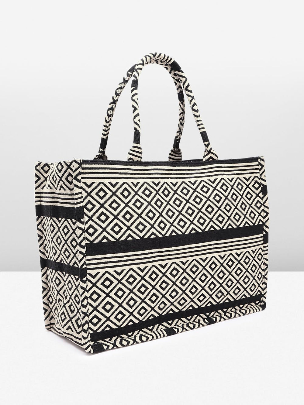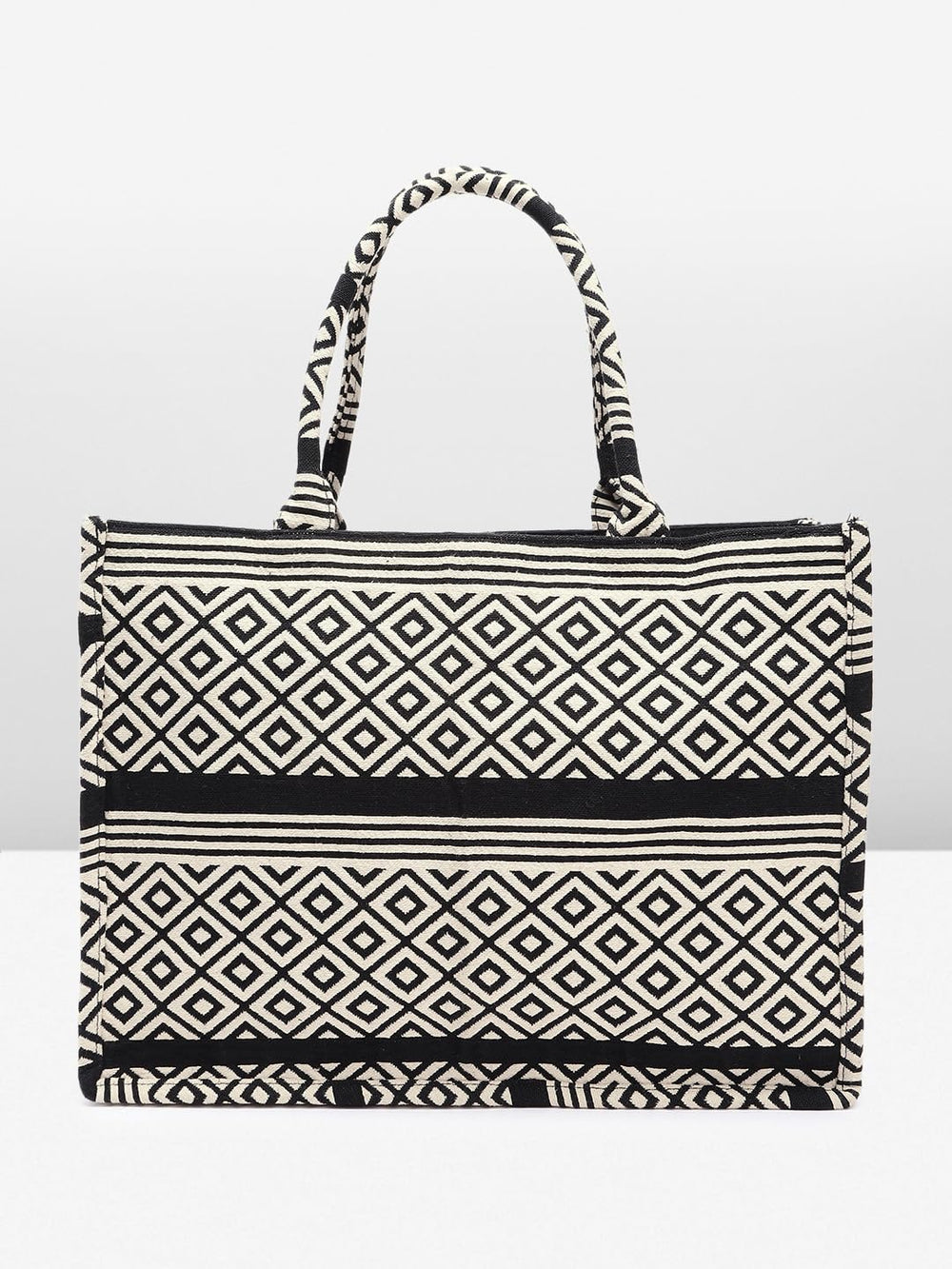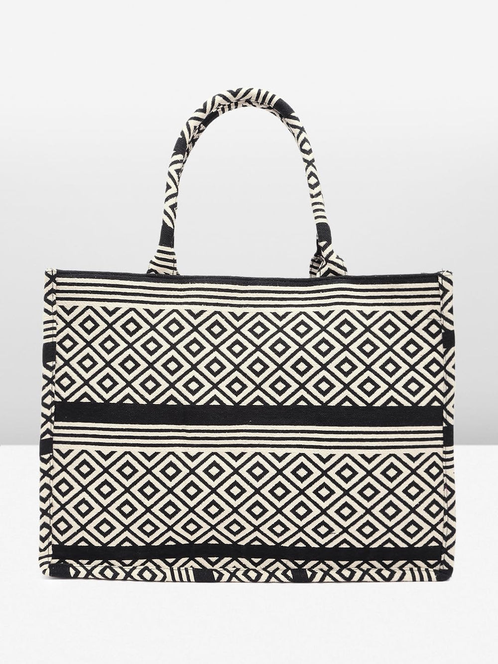 Elevate your style with this chic and versatile handbag. Crafted with a striking black and white geometric diamond pattern, it exudes a timeless elegance that effortlessly complements any outfit. The spacious interior provides ample room for your essentials, while the sturdy construction ensures lasting durability. Featuring a comfortable handle, this bag offers both style and convenience for your daily endeavours. Embrace the perfect fusion of fashion and functionality with this must-have accessory.