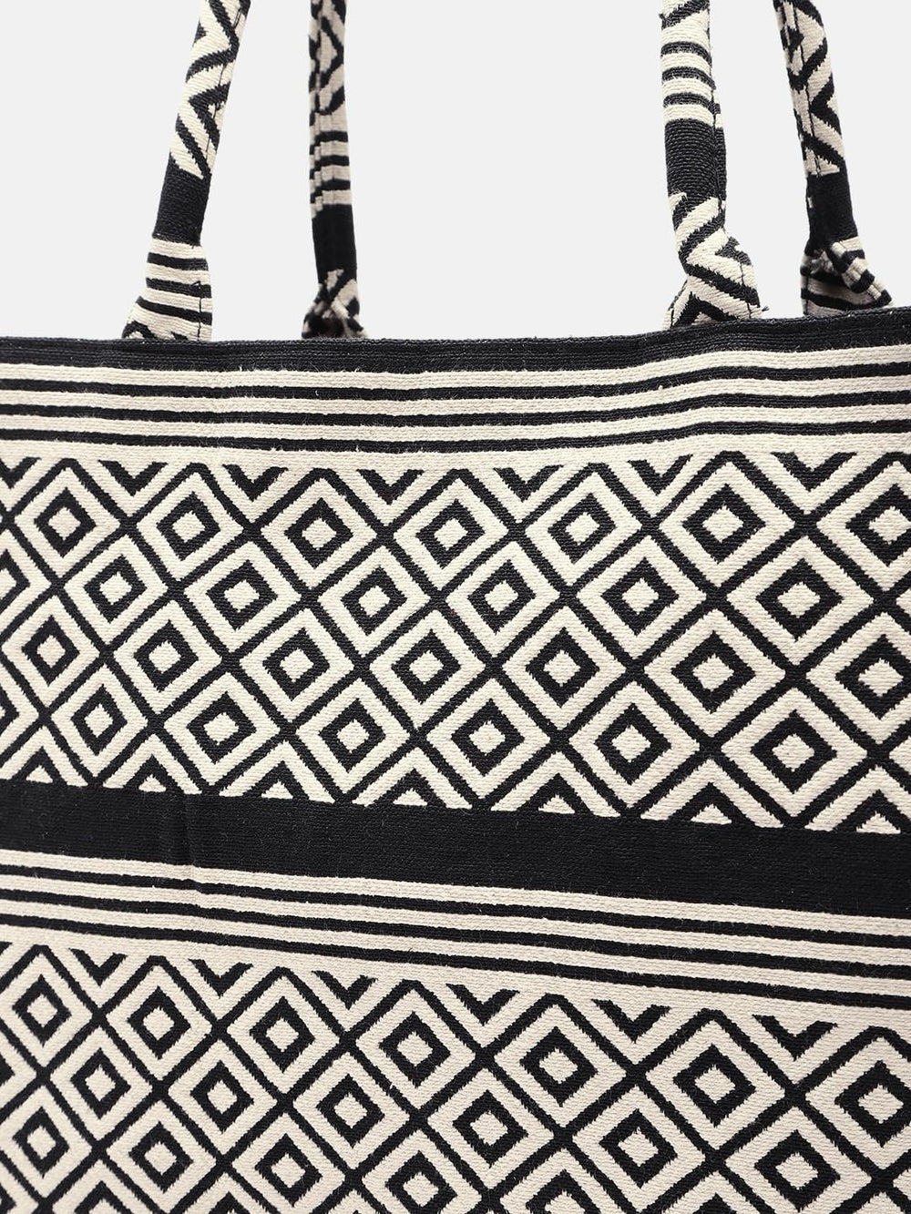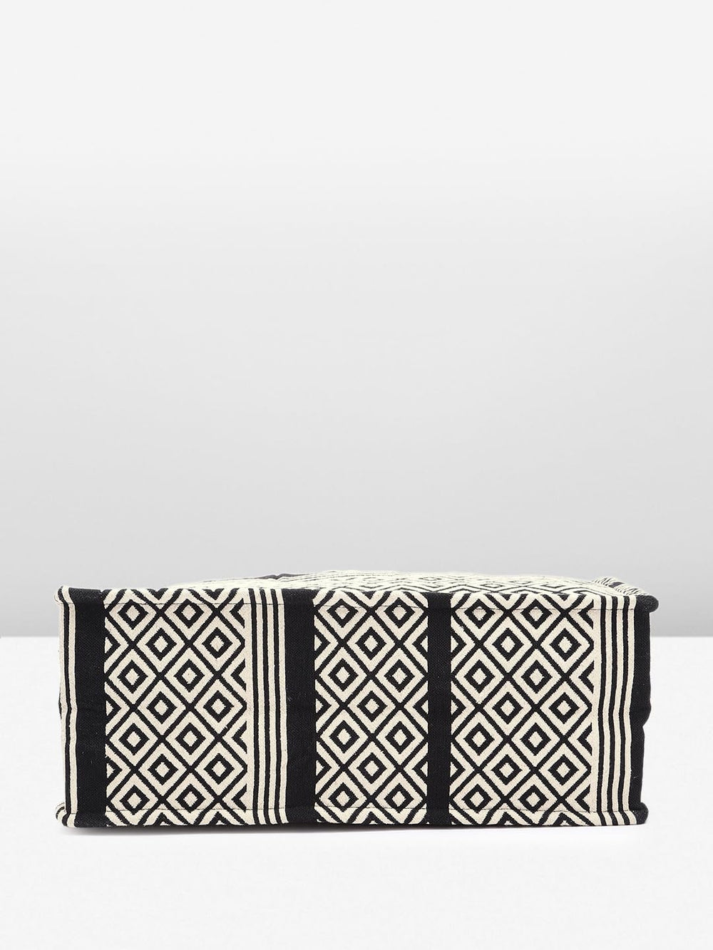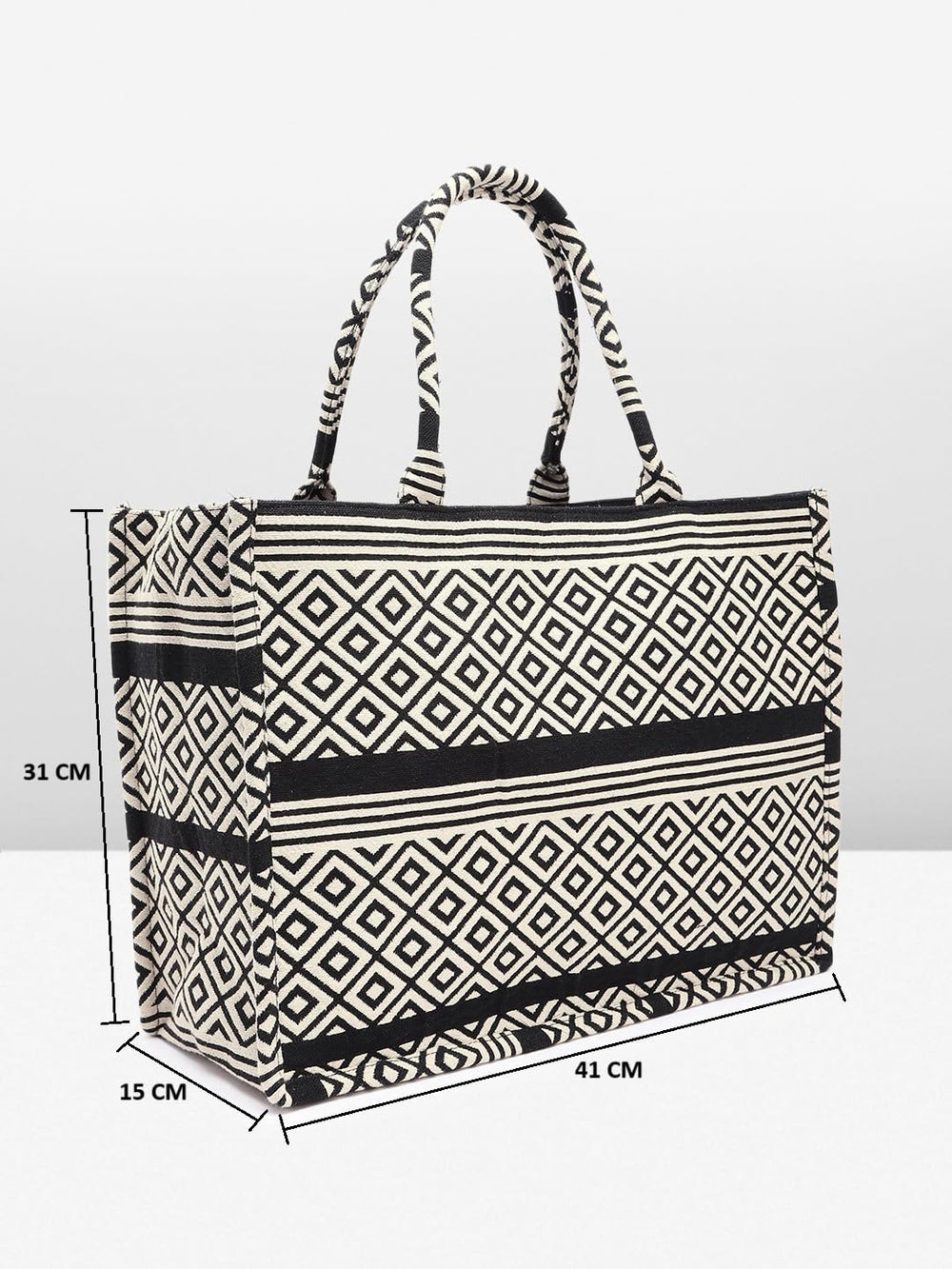 Elevate your style with this chic and versatile handbag. Crafted with a striking black and white geometric diamond pattern, it exudes a timeless elegance that effortlessly complements any outfit. The spacious interior provides ample room for your essentials, while the sturdy construction ensures lasting durability. Featuring a comfortable handle, this bag offers both style and convenience for your daily endeavours. Embrace the perfect fusion of fashion and functionality with this must-have accessory.