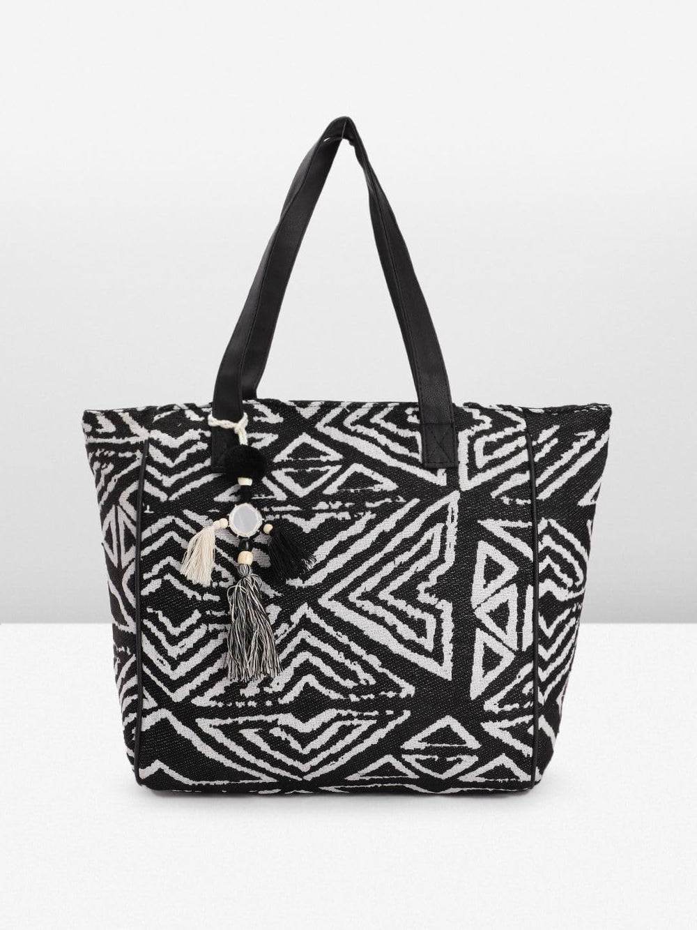 This stylish tote bag is a must-have accessory for the modern woman. Crafted with intricate geometric patterns in black and white, it exudes an effortless bohemian charm. The spacious interior and sturdy construction make it perfect for carrying your daily essentials with ease. Adorned with tasselled embellishments, this bag adds a touch of playfulness to any outfit. Whether you're running errands or heading to the beach, this versatile tote is sure to elevate your look. Embrace the timeless appeal of this chic bag and let it be the statement piece that complements your personal style.