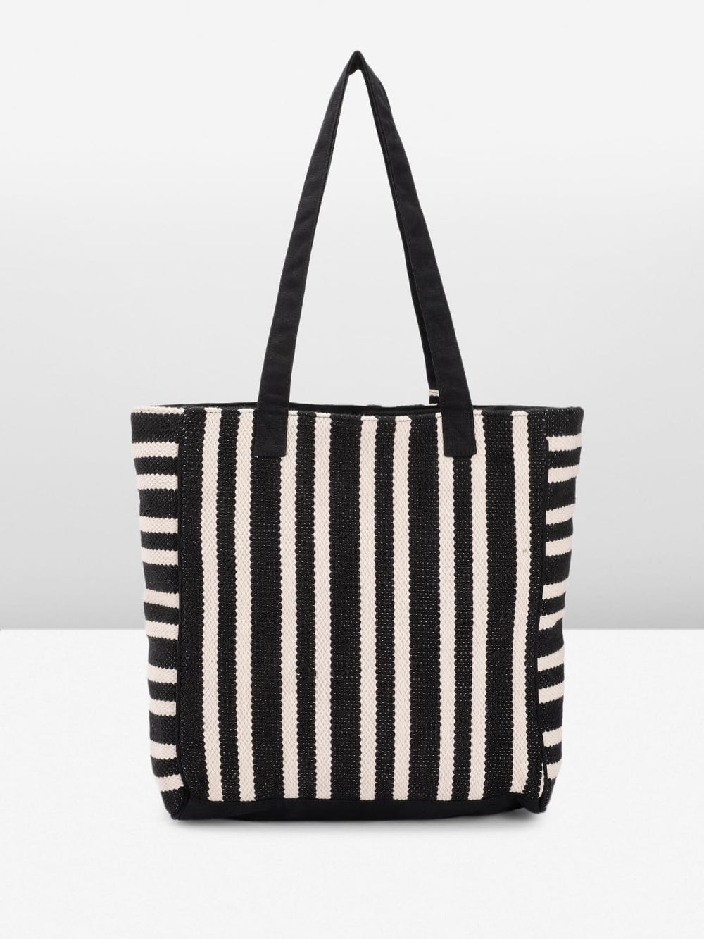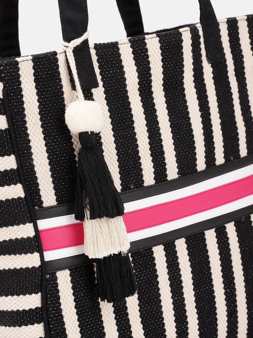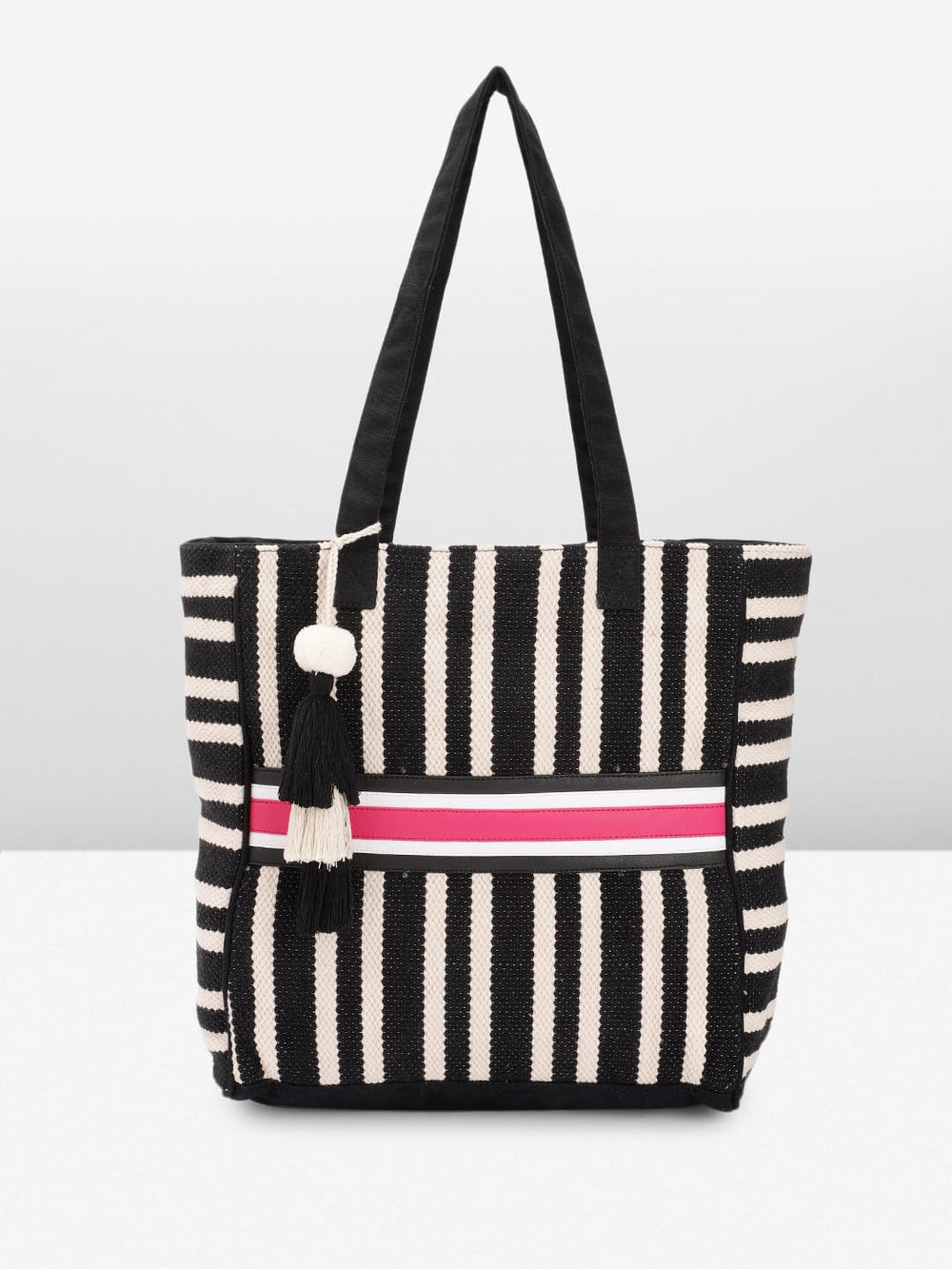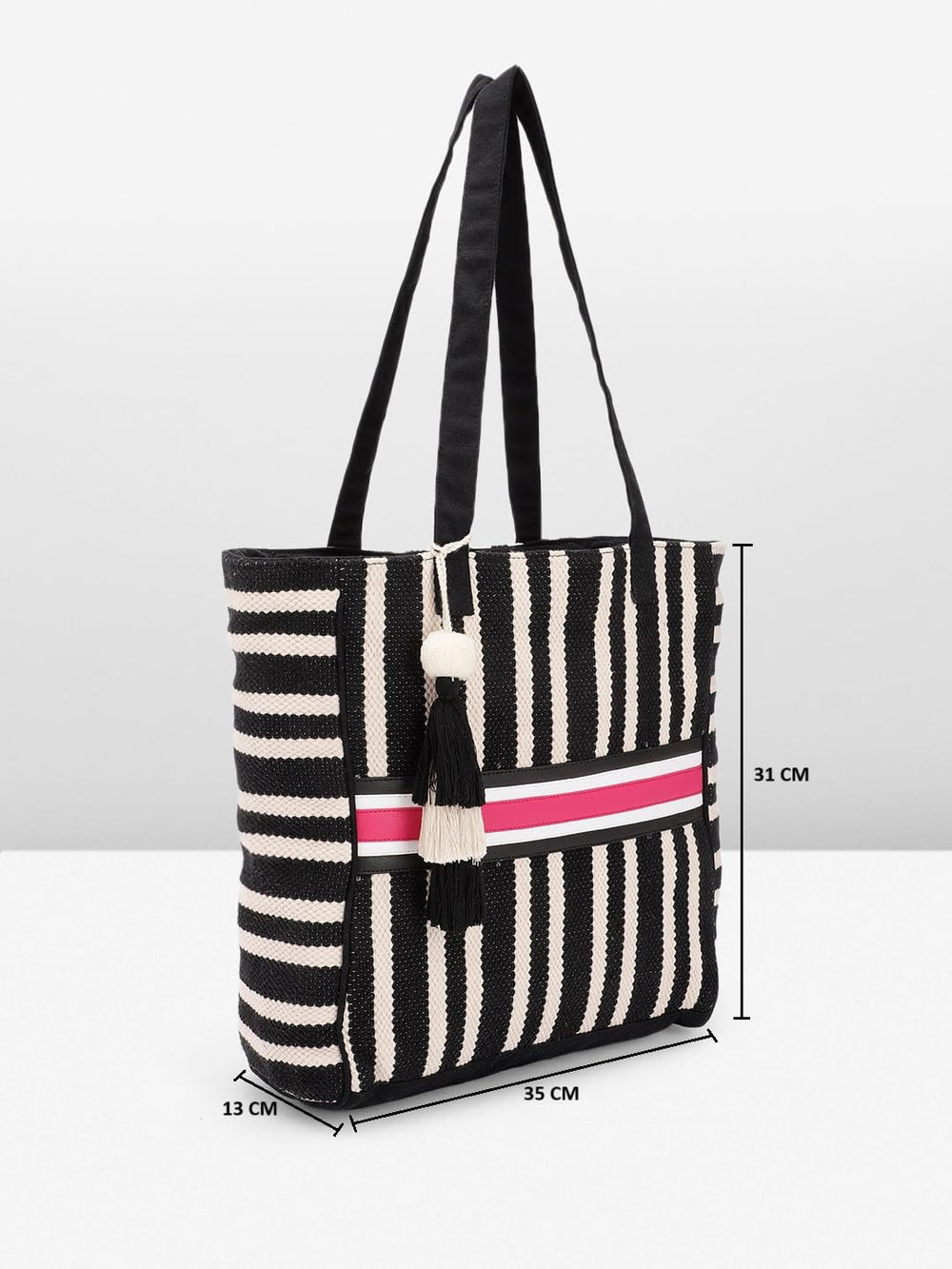 This chic and stylish tote bag is a must-have accessory for the modern woman. Crafted from high-quality materials, it boasts a striking black and white striped pattern that exudes timeless elegance. The spacious interior offers ample room for your daily essentials, while the sturdy handles ensure comfortable carrying. Adorned with playful tassels and a pop of vibrant colour, this bag seamlessly blends fashion and functionality. Whether you're running errands or attending a casual gathering, this versatile tote will effortlessly elevate your ensemble. Embrace the perfect blend of sophistication and practicality with this trendsetting bag.