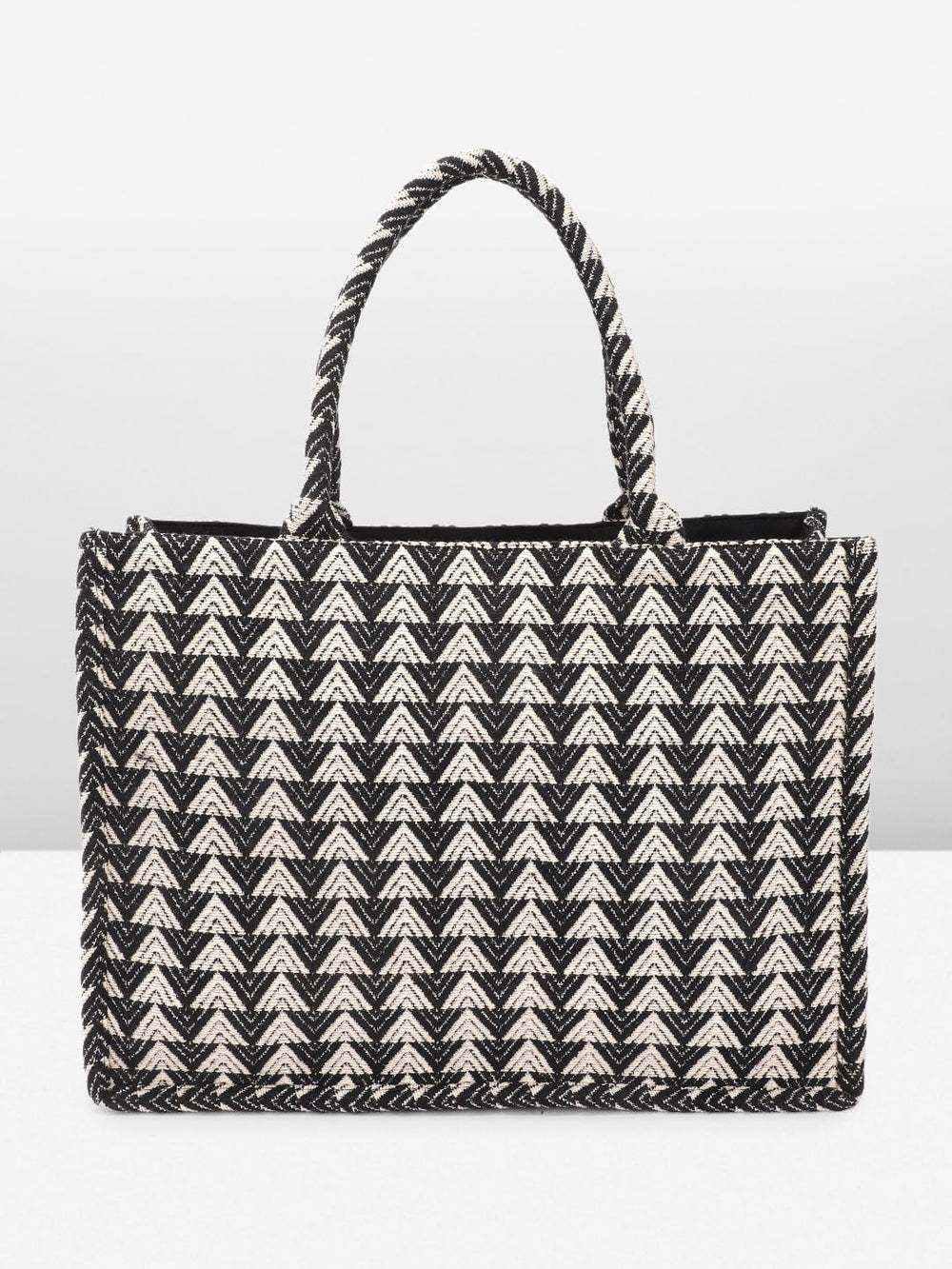 This stylish and versatile hand bag is a true statement piece. The striking chevron pattern in contrasting black and beige hues creates a bold, eye-catching look. Crafted with meticulous attention to detail, the bag features a sturdy woven construction that ensures durability and longevity. Its spacious interior offers ample room for all your essentials, making it perfect for everyday use or special occasions. The comfortable shoulder strap allows for effortless carrying, while the sleek design adds a touch of sophistication to any ensemble. Elevate your style with this chic and functional hand bag.