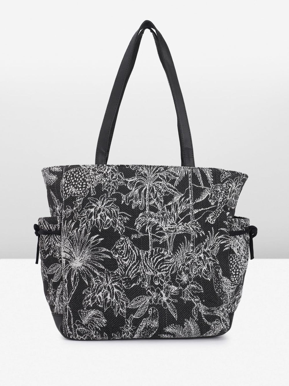 This stylish tote bag is a versatile and practical accessory that combines fashion and functionality. Crafted with a striking black and white tropical print, it features a spacious interior perfect for carrying your daily essentials. The bag's sturdy construction and durable handles ensure long-lasting use, while its sleek design adds a touch of sophistication to any outfit. Whether you're running errands or heading to the office, this tote bag is a chic and convenient choice that will elevate your look. With its ample space and eye-catching pattern, it's a must-have addition to your accessory collection.