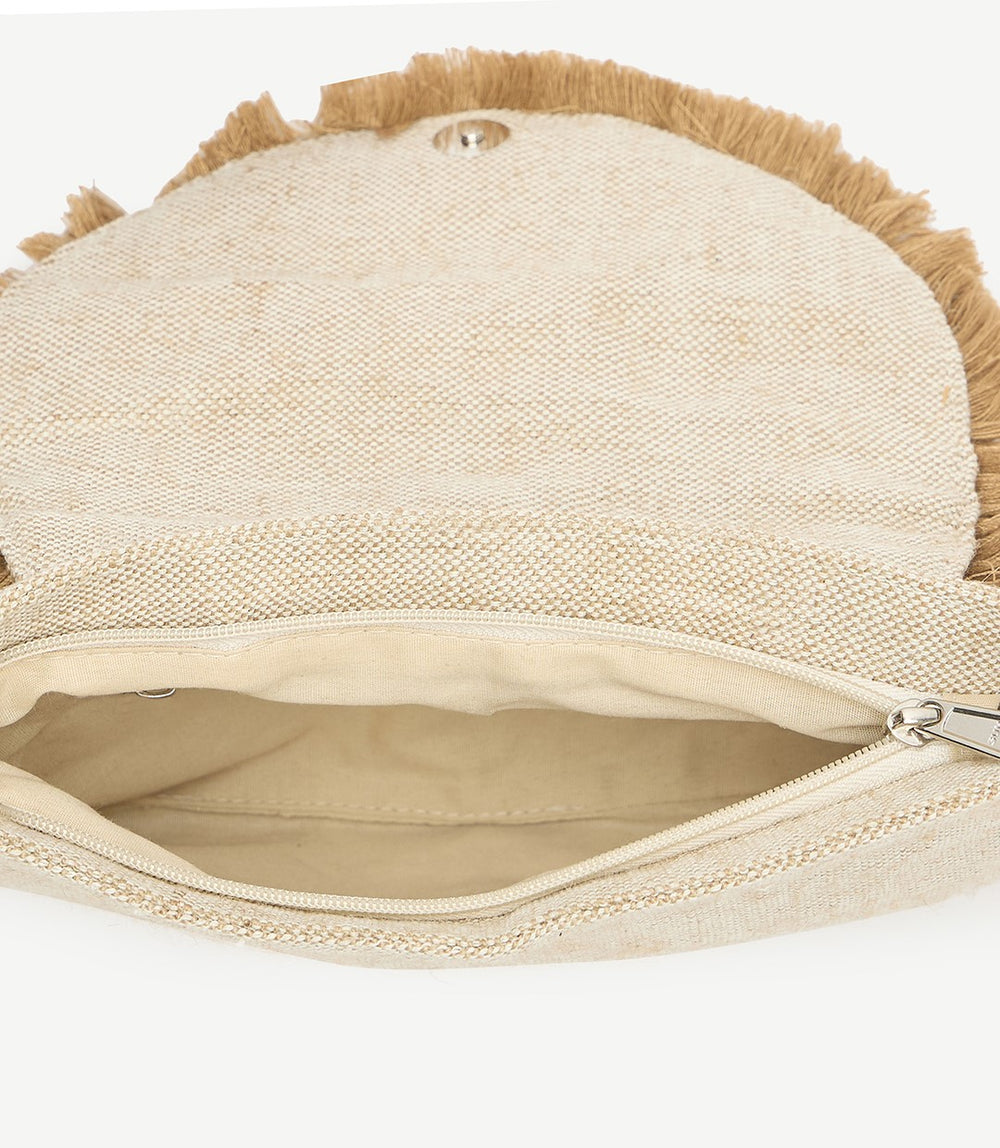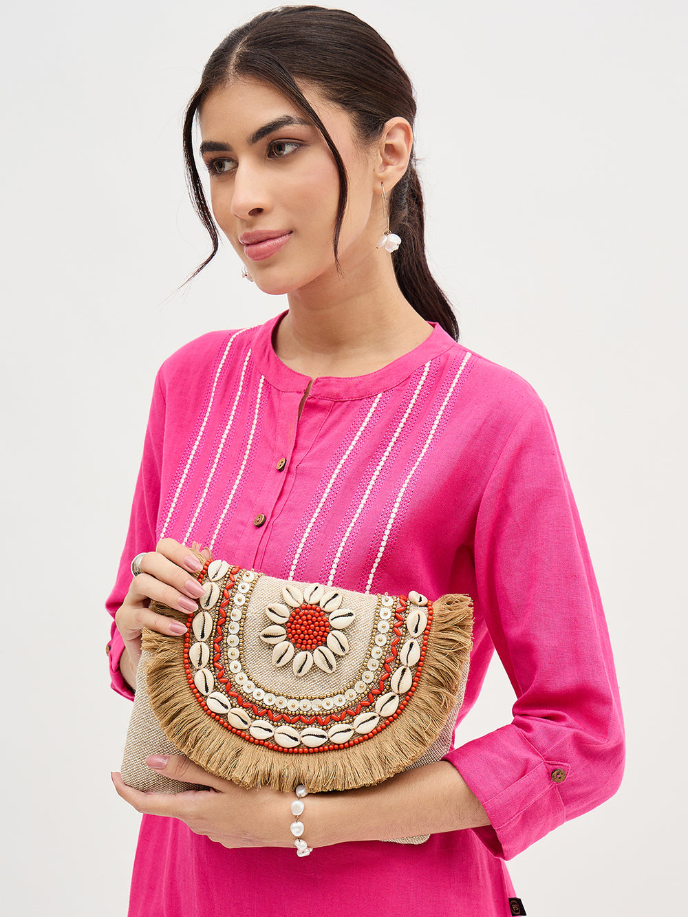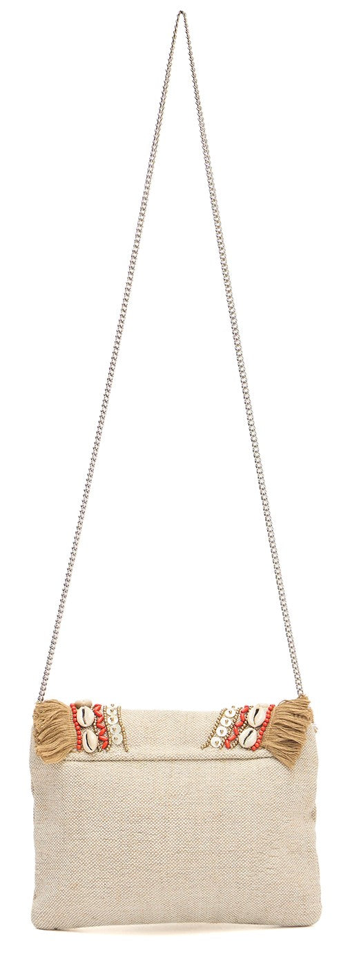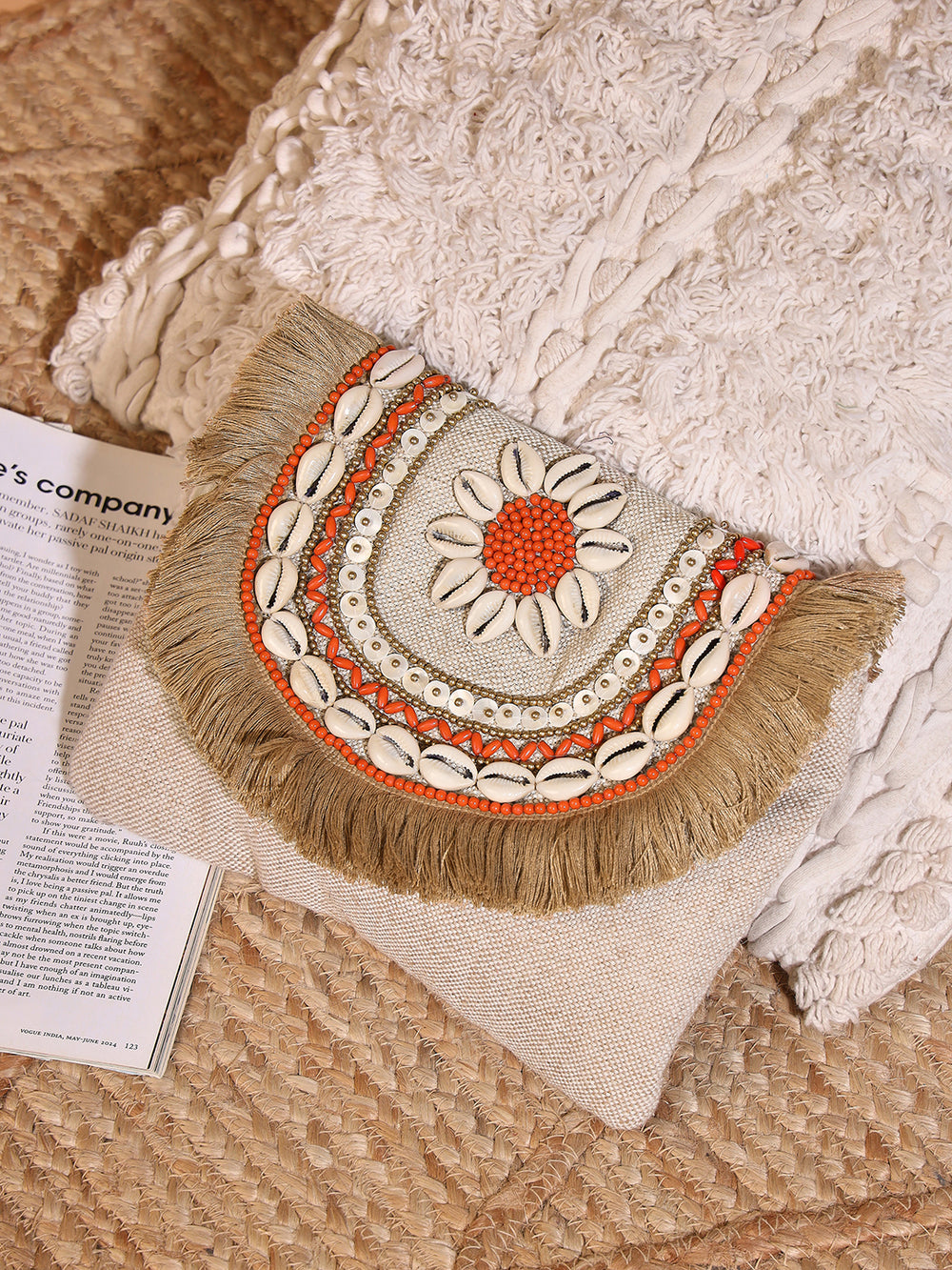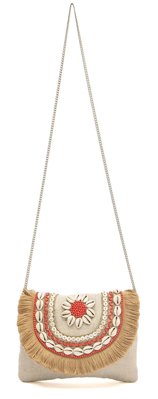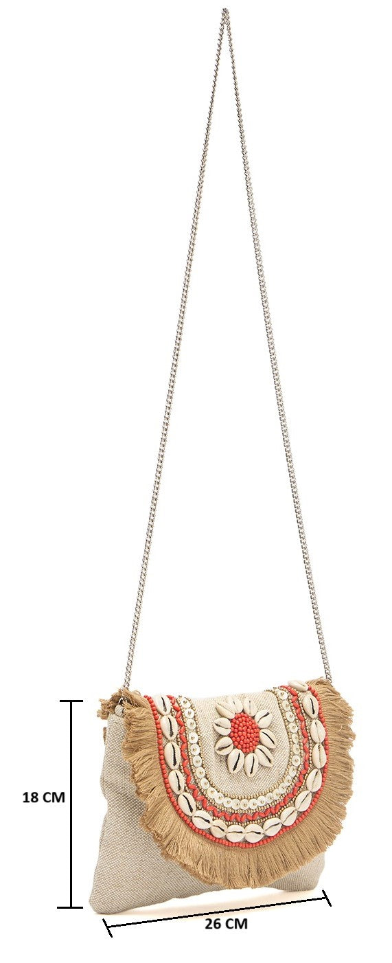 • DESIGN ELEMENTS: Beautiful bohemian-style crossbody bag featuring decorative shells, coral beading, and natural fringe details on a beige canvas base