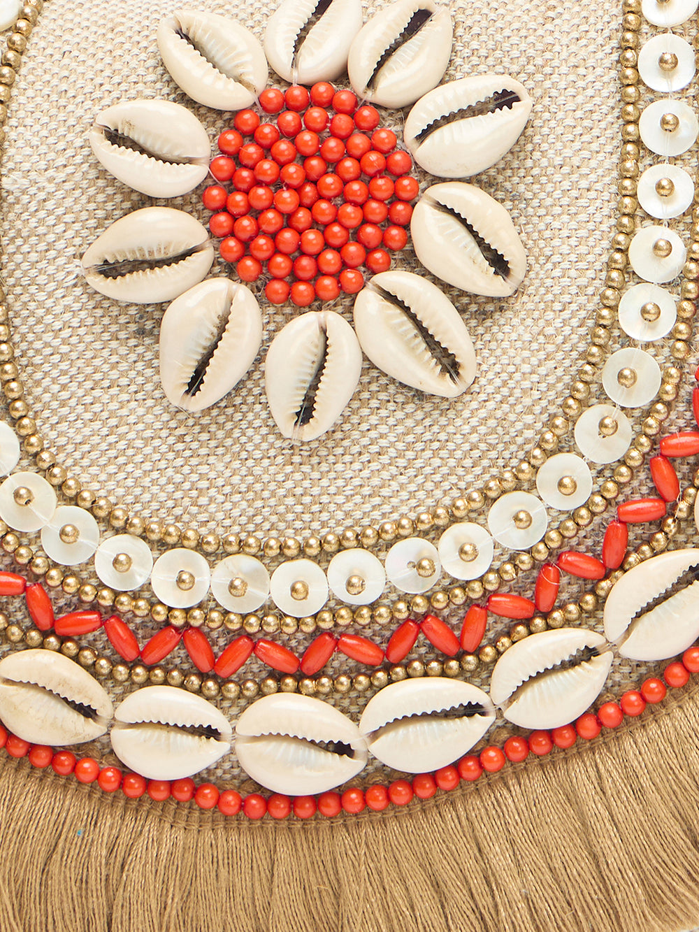 • STATEMENT PIECE: Eye-catching sunburst pattern centred with coral beading, surrounded by intricate shell embellishments and fringe trim