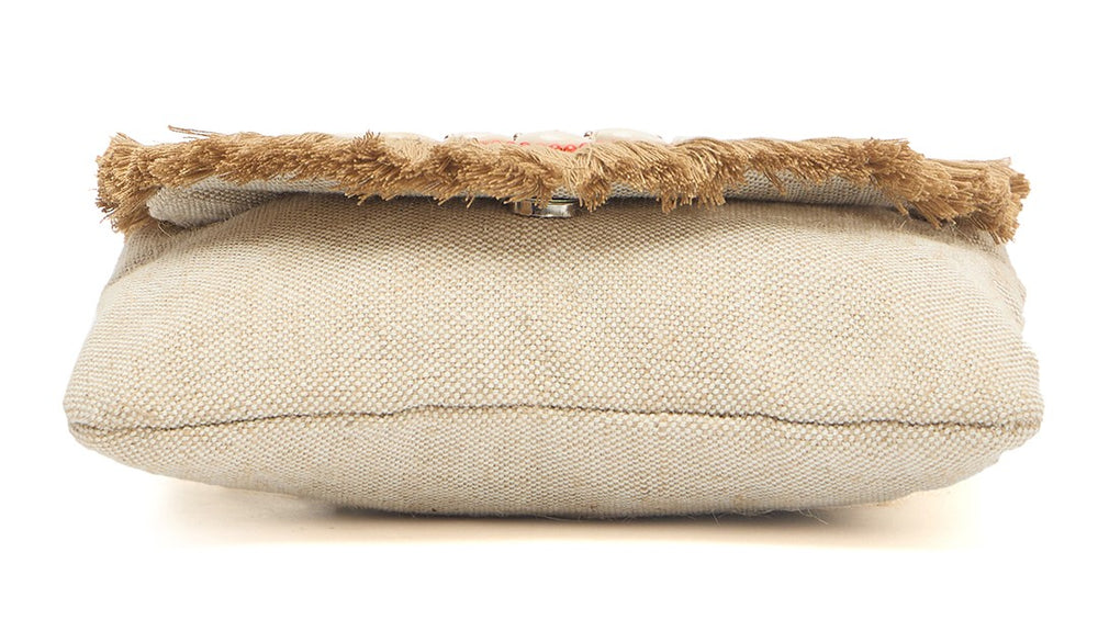 PRIMROSE Bohemian Crossbody Bag with Shell Fringe, Beige Canvas with Coral Beading, Chain Strap