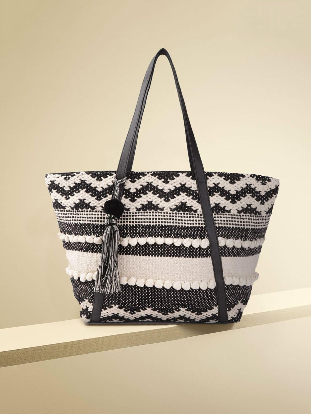 Elevate your style with this chic and trendy tote bag for women. Crafted with meticulous attention to detail, this bag boasts a striking black and white geometric pattern that exudes sophistication. The woven design showcases the artistry of skilled craftspeople, creating a visually stunning accessory. Spacious and versatile, this tote effortlessly accommodates your daily essentials, making it an ideal companion for work, travel, or casual outings. With its durable construction and tassel accents, this bag seamlessly blends fashion and functionality. Embrace the allure of this stylish tote and add a touch of elegance to your ensemble.