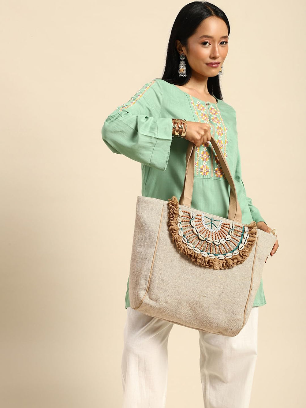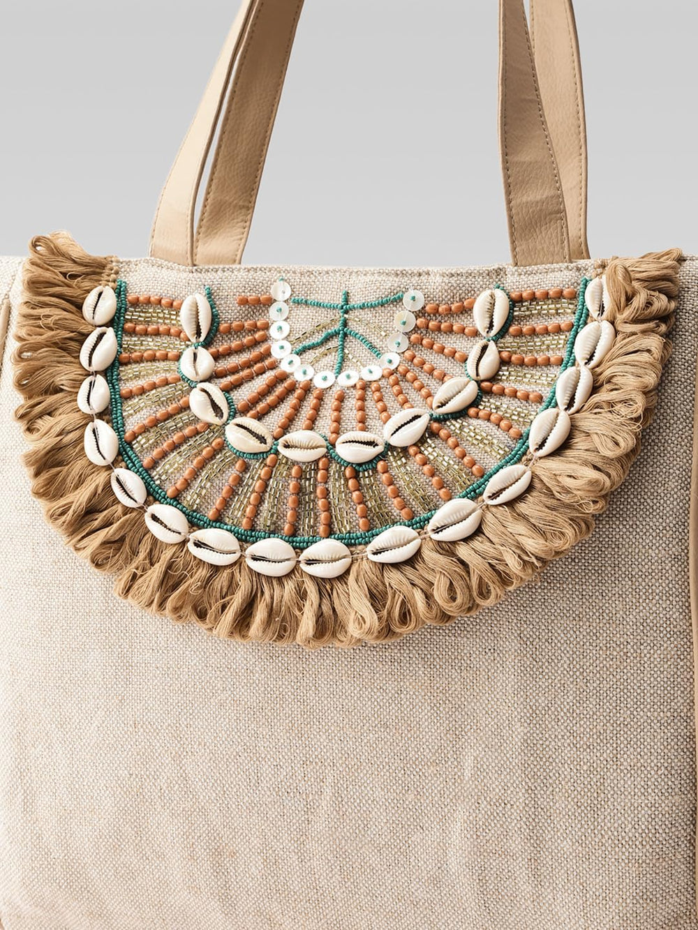 Step into summer with this charming boho-inspired beach tote bag that perfectly captures the free-spirited essence of seaside style. The natural beige canvas construction offers durability and spaciousness for all your beach essentials, while the stunning shell embellishments create an eye-catching fan pattern that draws admiring glances. Delicate fringe detailing adds movement and texture, complementing the artisanal arrangement of shells and decorative elements in teal and brown tones. The comfortable shoulder straps ensure easy carrying, whether you're heading to the beach or browsing local markets. This versatile tote combines practical design with artistic craftsmanship, making it an ideal companion for both casual outings and holiday adventures. The neutral colour palette ensures it pairs beautifully with any summer ensemble, while the roomy interior provides ample space for your belongings. Each bag showcases unique handcrafted details that celebrate the beauty of coastal-inspired accessories.