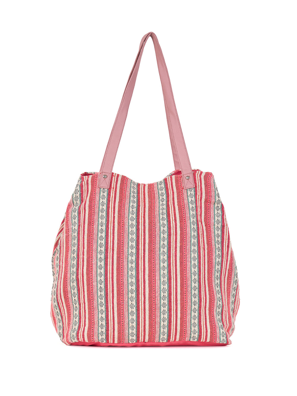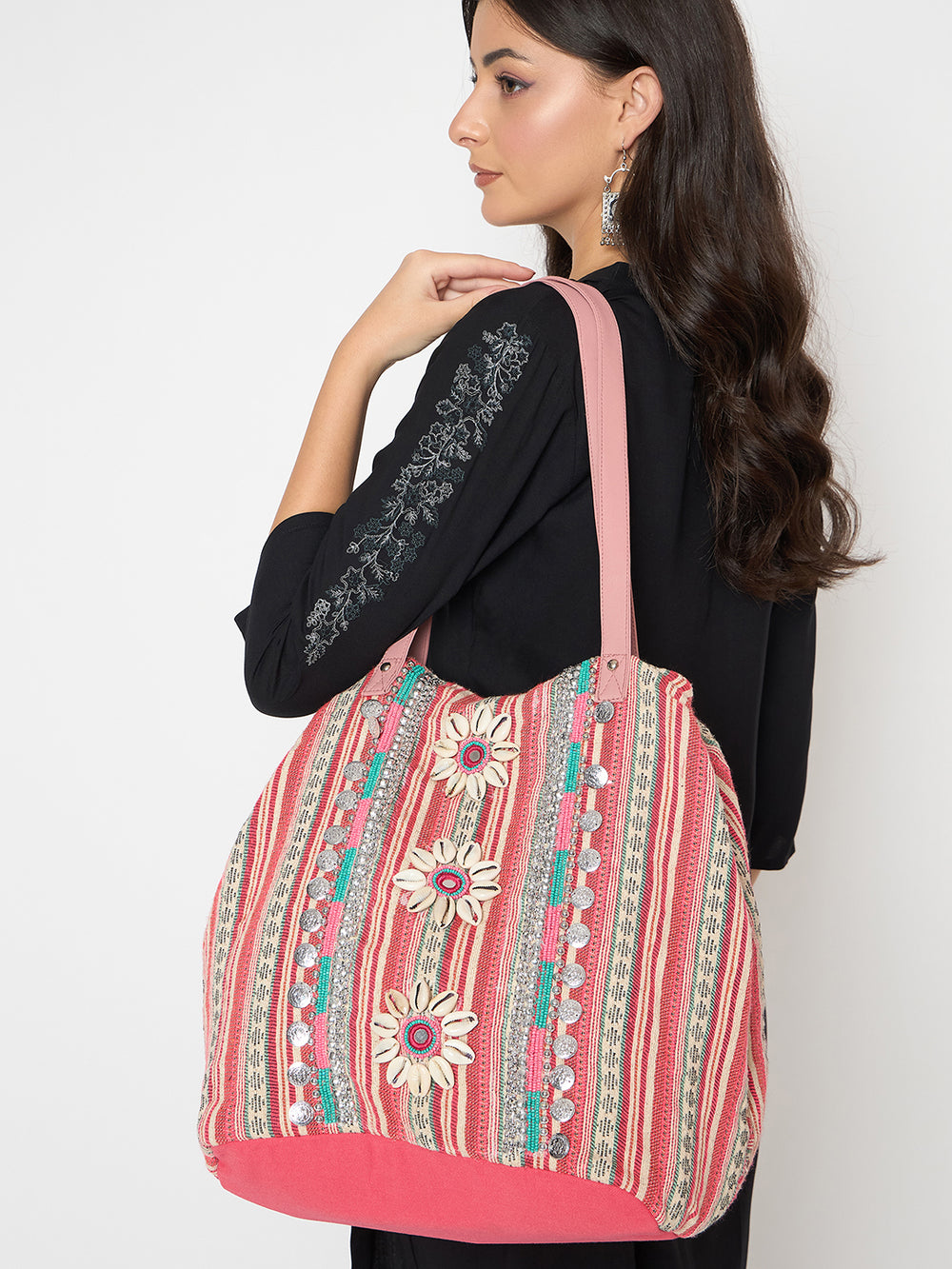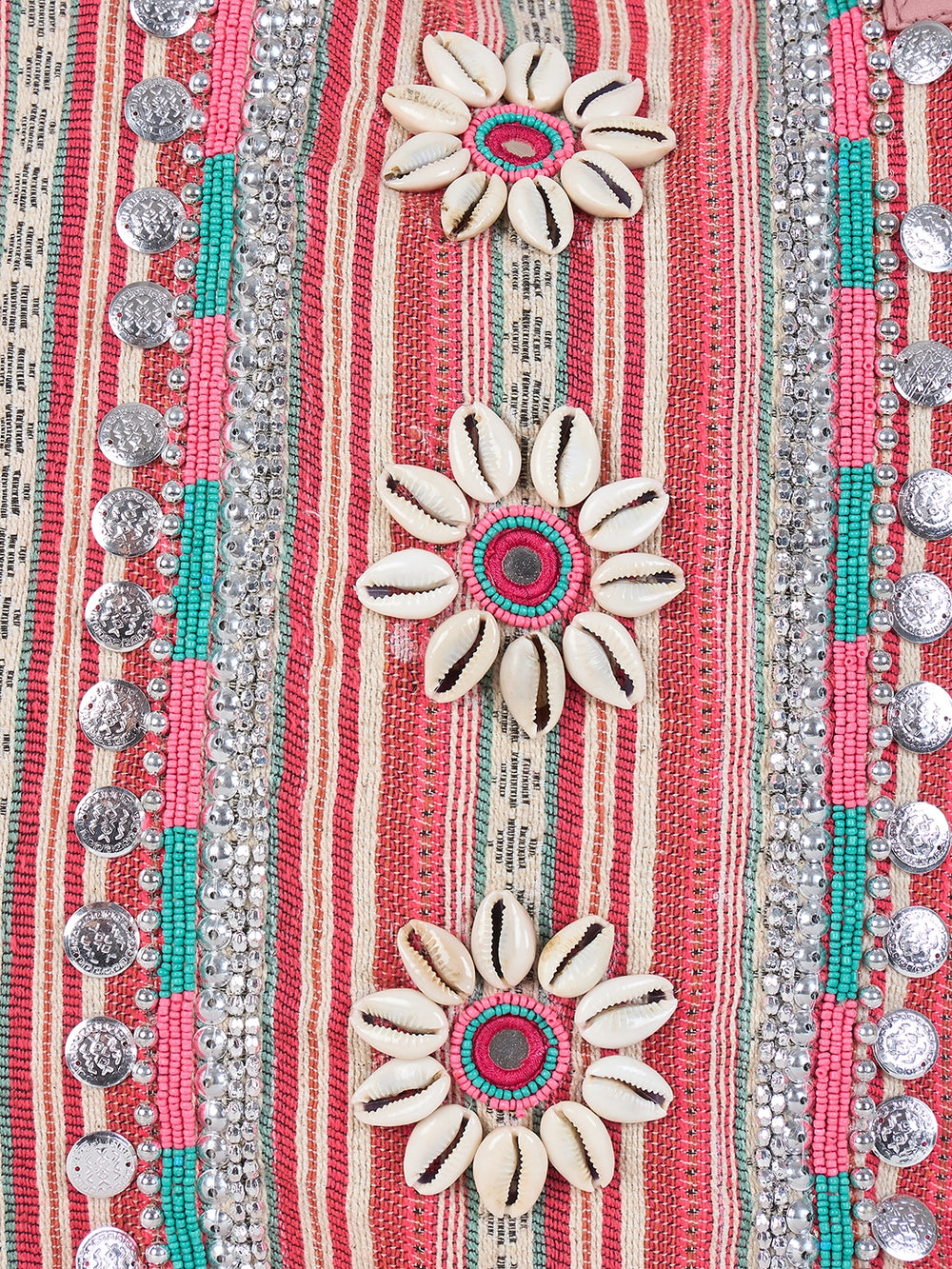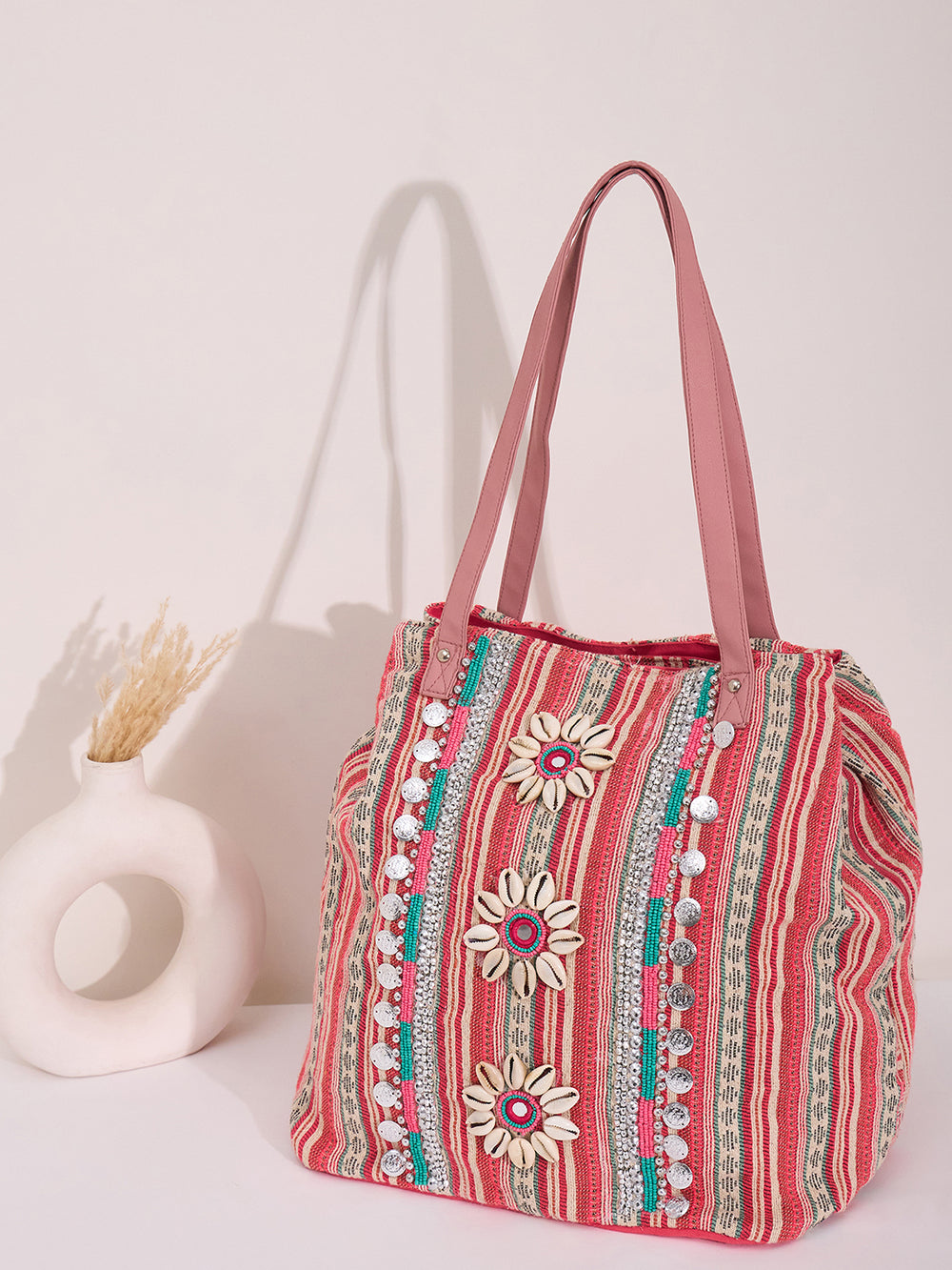 PRIMROSE Boho Beach Tote Bag, Pink Striped with Shell Flowers, Turquoise Accents, Sequin Details