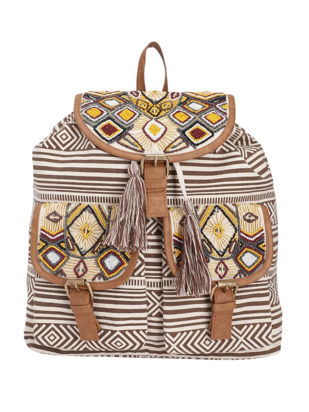 Make a bold fashion statement with this stunning bohemian backpack that perfectly blends style and functionality. The eye-catching design features intricate beaded geometric patterns in vibrant yellow, burgundy, and white, set against a sophisticated brown and white striped canvas background. The flap closure and front pockets are adorned with beautiful beadwork in diamond motifs, creating an artistic focal point. Elegant grey tassels add a playful touch while complementing the ethnic aesthetic. The backpack is crafted with durable canvas material and enhanced with brown leather-look trim and adjustable straps for comfort. Two front pockets with buckle closures provide convenient storage, while the spacious main compartment ensures ample room for your essentials. Whether you're heading to university, travelling, or simply running errands, this versatile backpack combines bohemian charm with practical design. The unique combination of geometric prints and beaded embellishments makes it a perfect accessory for those who appreciate artisanal details and distinctive style.