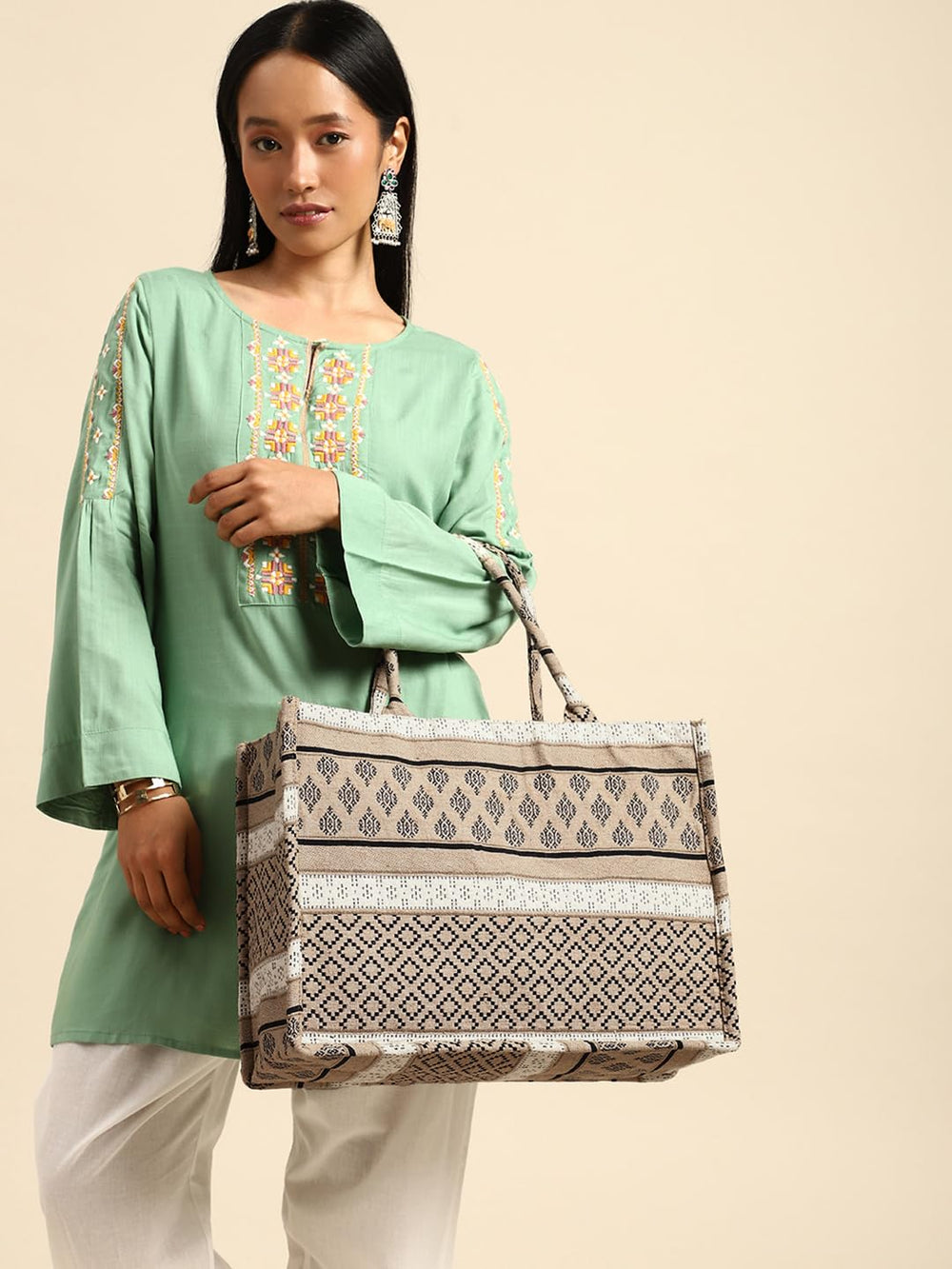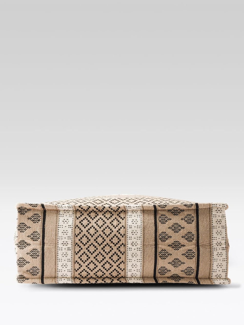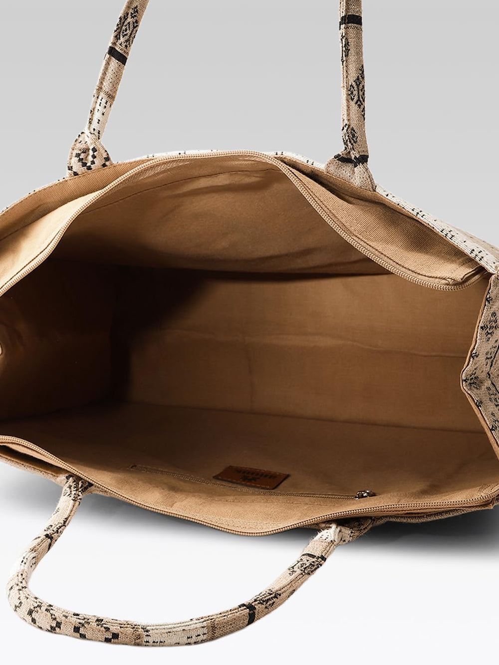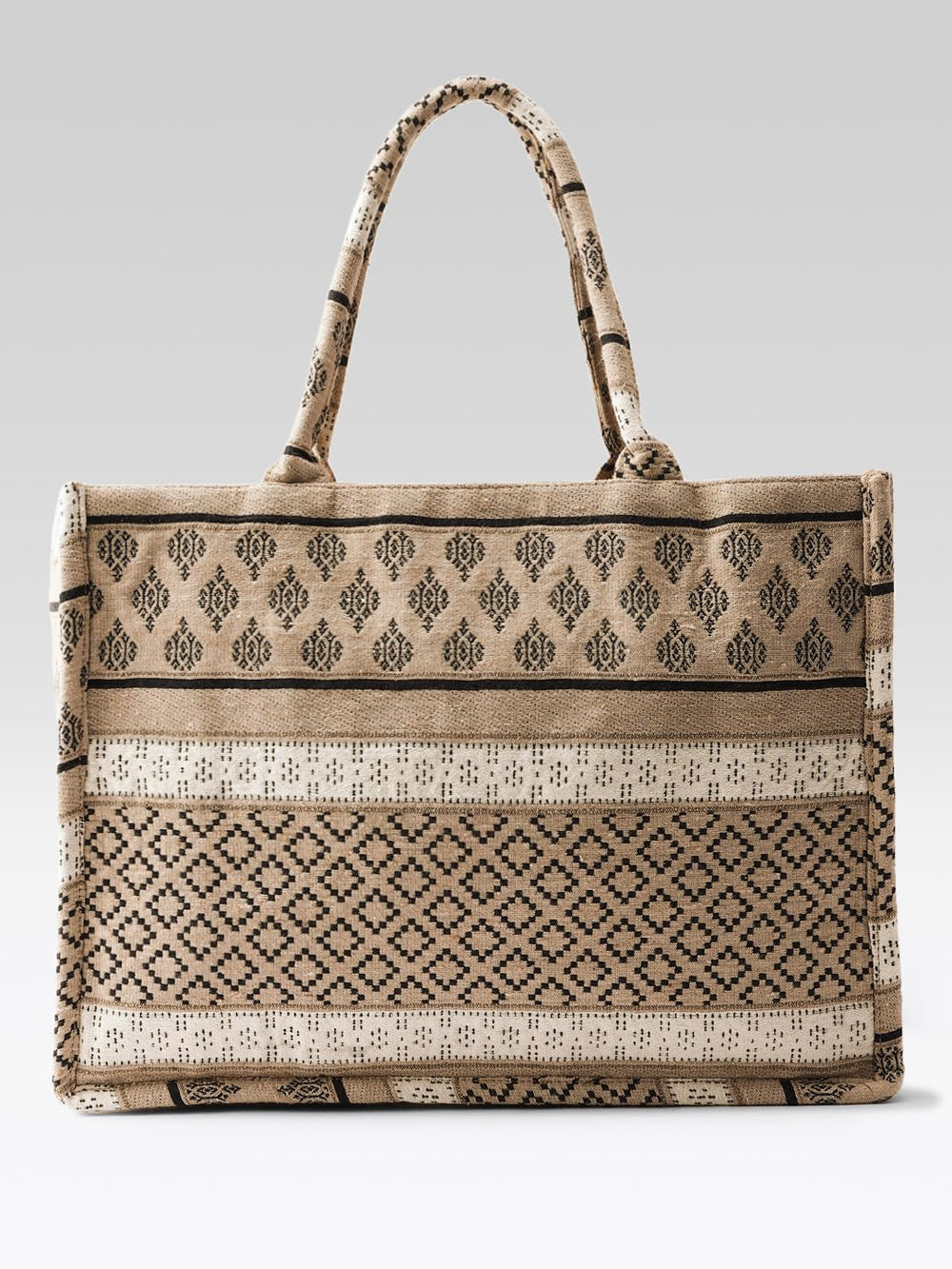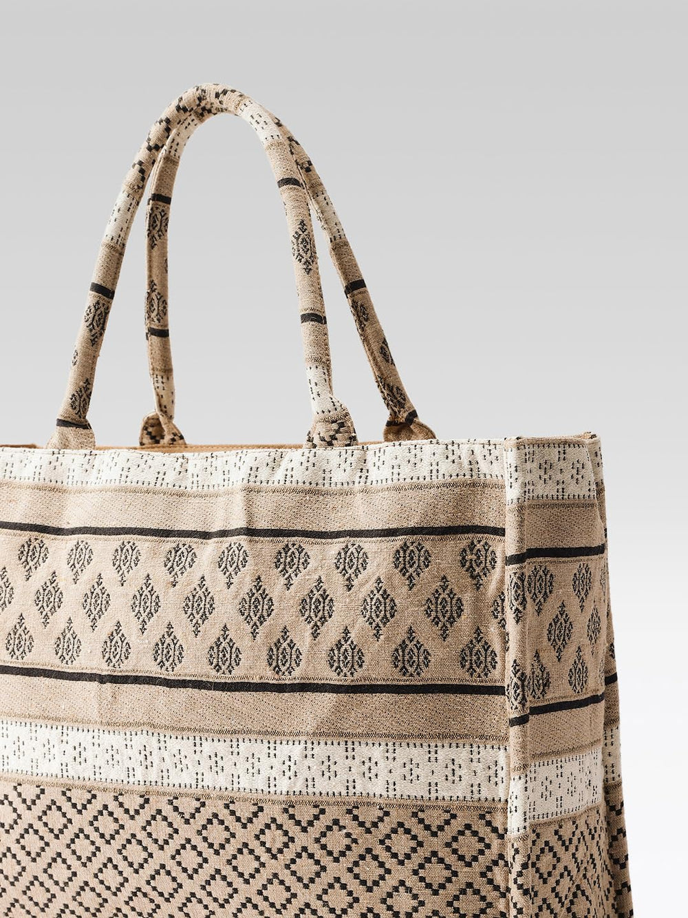 Elevate your everyday style with this beautifully crafted canvas tote bag featuring an enchanting geometric pattern in beige and black. The sophisticated design combines traditional motifs with contemporary aesthetics, showcasing intricate diamond patterns and elegant ornamental bands. This spacious tote is perfect for daily essentials, shopping trips, or casual outings. The durable canvas construction ensures longevity, while the comfortable shoulder straps make it easy to carry your belongings. The neutral colour palette makes it versatile enough to complement any outfit, from casual to semi-formal. The bag's generous size provides ample space for your daily necessities, books, or shopping items. Its striking pattern adds a bohemian touch to your ensemble while maintaining a refined appearance. The structured design helps the bag maintain its shape, making it both practical and stylish. Perfect for the fashion-conscious individual who values both functionality and aesthetic appeal in their accessories.