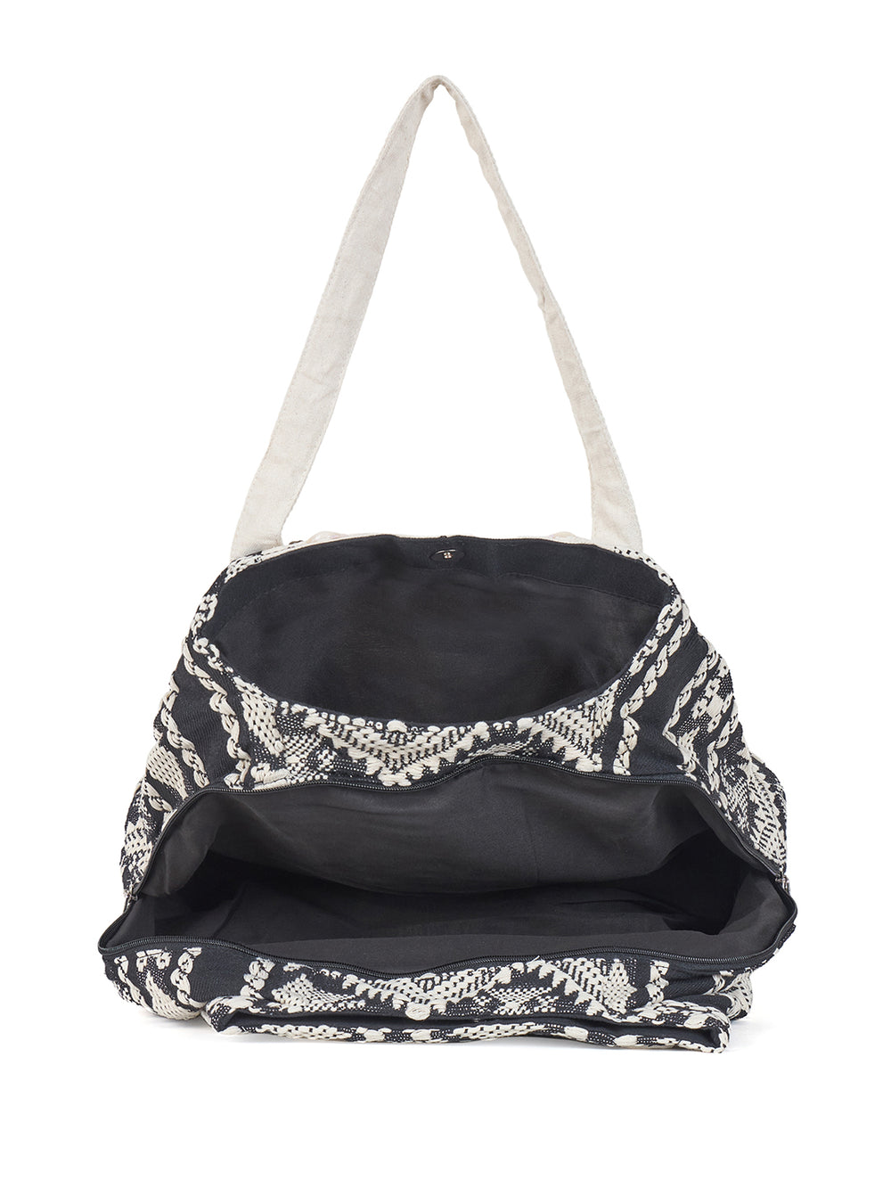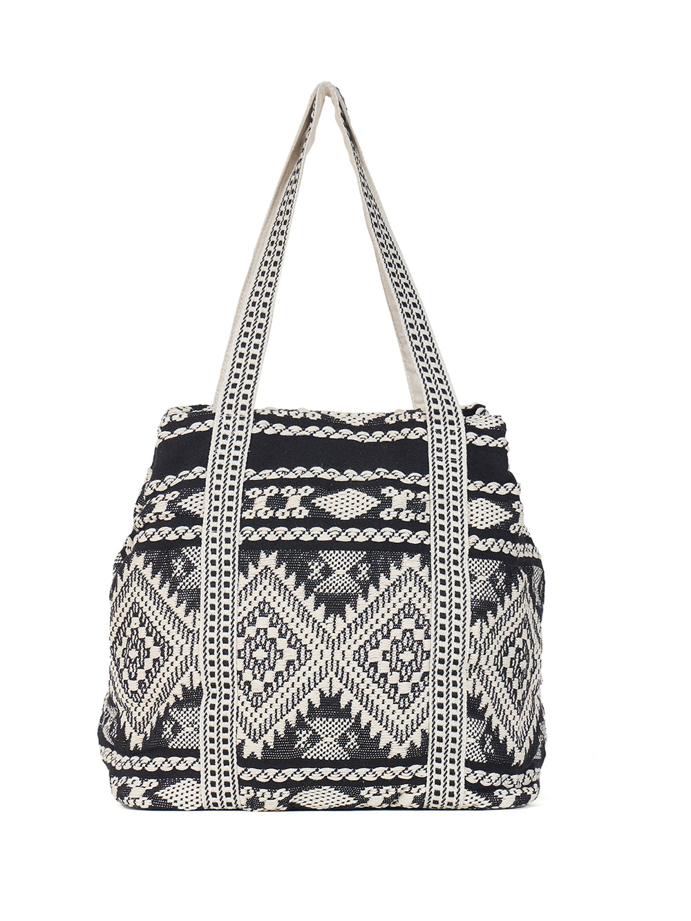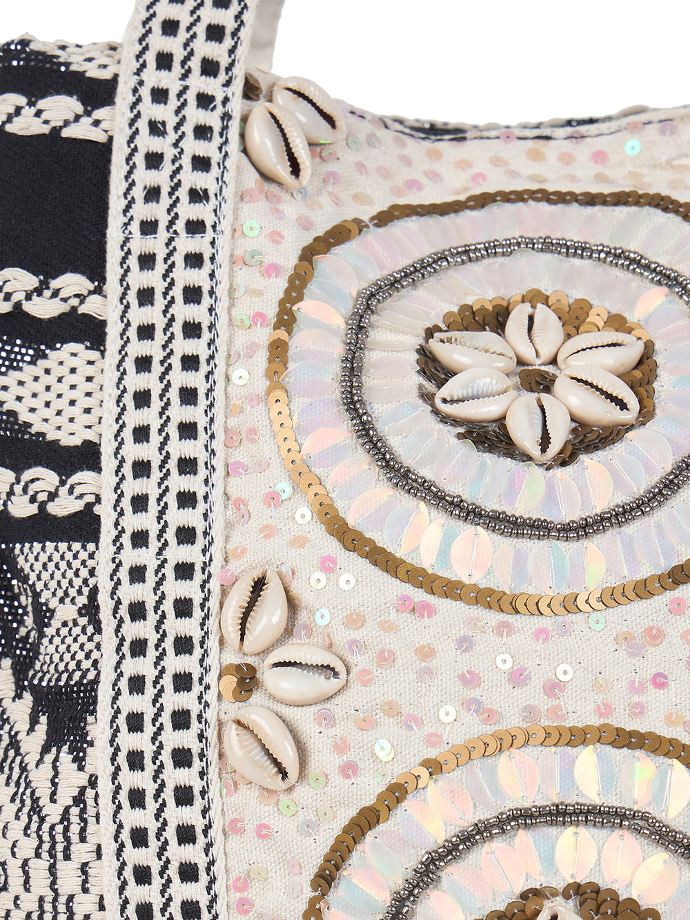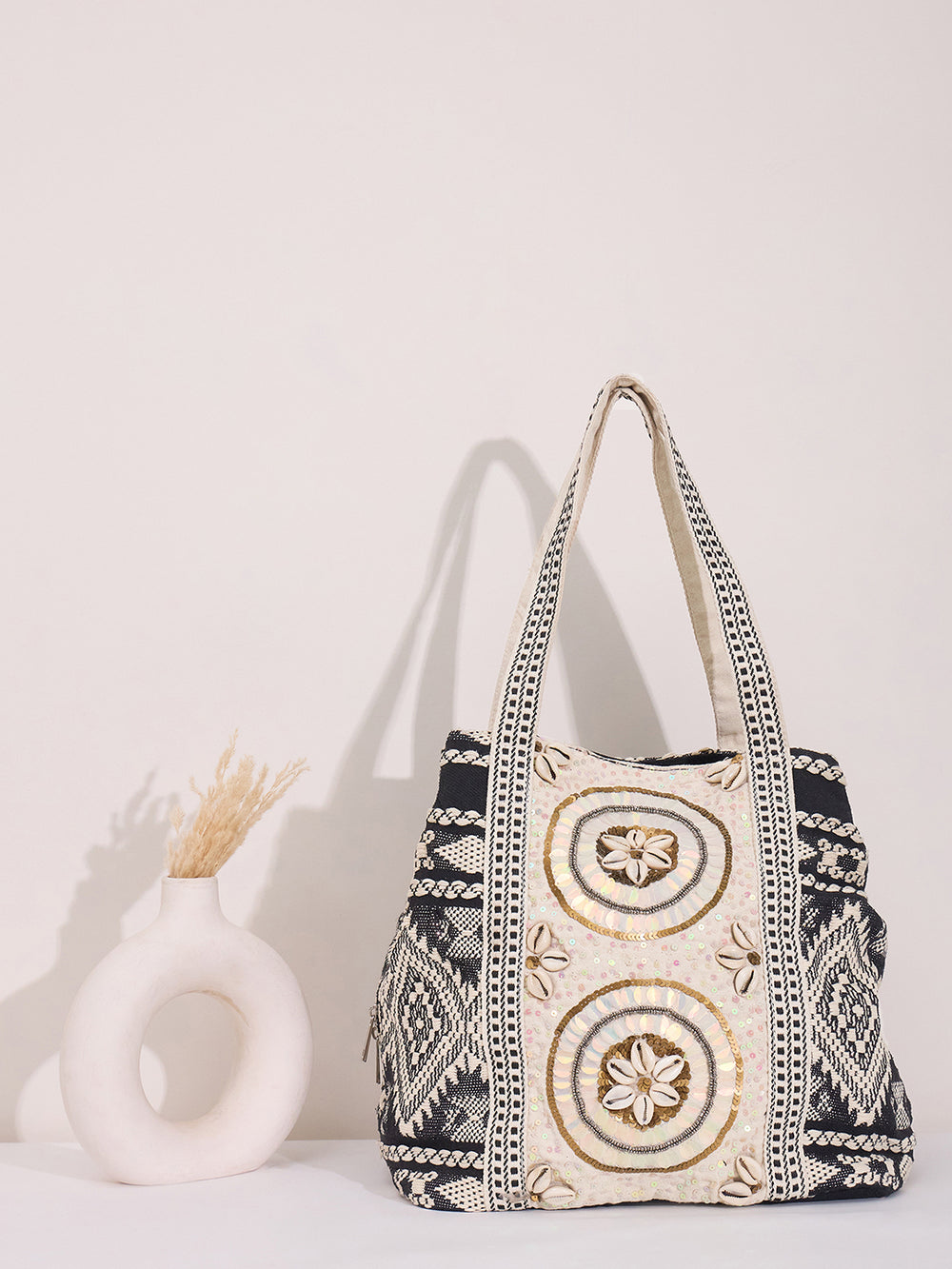 • DESIGN FEATURES: Beautifully crafted tote bag featuring black and white geometric patterns with intricate shell medallion embroidery on a cotton canvas base