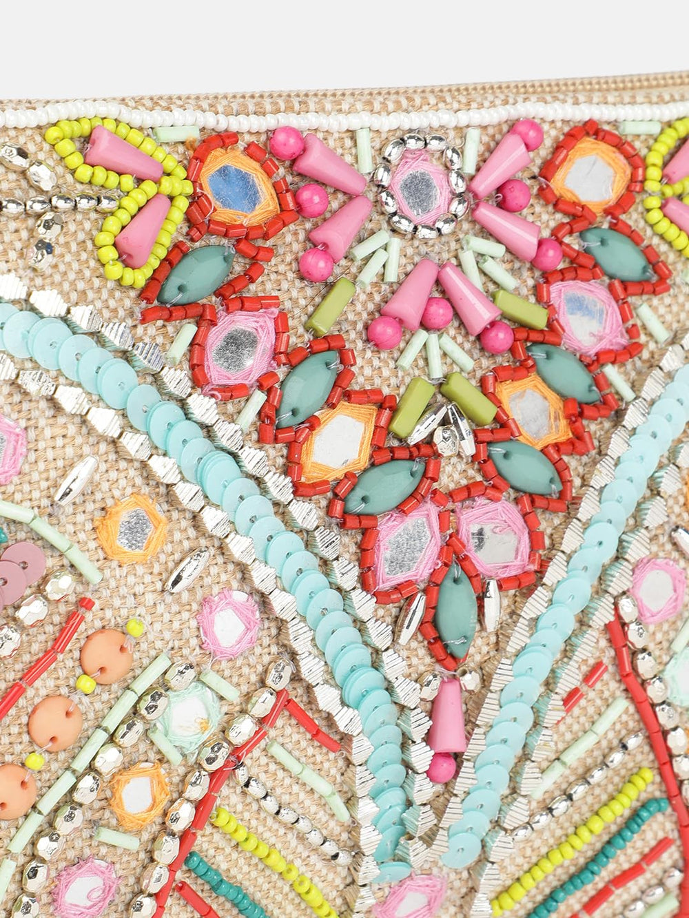 Elevate your style with this exquisite handcrafted clutch purse, a true masterpiece of intricate beadwork and vibrant colours. Meticulously crafted by skilled artisans, each bead is carefully placed to create mesmerising patterns and designs that showcase the rich cultural heritage. The eye-catching tassels add a playful touch, while the spacious interior provides ample room for your essentials. This clutch is not just an accessory; it's a statement piece that effortlessly blends tradition with contemporary fashion. Whether you're attending a festive occasion or simply seeking to add a pop of colour to your ensemble, this clutch will undoubtedly turn heads and leave a lasting impression. Embrace the beauty of handcrafted artistry and elevate your look with this one-of-a-kind accessory.
