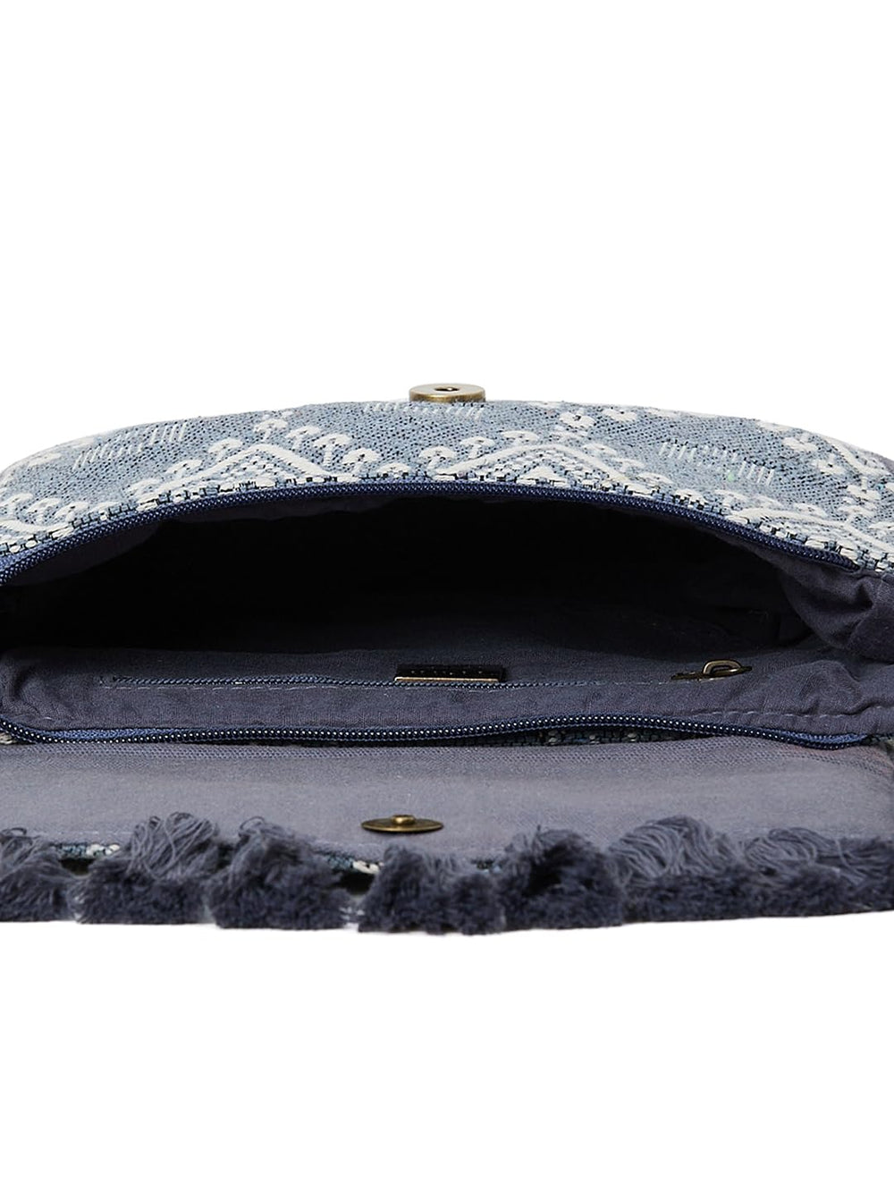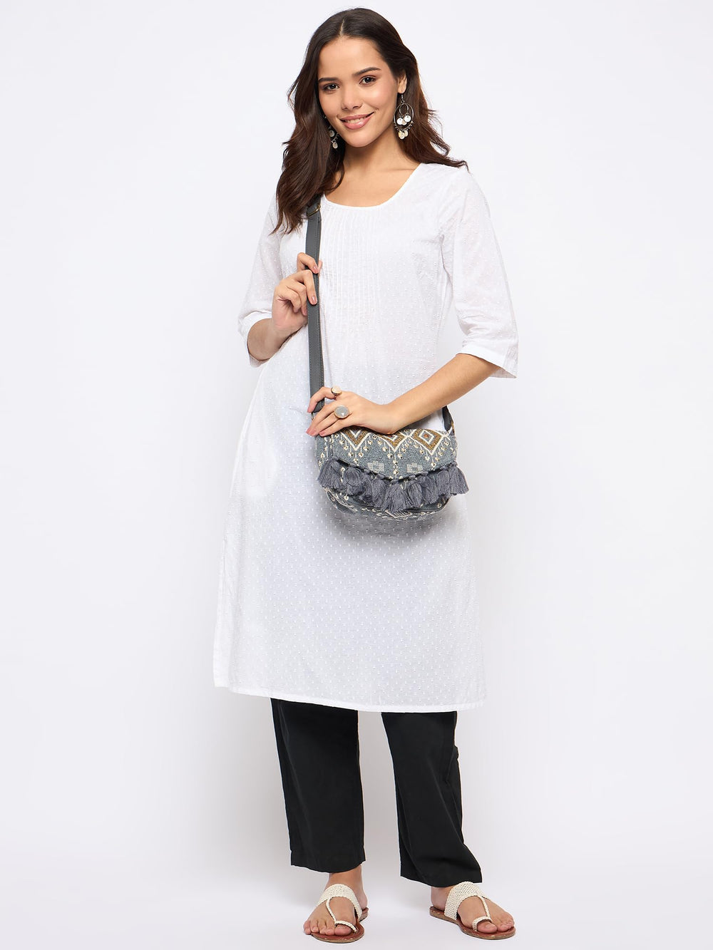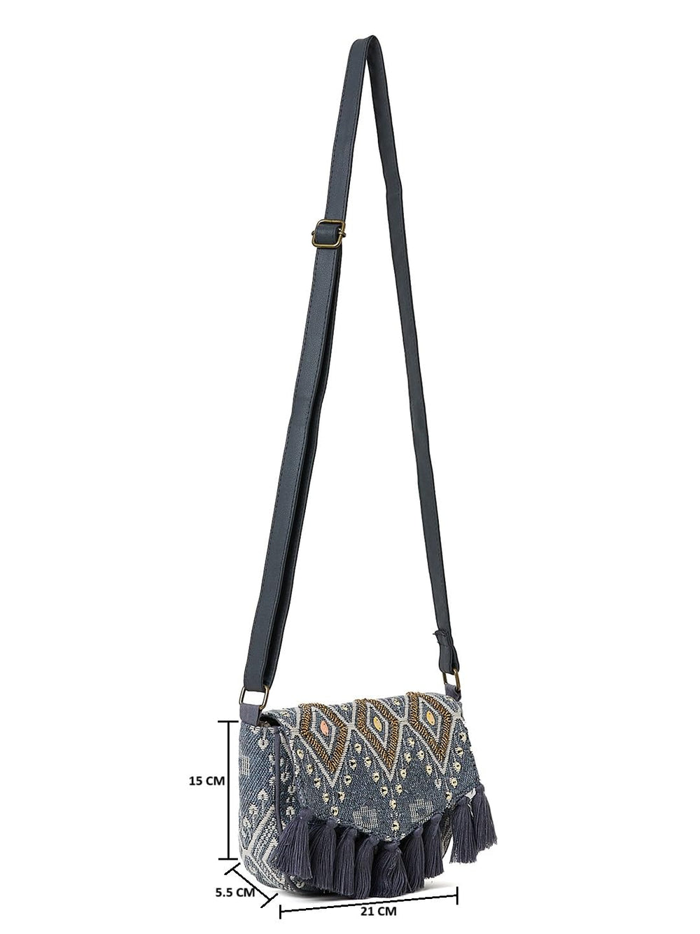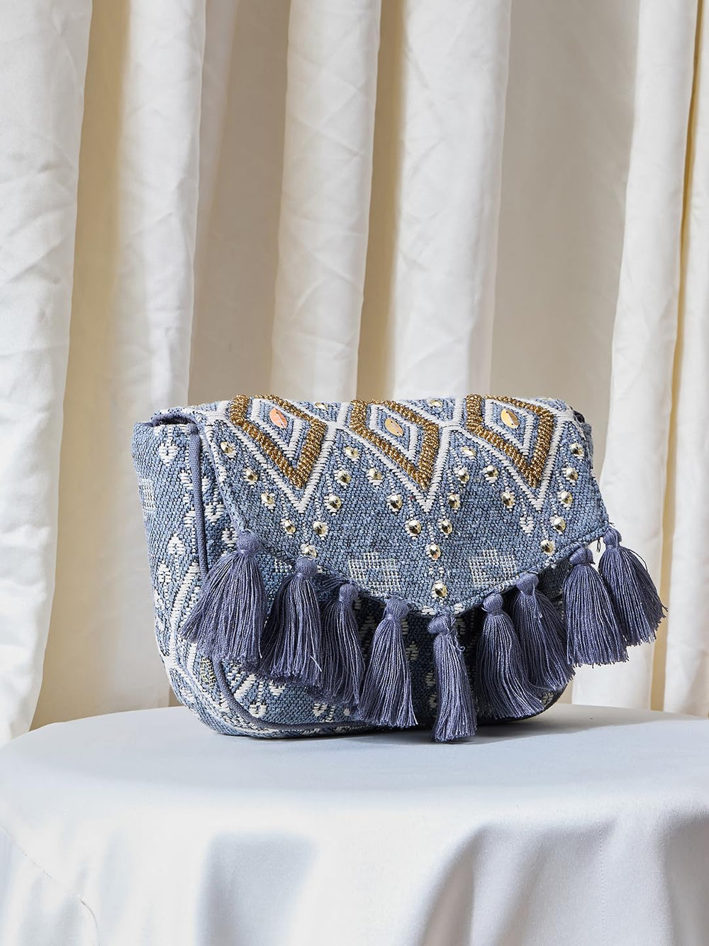 • Grey embellished sling bag, with tasselled detail