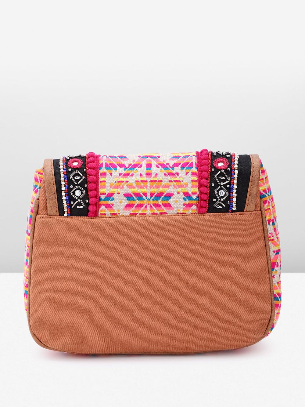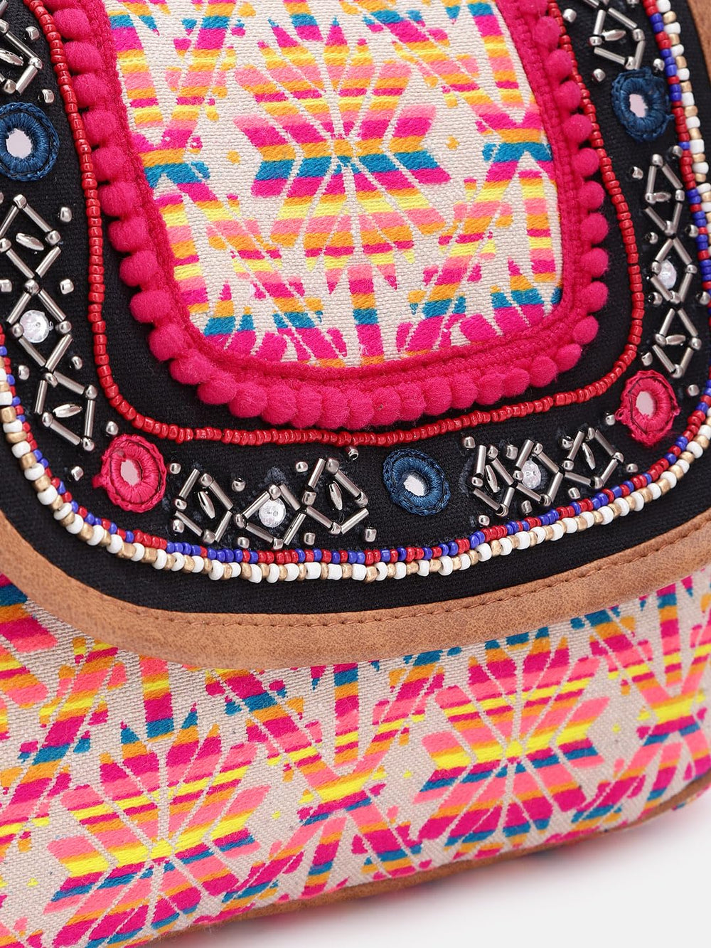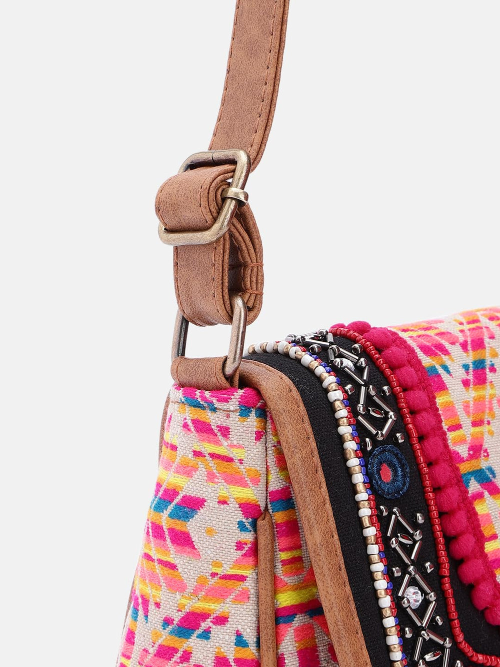 Elevate your style with this vibrant and meticulously crafted handbag. Exquisitely handmade, it showcases a captivating blend of traditional Indian artistry and contemporary flair. The intricate embroidery and beadwork, adorned with geometric patterns and vibrant hues, create a mesmerising visual tapestry. Crafted from durable materials, this bag offers ample space for your essentials while adding a touch of ethnic elegance to your ensemble. With its adjustable strap, it can be carried as a crossbody or handbag, ensuring versatility and comfort. Embrace the rich cultural heritage and make a statement with this exquisite accessory.
