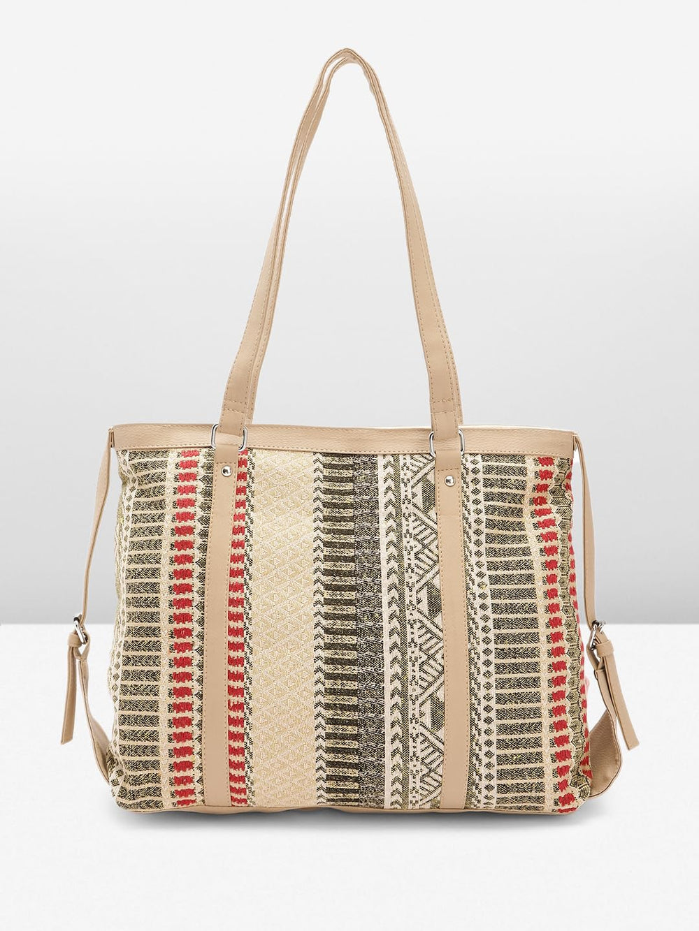 This stylish tote bag is a true embodiment of traditional Indian craftsmanship. The intricate geometric patterns, rendered in earthy tones of beige, red, and black, are meticulously handwoven, showcasing the artistry of skilled artisans. Crafted from durable fabric, this spacious bag offers ample room for your daily essentials, while the sturdy leather handles provide a comfortable grip. Whether you're running errands or attending a casual gathering, this tote effortlessly blends functionality with a touch of ethnic charm. Measuring approximately 36cm in length, 31cm in height, and 9cm in depth, it strikes the perfect balance between size and portability. Embrace the timeless allure of Indian heritage with this captivating tote bag.