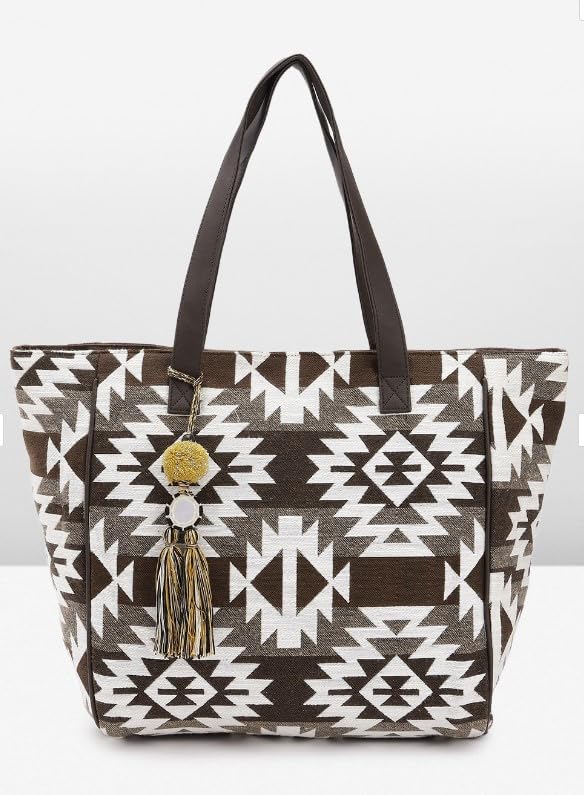 Elevate your style with this stunning hand bag for women. Crafted with meticulous attention to detail, it boasts a striking geometric pattern in a monochrome colour scheme, adding a touch of sophistication to any ensemble. The spacious interior offers ample room for your essentials, while the durable construction ensures long-lasting use. Accentuated with a tasselled charm and leather accents, this bag exudes a perfect blend of elegance and functionality. Whether you're heading to the office or a social gathering, this versatile piece will effortlessly complement your look. Embrace the timeless allure of this hand bag and make a statement wherever you go. Dimensions: 32 cm (Width) x 35 cm (height) x 15 cm (depth).