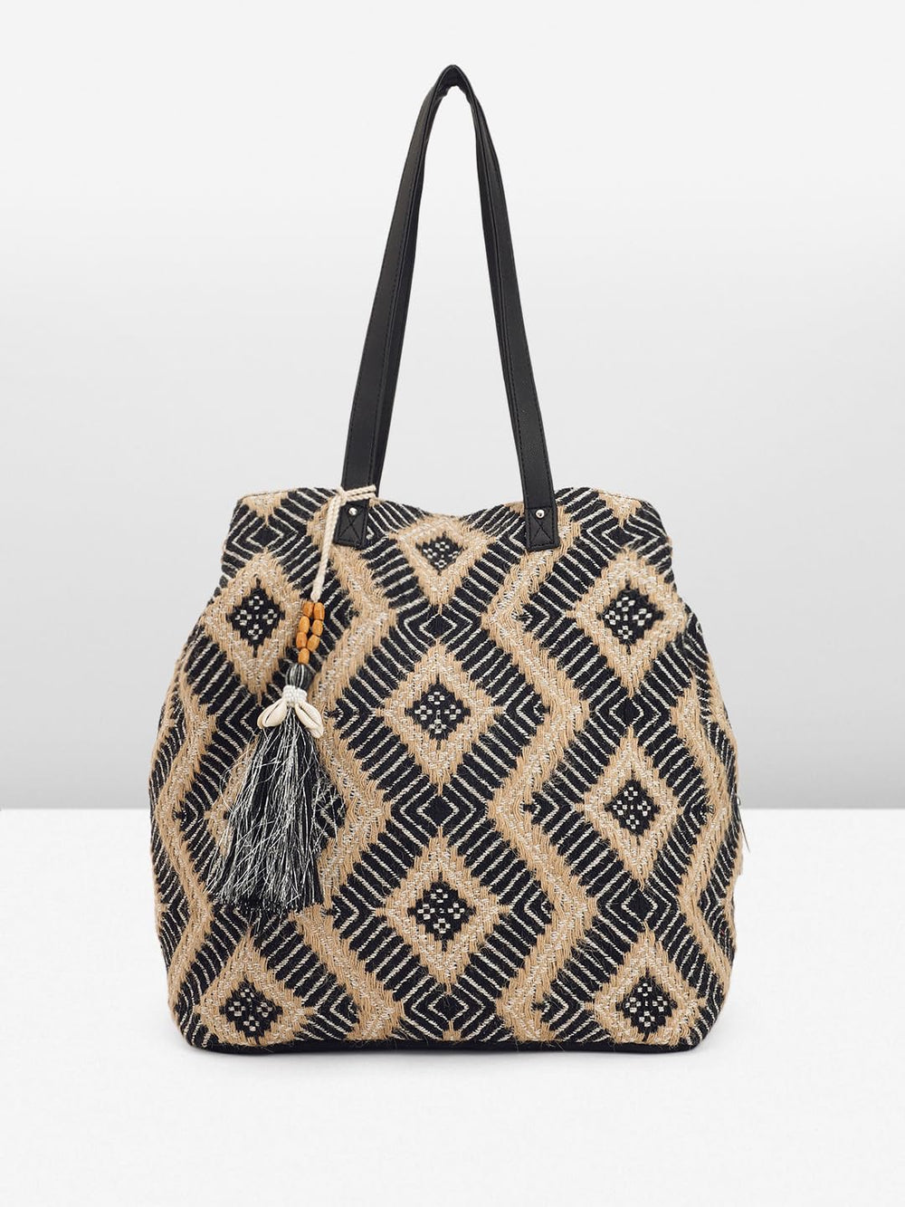 Elevate your style with this chic and trendy hand bag for women. Crafted with intricate geometric patterns in a striking black and beige colour palette, this tote exudes bohemian flair. The woven design showcases exceptional artisanship, making it a true statement piece. Spacious enough for your daily essentials, this bag features a tassel detail that adds a touch of playfulness. With its durable construction and comfortable shoulder straps, it's both fashionable and functional. Embrace the allure of this hand bag and effortlessly elevate any ensemble.
