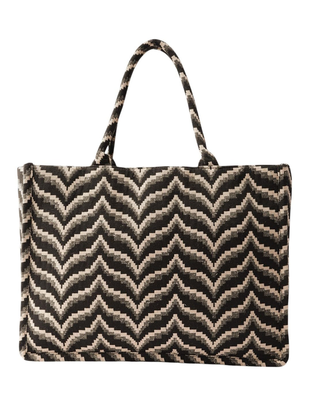 Make a bold style statement with this striking canvas tote bag featuring a mesmerising black and beige chevron pattern. The geometric zigzag design creates a sophisticated pixel-like effect that adds visual interest and contemporary flair to your everyday carry. This spacious shoulder handbag offers ample room for all your daily essentials, from books and documents to shopping items. Crafted from durable canvas material, the tote maintains its shape while being lightweight and practical for regular use. The matching handles are sturdy and comfortable to carry, whether you're heading to work, university, or running errands. The neutral colour palette ensures this bag coordinates seamlessly with various outfits and occasions. The classic tote silhouette combined with the modern chevron pattern makes this bag a versatile accessory that transitions effortlessly from casual to semi-formal settings. Perfect for the fashion-conscious individual who values both style and functionality in their accessories.