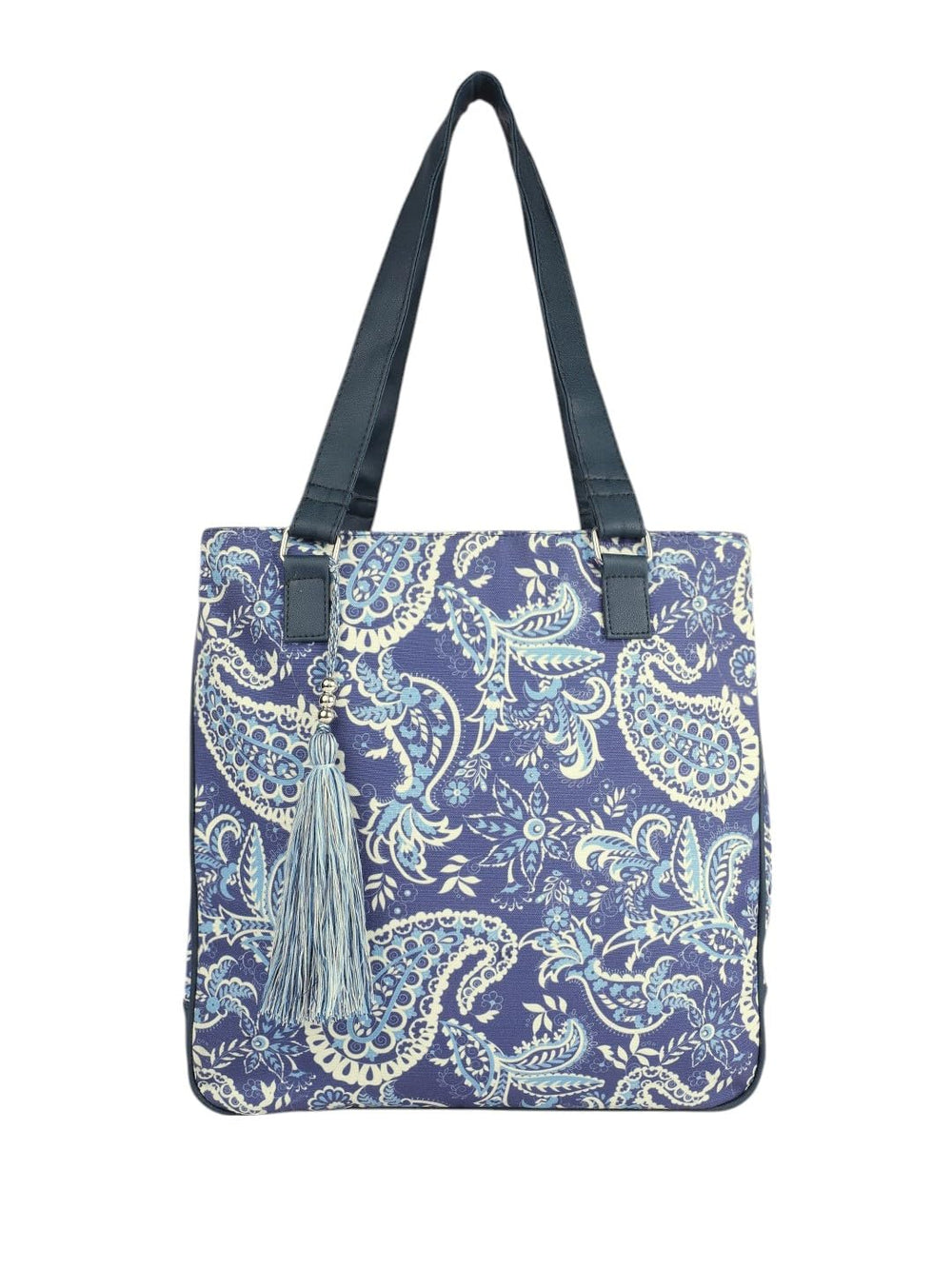 Elevate your everyday style with this sophisticated tote bag featuring an enchanting navy blue and white paisley print. The intricate floral and paisley patterns create a timeless aesthetic that seamlessly transitions from casual outings to professional settings. Crafted with durable fabric and adorned with an elegant matching tassel detail, this bag combines both fashion and functionality. The spacious interior provides ample room for your daily essentials, while the sturdy double handles ensure comfortable carrying. The classic navy and white colour scheme offers versatile styling options, complementing a wide range of outfits. The structured design maintains its shape beautifully, making it an ideal companion for shopping, work, or casual weekend adventures. The decorative tassel adds a playful yet refined touch to this practical accessory, making it a standout piece in any wardrobe collection.