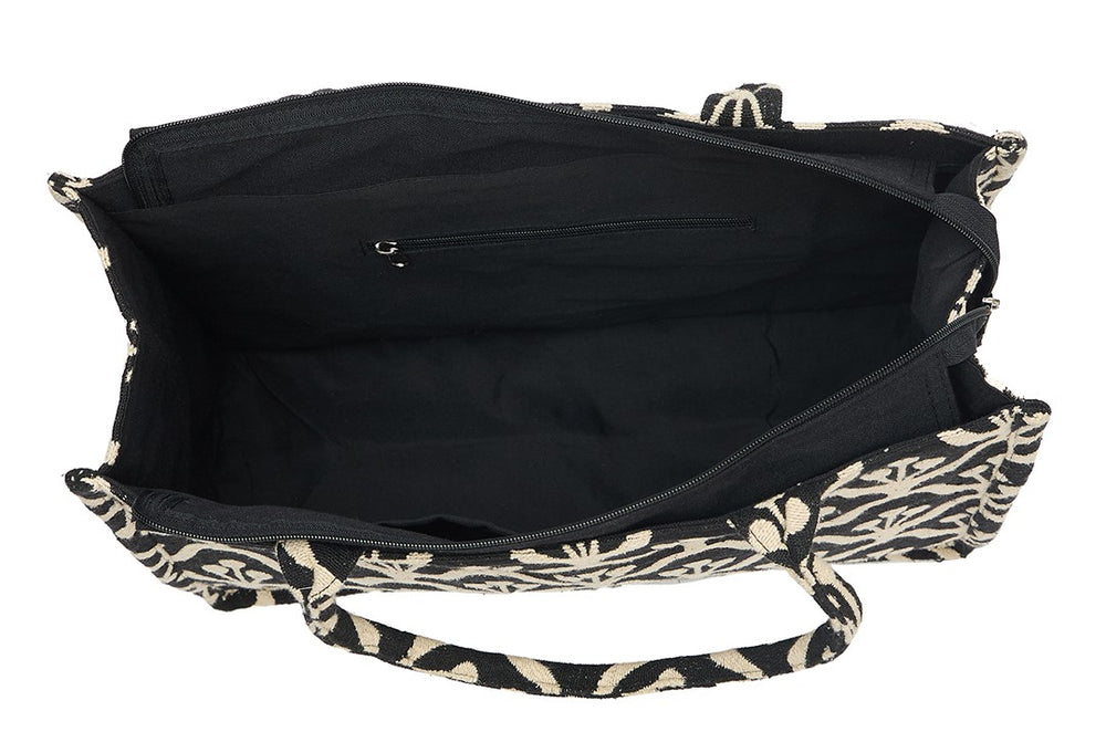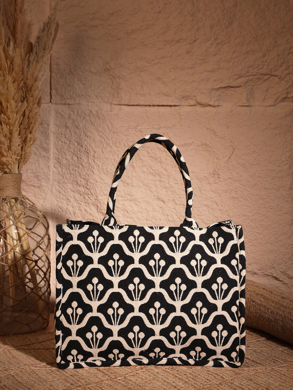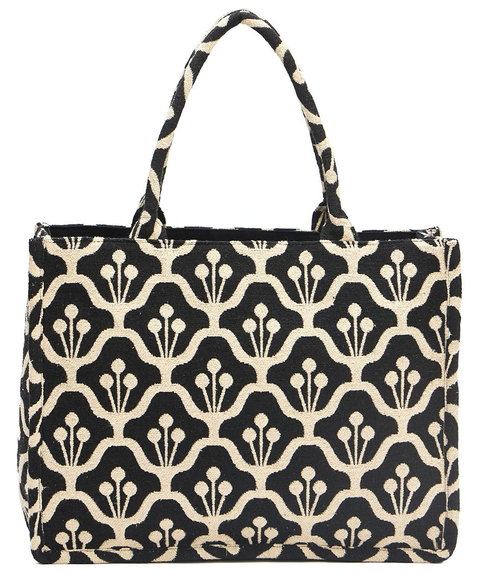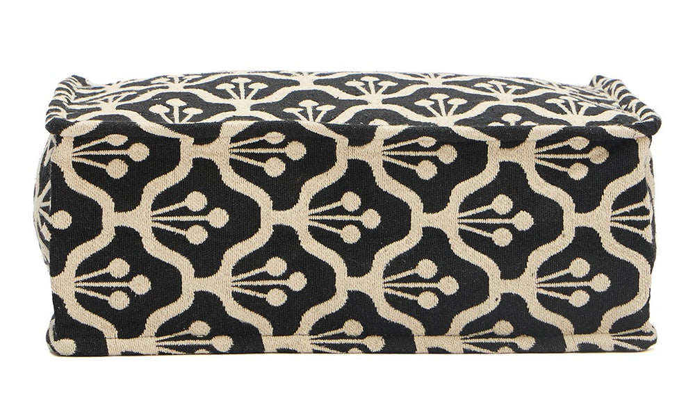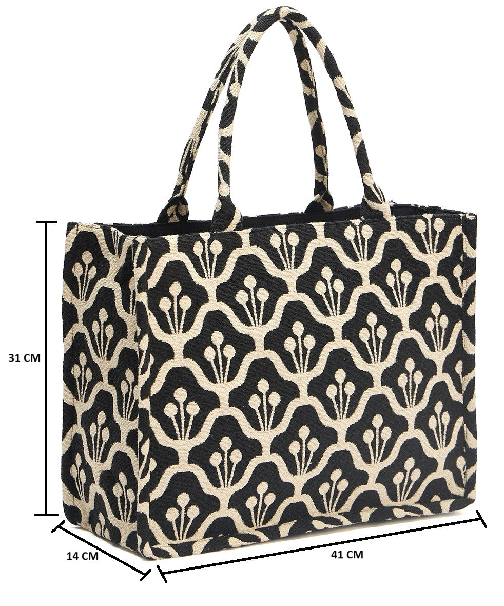 • DESIGN: Elegant black and beige canvas tote bag featuring a sophisticated repeating floral pattern perfect for everyday use