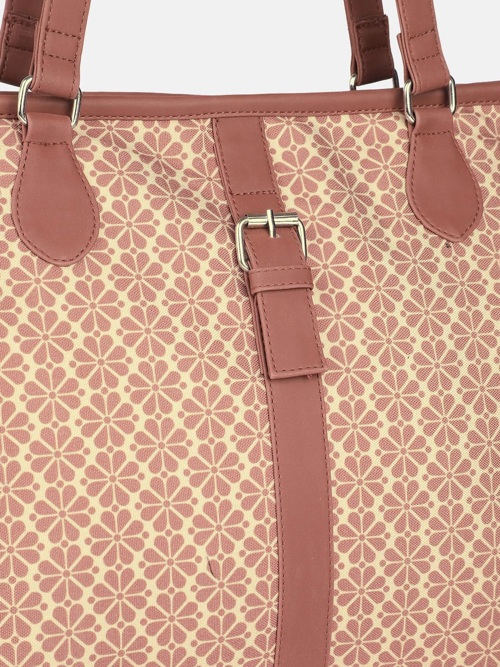 Elevate your everyday style with this sophisticated tote bag featuring a delightful pink and cream floral pattern. The elegant geometric flower motif creates a timeless aesthetic that complements both casual and formal outfits. Crafted with attention to detail, this spacious tote includes a distinctive central buckle detail that adds both style and security. The comfortable shoulder straps are designed for easy carrying, while the roomy interior provides ample space for all your daily essentials. The bag's versatile design makes it perfect for shopping, work, or casual outings. The durable construction and practical size ensure it meets all your carrying needs while maintaining its fashionable appeal. The neutral colour palette ensures this tote pairs beautifully with a wide range of outfits, making it a versatile addition to your accessory collection. This charming tote combines functionality with feminine elegance, making it an ideal choice for the fashion-conscious individual seeking both style and practicality in their everyday bag.