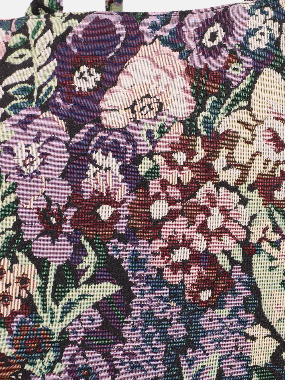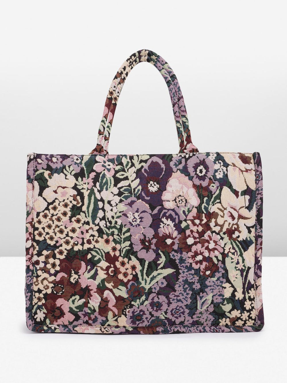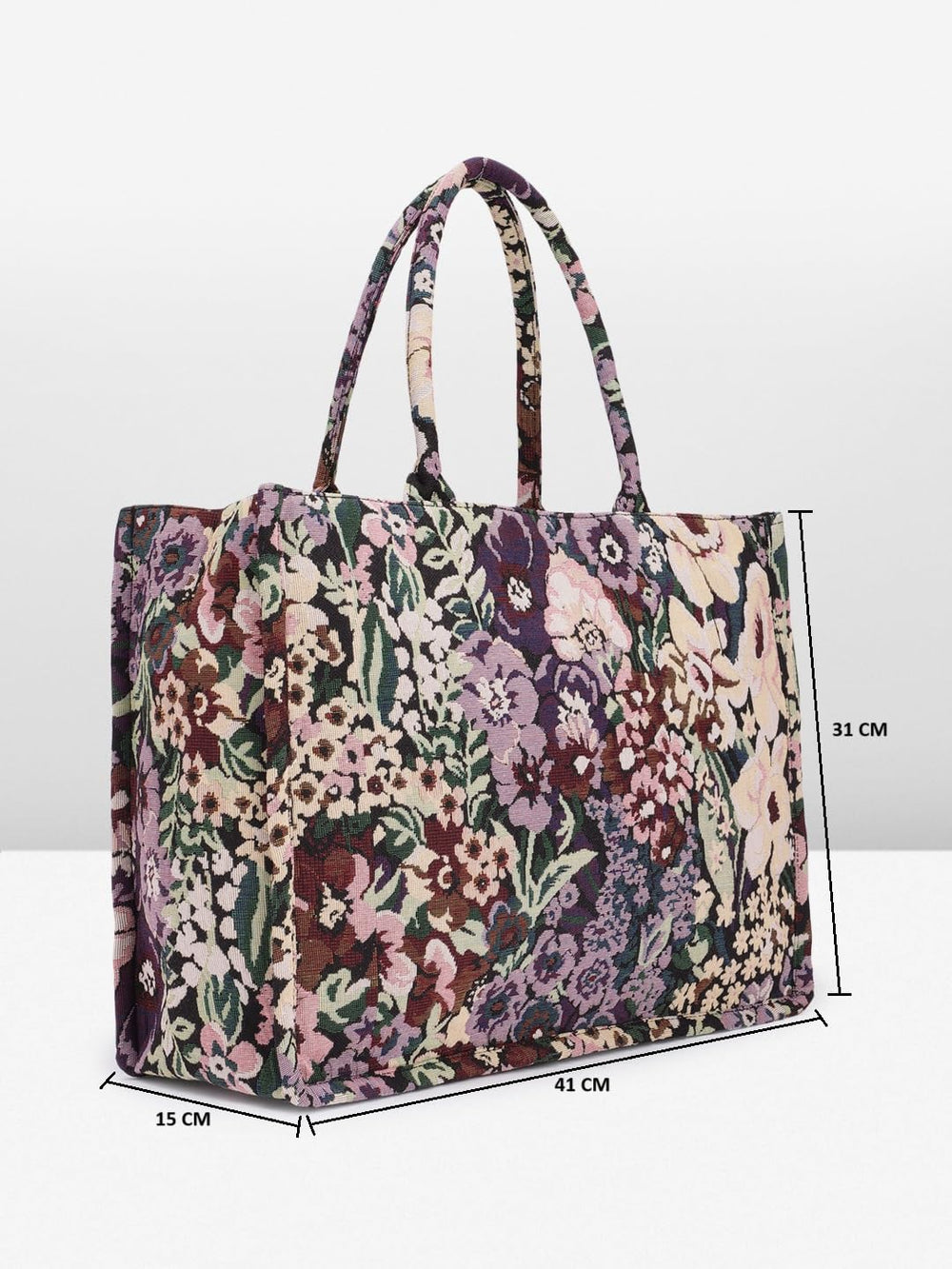 Elevate your style with this chic and versatile tote bag. Crafted with a vibrant floral tapestry pattern in shades of purple, pink, and green, it exudes a bohemian charm. The spacious interior provides ample room for your daily essentials, while the sturdy canvas construction ensures long-lasting durability. Whether you're running errands or heading to the office, this eye-catching tote will add a touch of sophistication to any ensemble. Embrace the beauty of nature and make a statement with this captivating floral design.