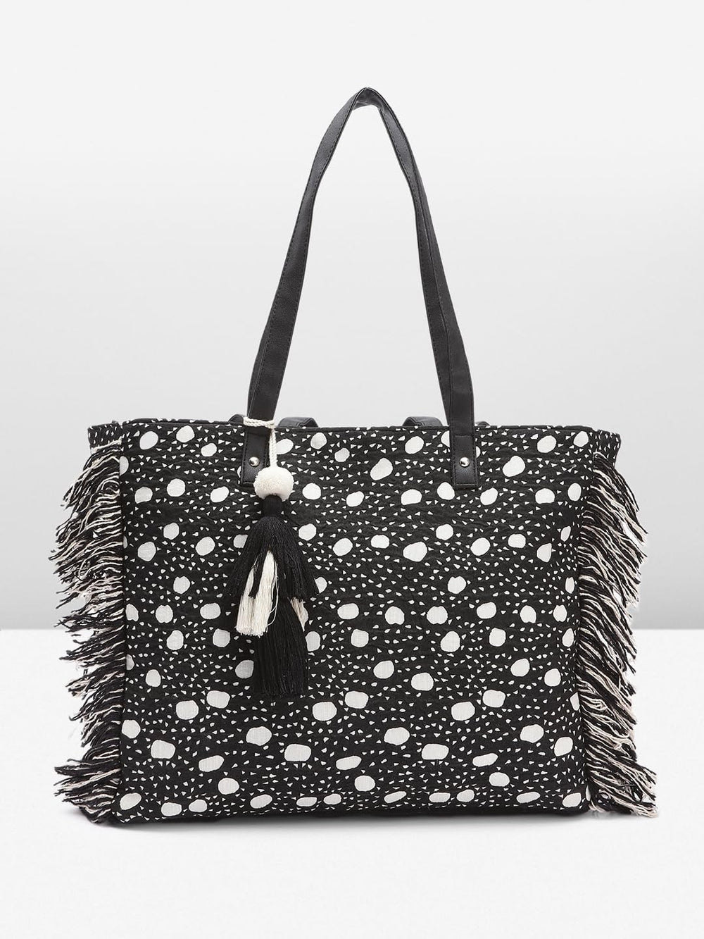 Elevate your style with this chic and trendy handbag for women. Featuring a striking polka dot pattern in black and white, it exudes a playful yet sophisticated vibe. The fringe detailing adds a touch of bohemian flair, making it a standout accessory. Crafted with attention to detail, this bag boasts a spacious interior to accommodate your daily essentials. The sturdy strap ensures comfortable carrying, whether you're running errands or attending a casual gathering. With its eye-catching design and practical functionality, this handbag is a must-have for fashion-forward individuals seeking a versatile and stylish companion.