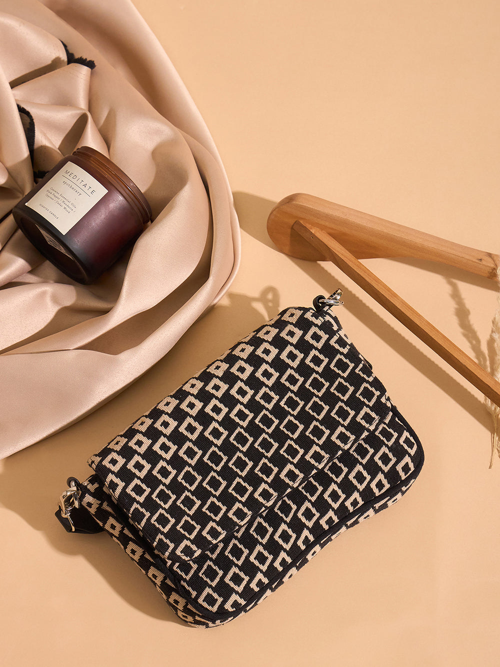 PRIMROSE Geometric Pattern Crossbody Bag, Brown Print, Adjustable Shoulder Strap