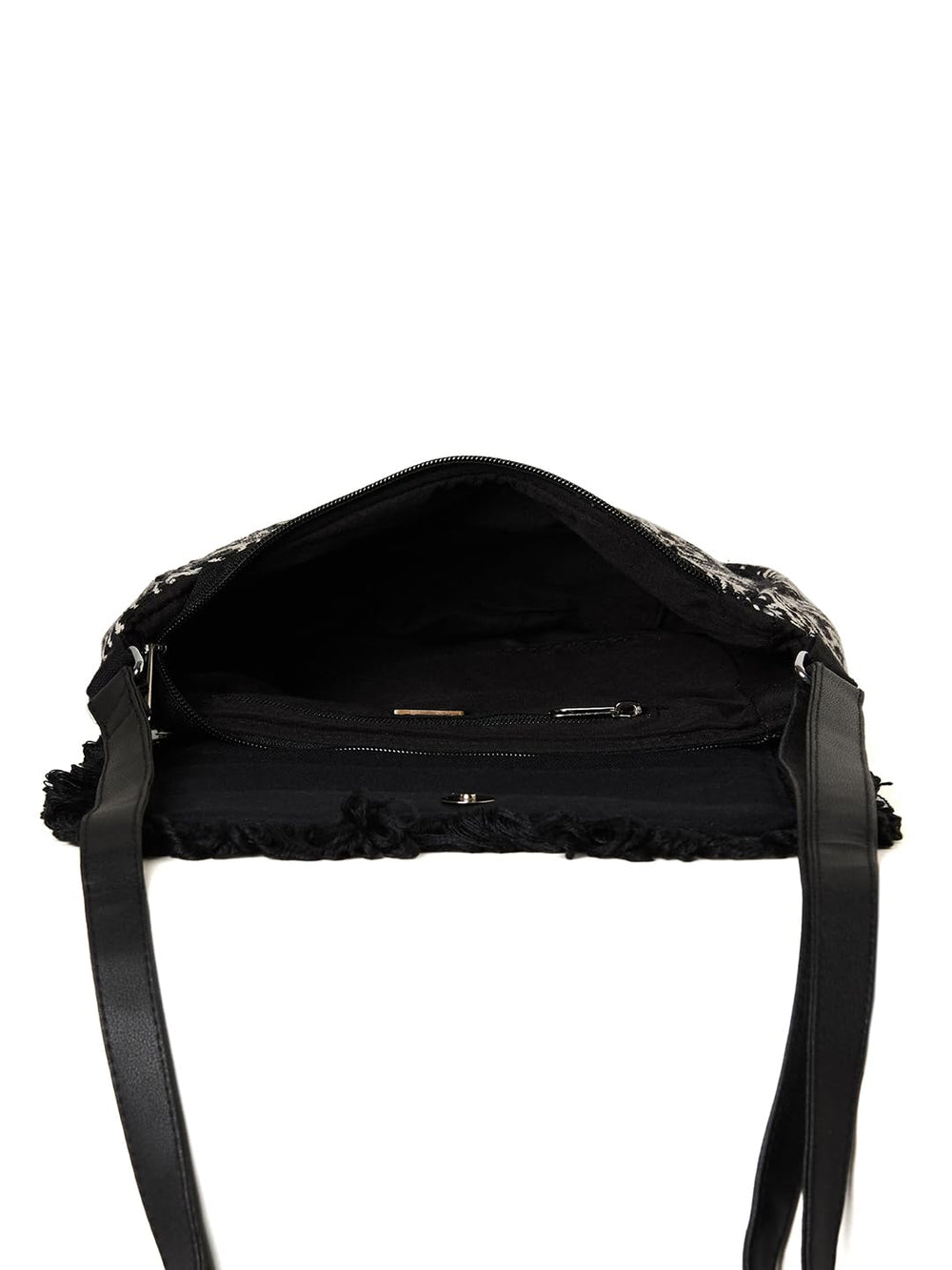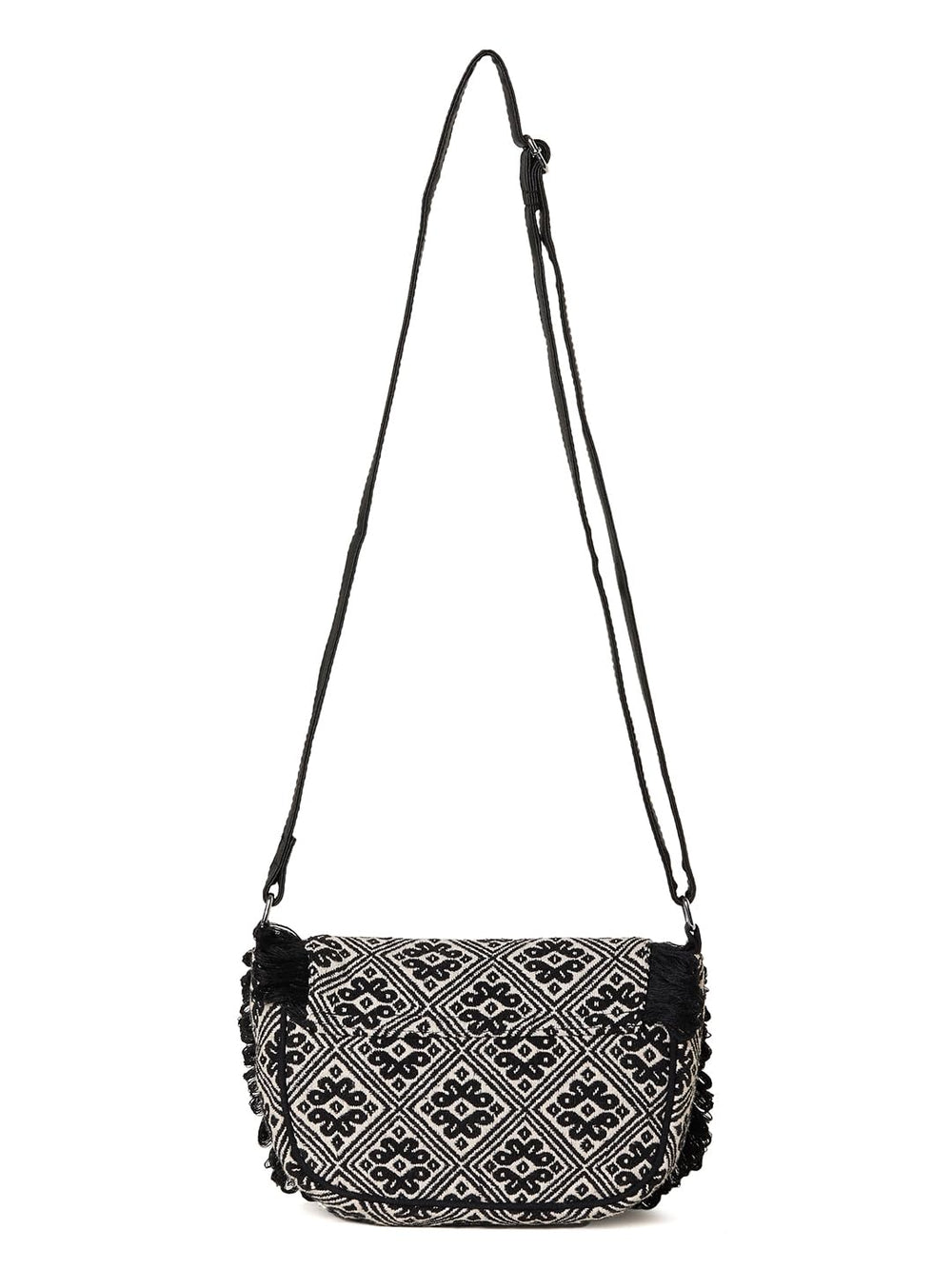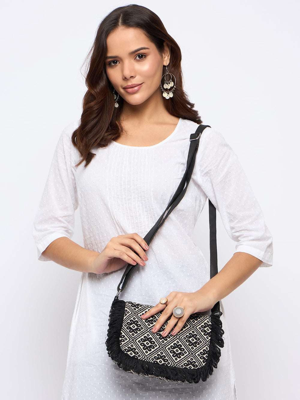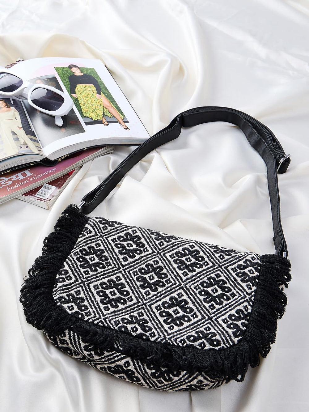 Elevate your style with this chic and trendy hand bag for women. Crafted with intricate geometric patterns and fringed detailing, this cross-body bag exudes bohemian charm. The spacious interior allows you to carry your essentials with ease, while the adjustable strap ensures a comfortable fit. Whether you're dressing up for a night out or keeping it casual for a day of exploration, this versatile bag will add a touch of sophistication to any ensemble. Embrace the allure of this fashionable accessory and make a statement wherever you go.