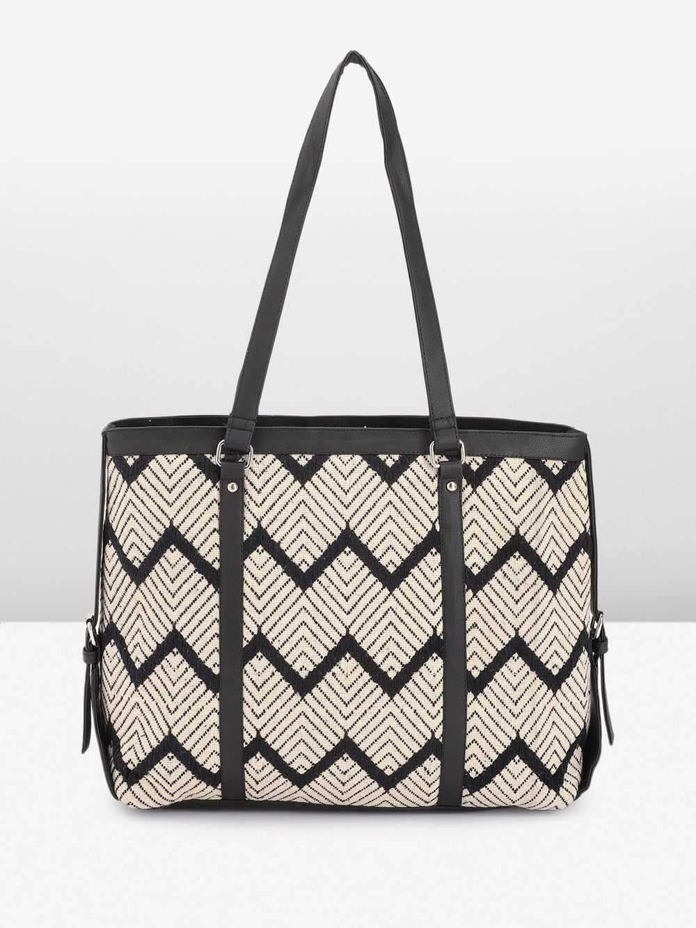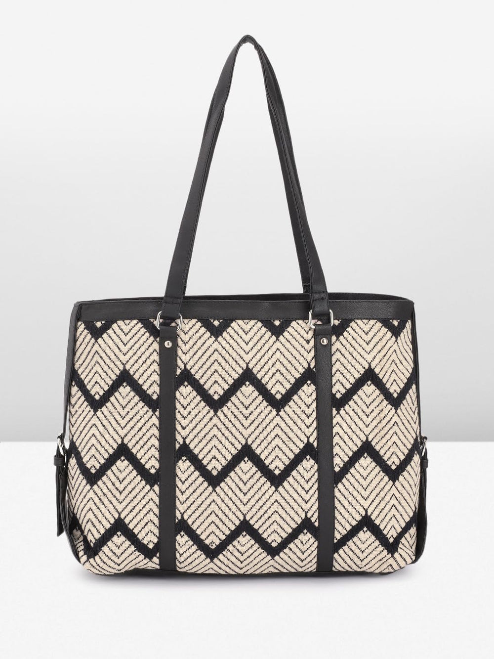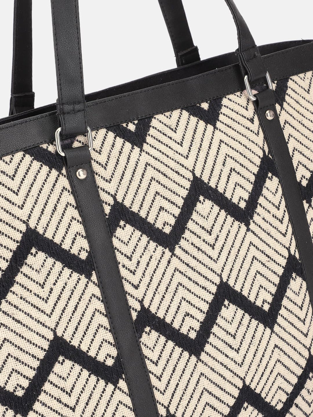 Elevate your style with this chic and versatile tote bag. Crafted with a geometric diamond pattern in contrasting black and beige hues, it exudes a touch of sophistication. The spacious interior provides ample room for your daily essentials, while the sturdy construction ensures durability. Featuring dual handles for comfortable carrying and a zippered closure for added security, this tote effortlessly combines fashion and functionality. Whether you're heading to the office or running errands, this stylish accessory will complement your look with its timeless appeal. Dimensions: 31 cm x 36 cm x 9 cm.