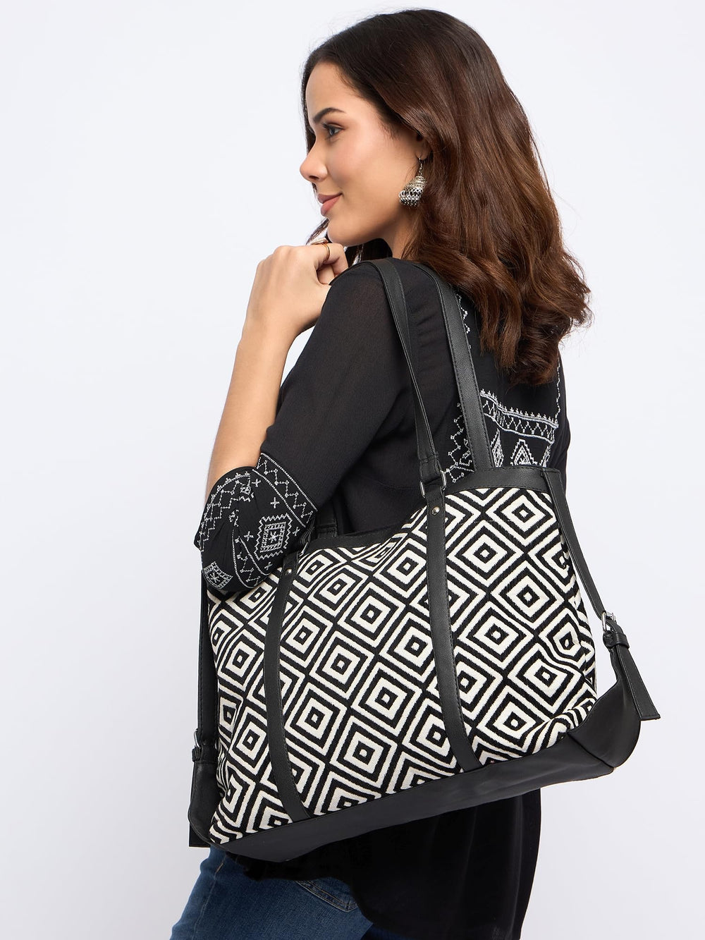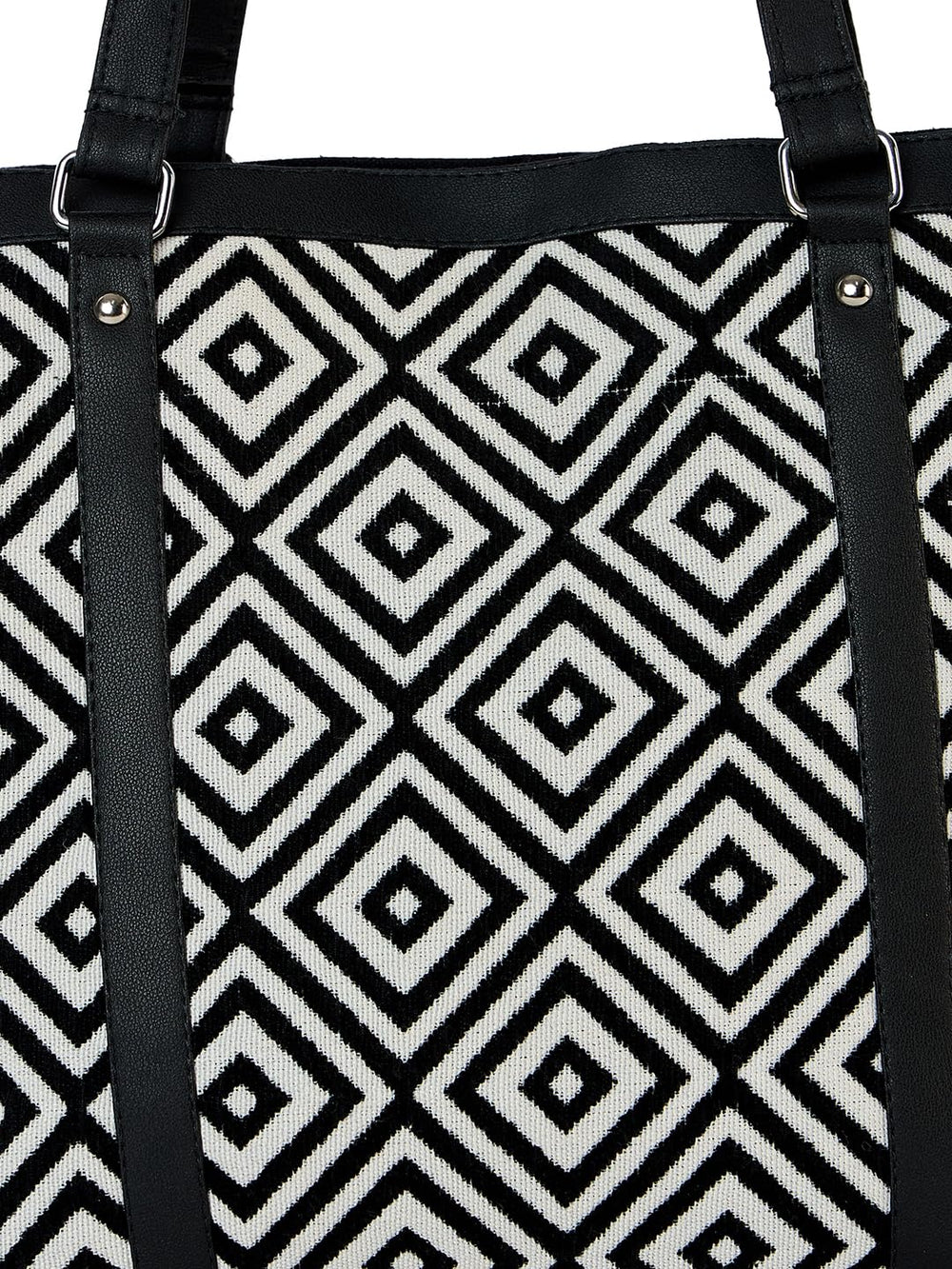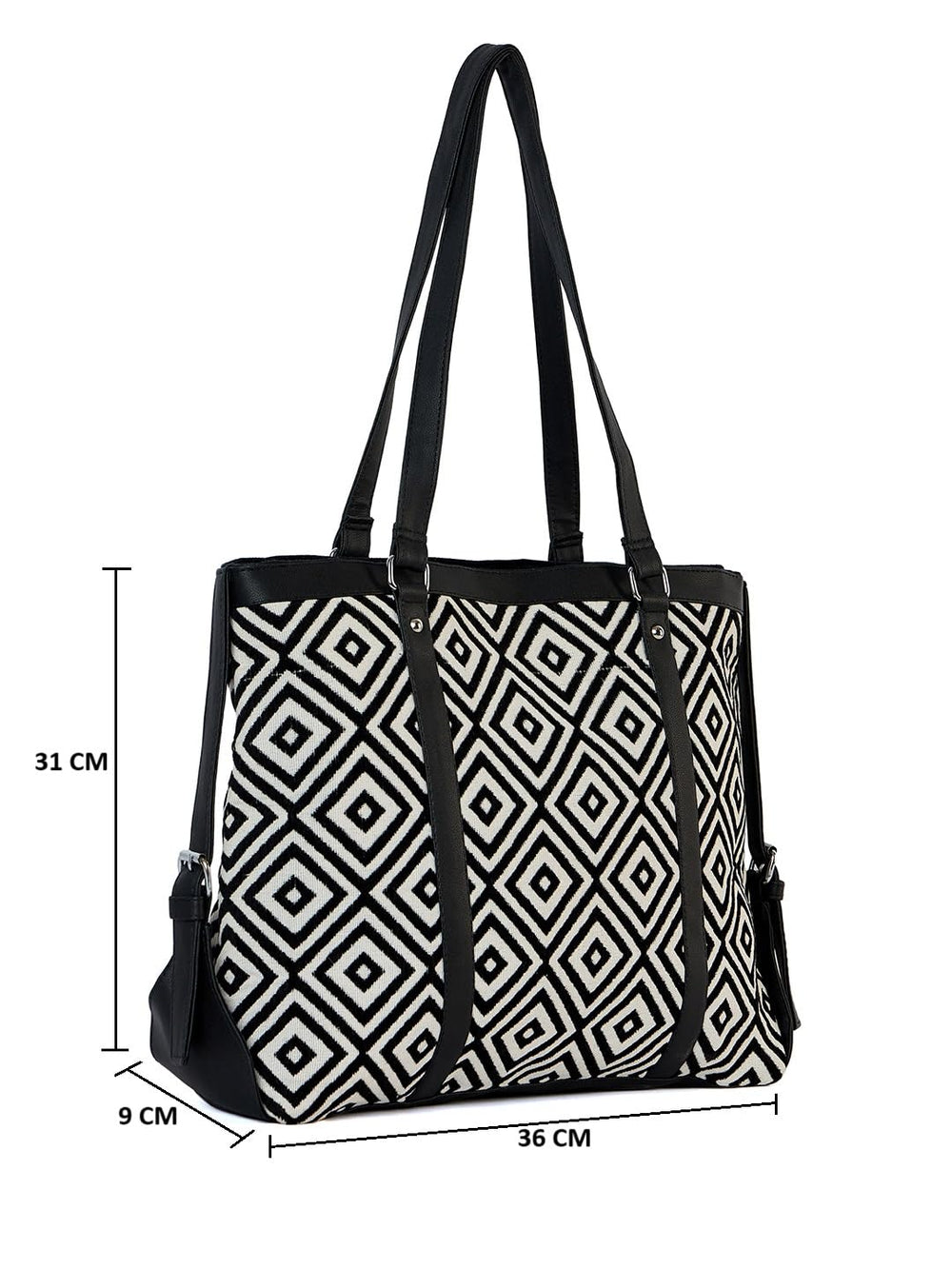 This chic women's tote bag boasts a striking geometric diamond pattern in black and white, lending a bold and eye-catching look. Crafted with durable materials, it features dual shoulder straps for comfortable carrying and a spacious interior to accommodate your daily essentials. The sleek black accents add a touch of sophistication, making this tote bag a stylish and practical choice for any occasion. it offers ample space while maintaining a compact and manageable size. Whether you're running errands or heading to the office, this versatile tote bag combines fashion and functionality seamlessly.