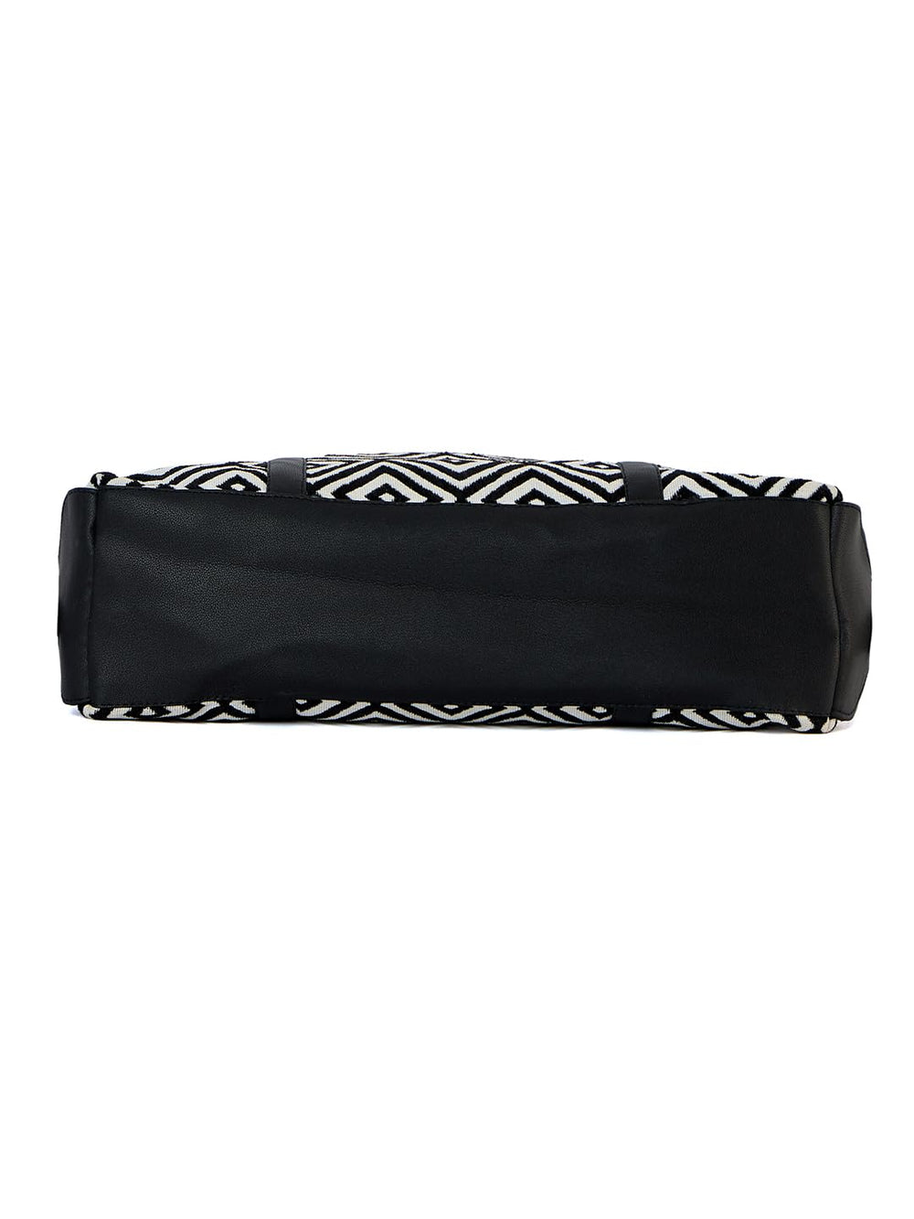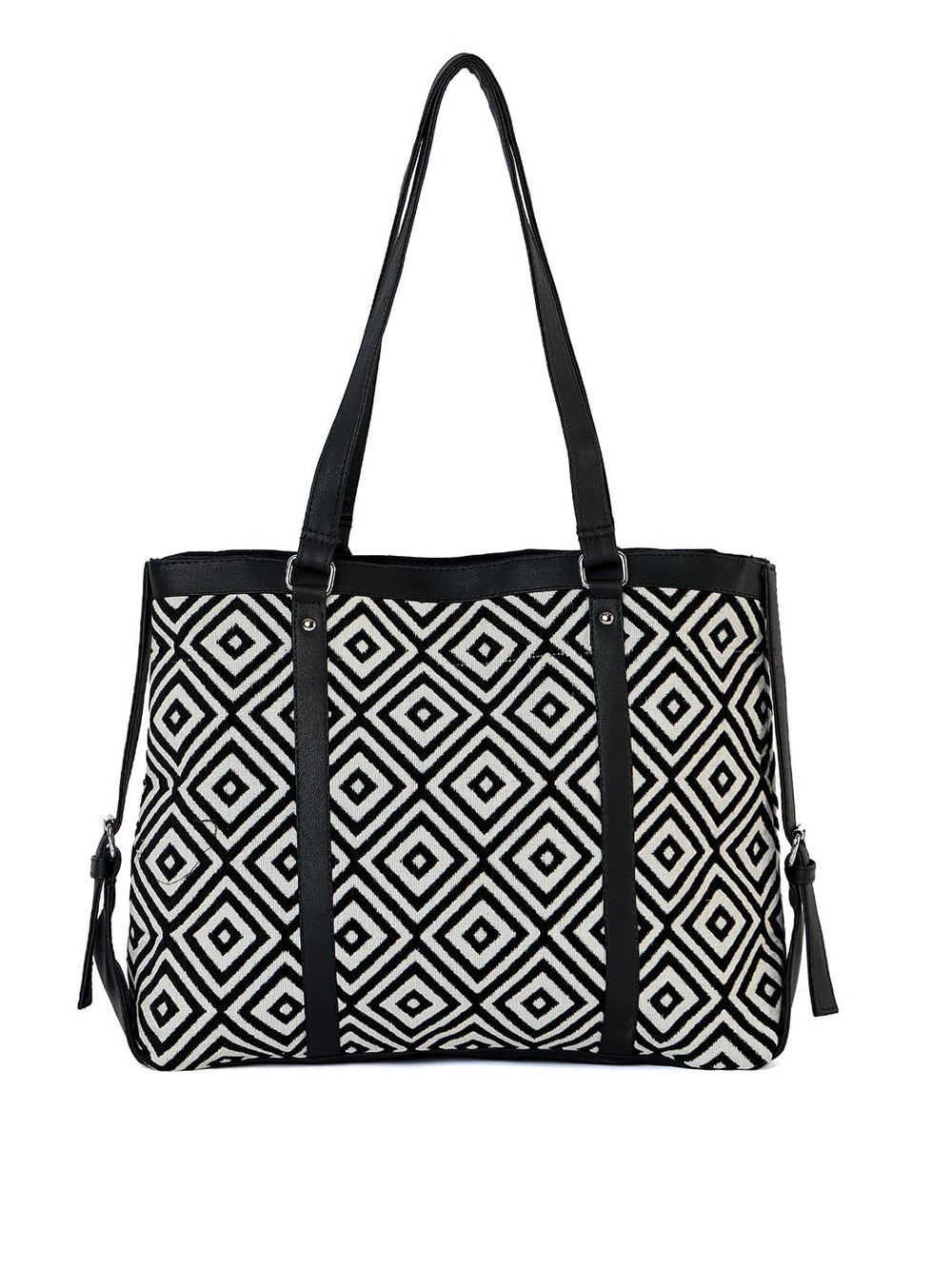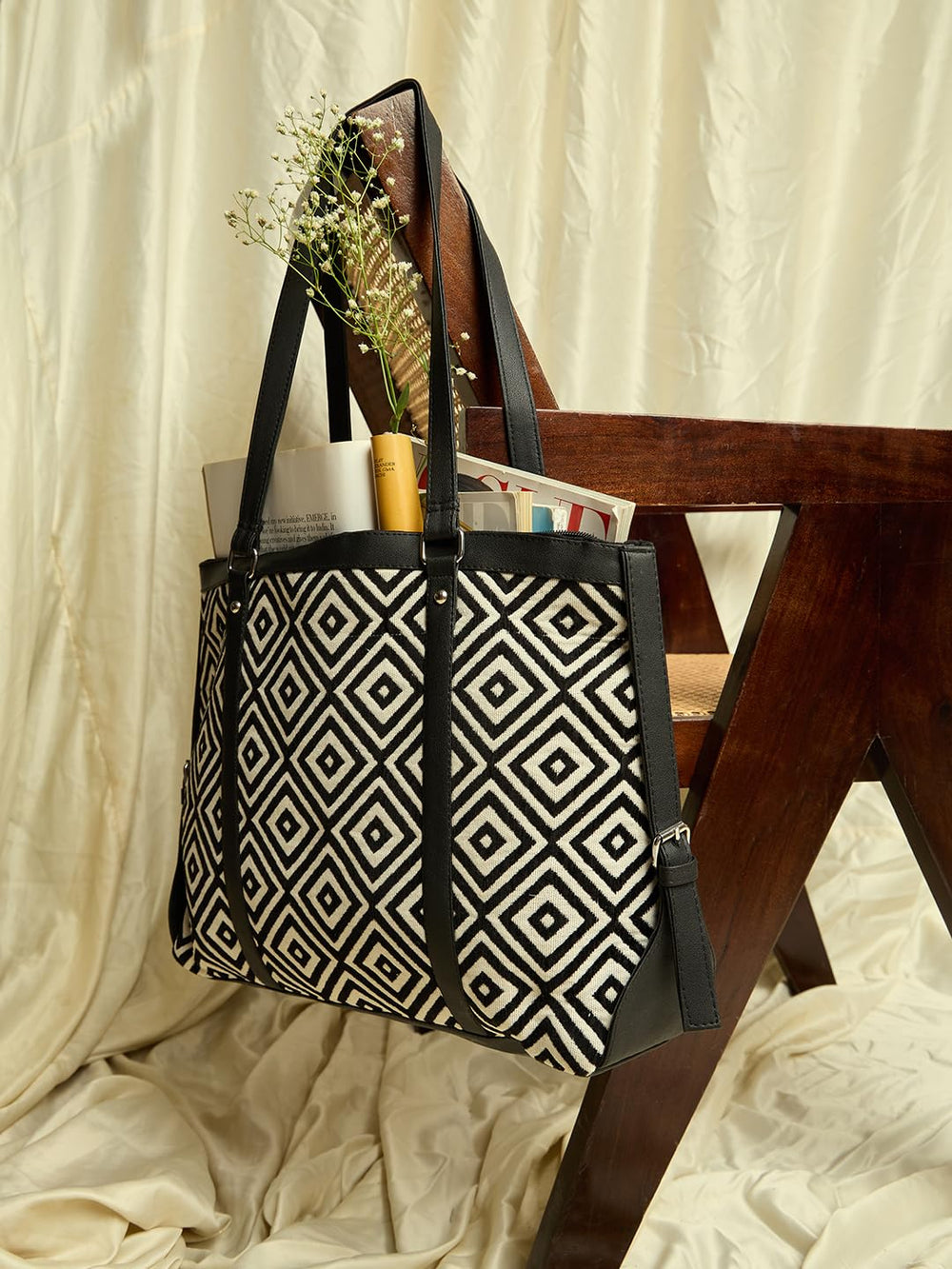 This chic women's tote bag boasts a striking geometric diamond pattern in black and white, lending a bold and eye-catching look. Crafted with durable materials, it features dual shoulder straps for comfortable carrying and a spacious interior to accommodate your daily essentials. The sleek black accents add a touch of sophistication, making this tote bag a stylish and practical choice for any occasion. it offers ample space while maintaining a compact and manageable size. Whether you're running errands or heading to the office, this versatile tote bag combines fashion and functionality seamlessly.
