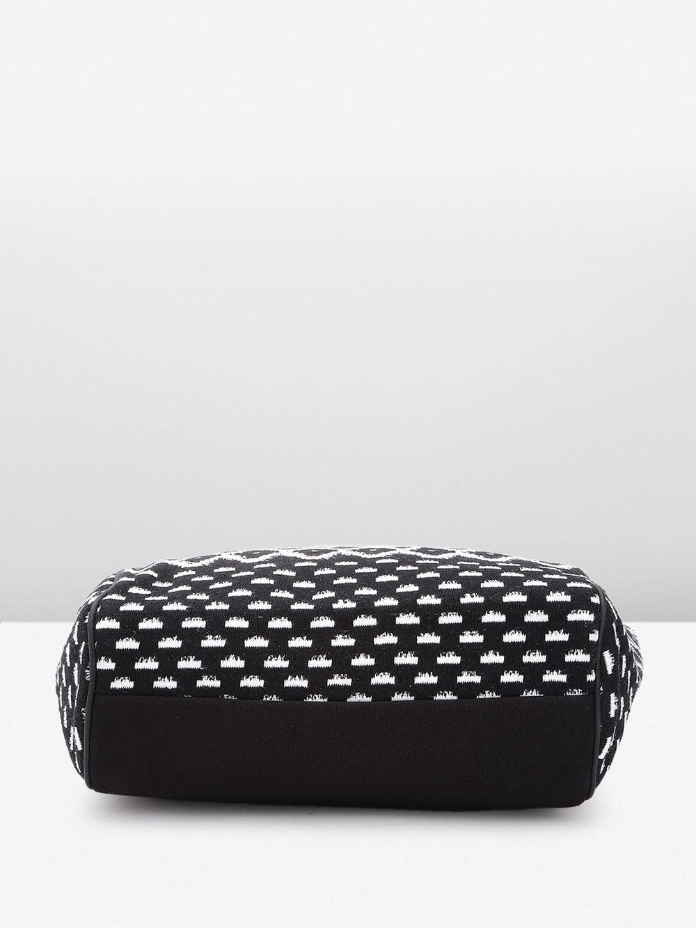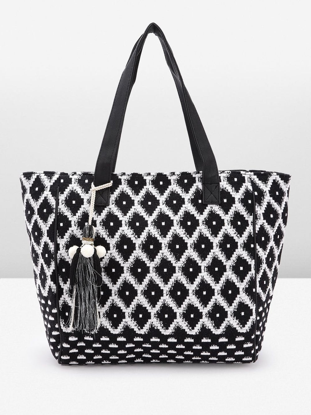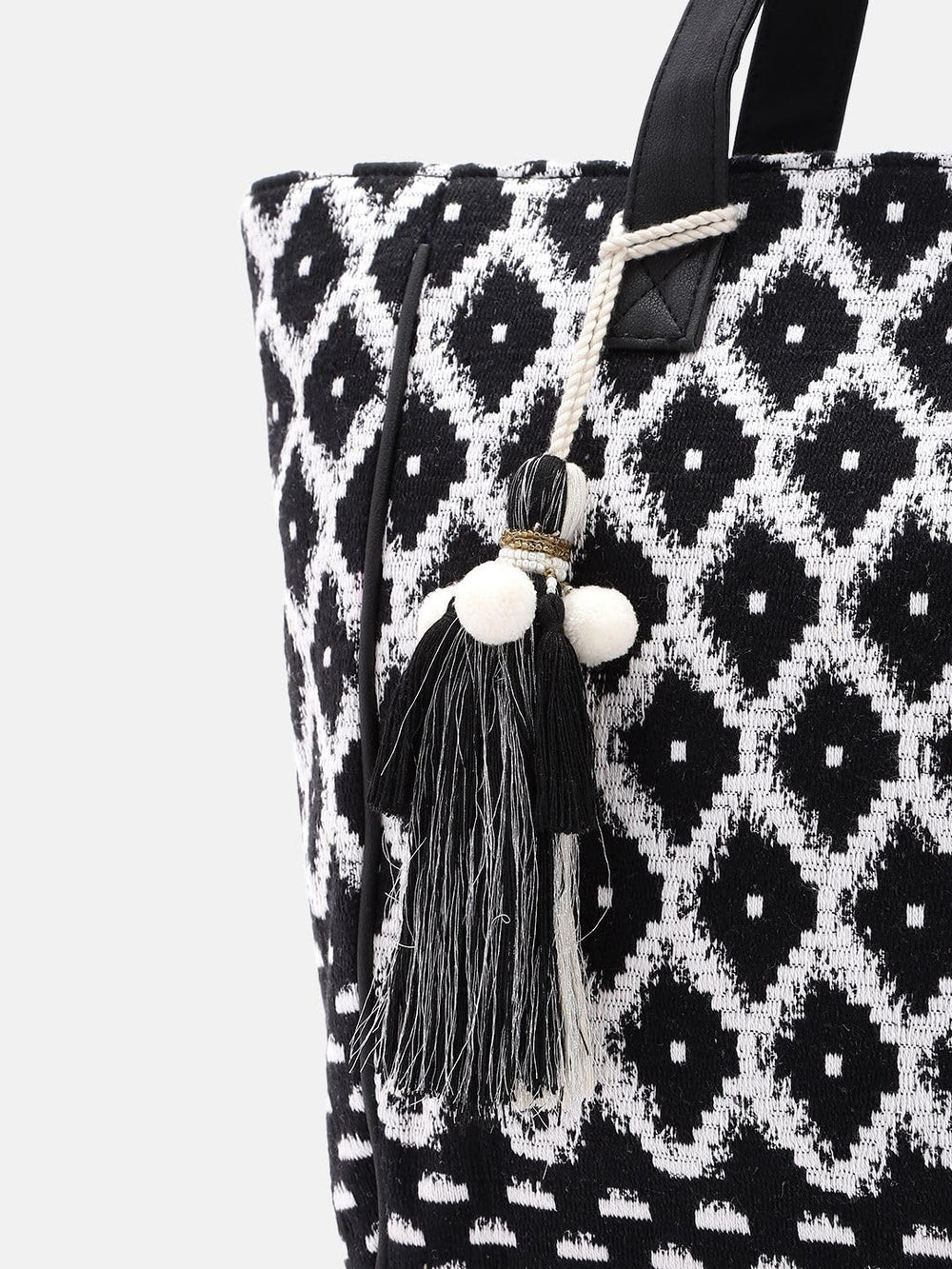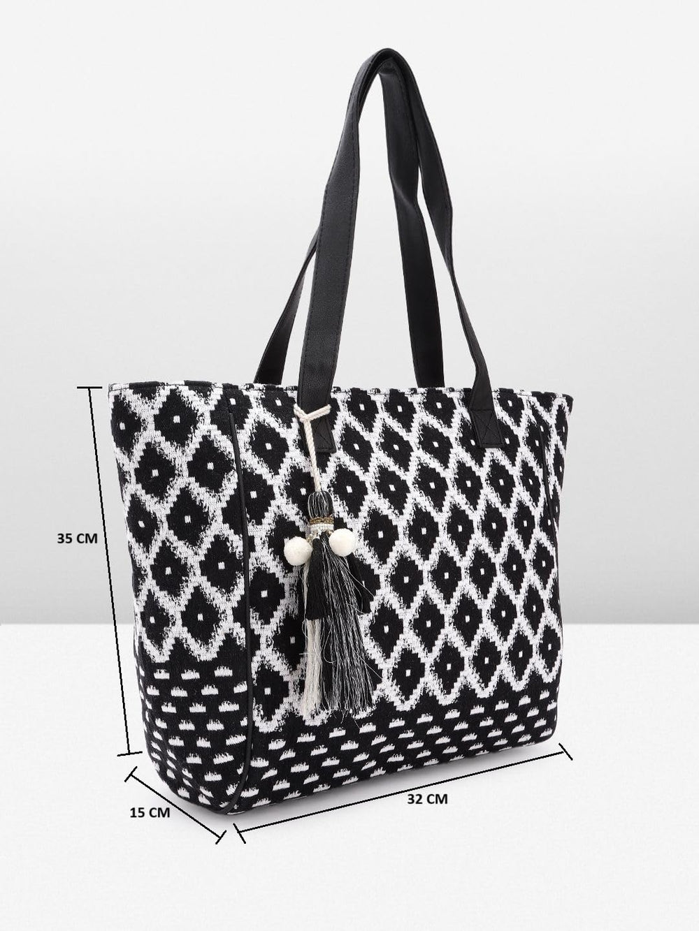 This stylish tote bag exudes a boho-chic vibe with its striking black and white diamond pattern. Crafted from durable fabric, it features a spacious interior perfect for carrying your daily essentials. The black leather handles provide a comfortable grip, while the tasselled charm adds a touch of playfulness. Versatile and eye-catching, this tote is an ideal companion for running errands or casual outings. With its roomy design and trendy aesthetic, it effortlessly blends fashion and functionality. Dimensions: 35 cm x 32 cm x 15 cm.