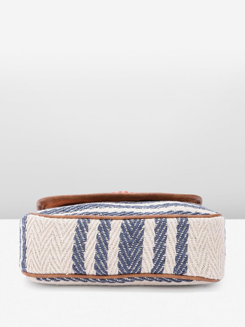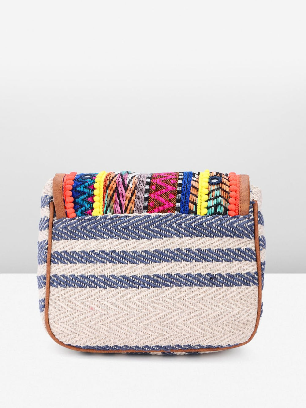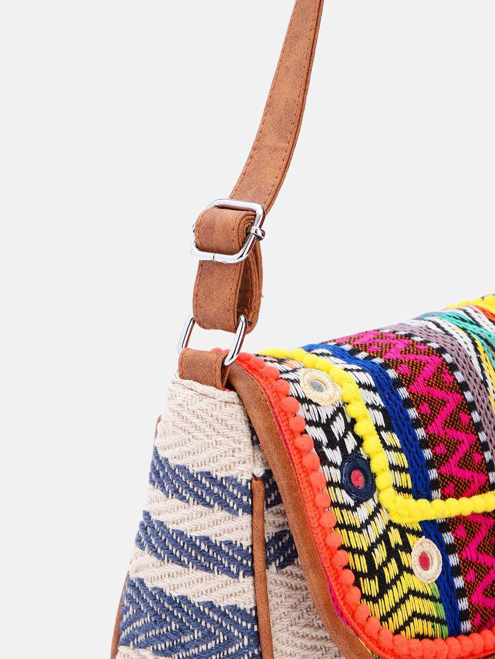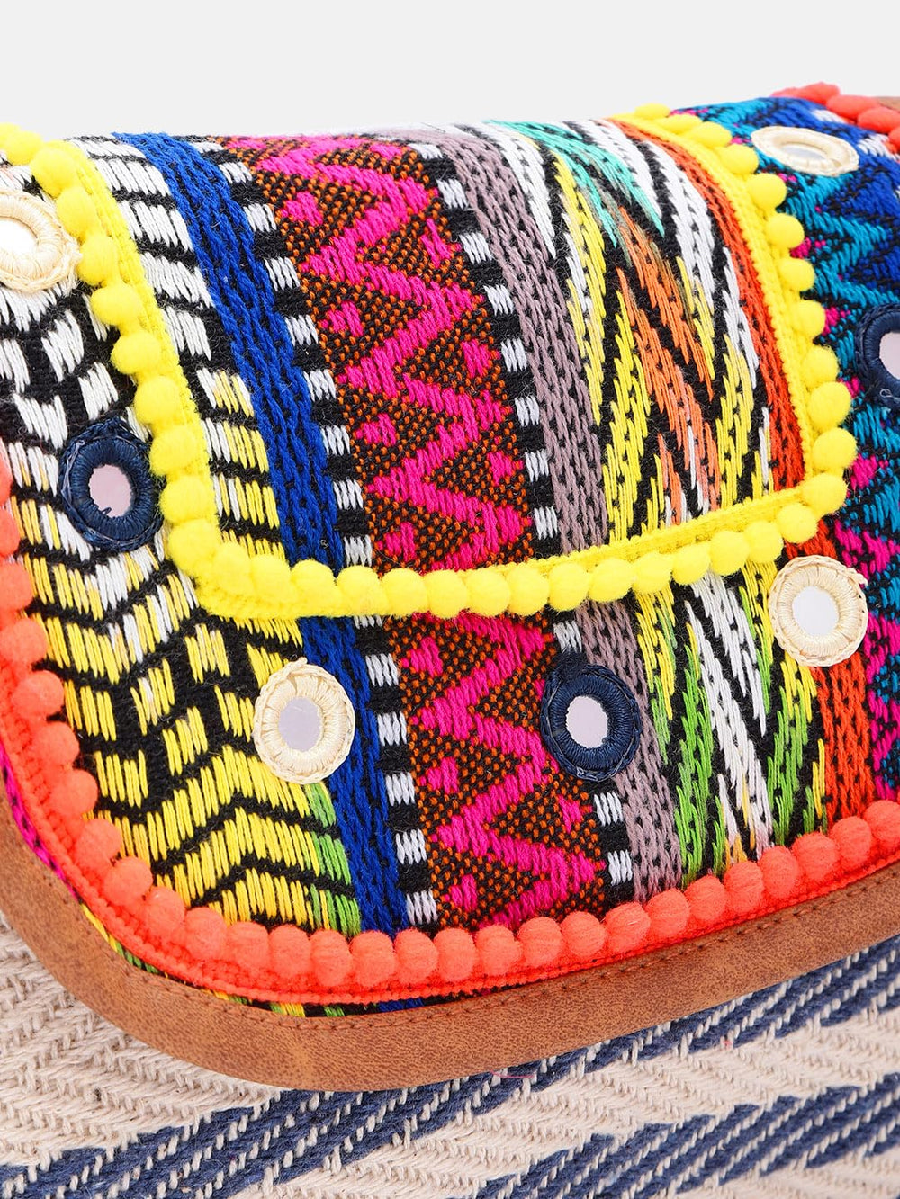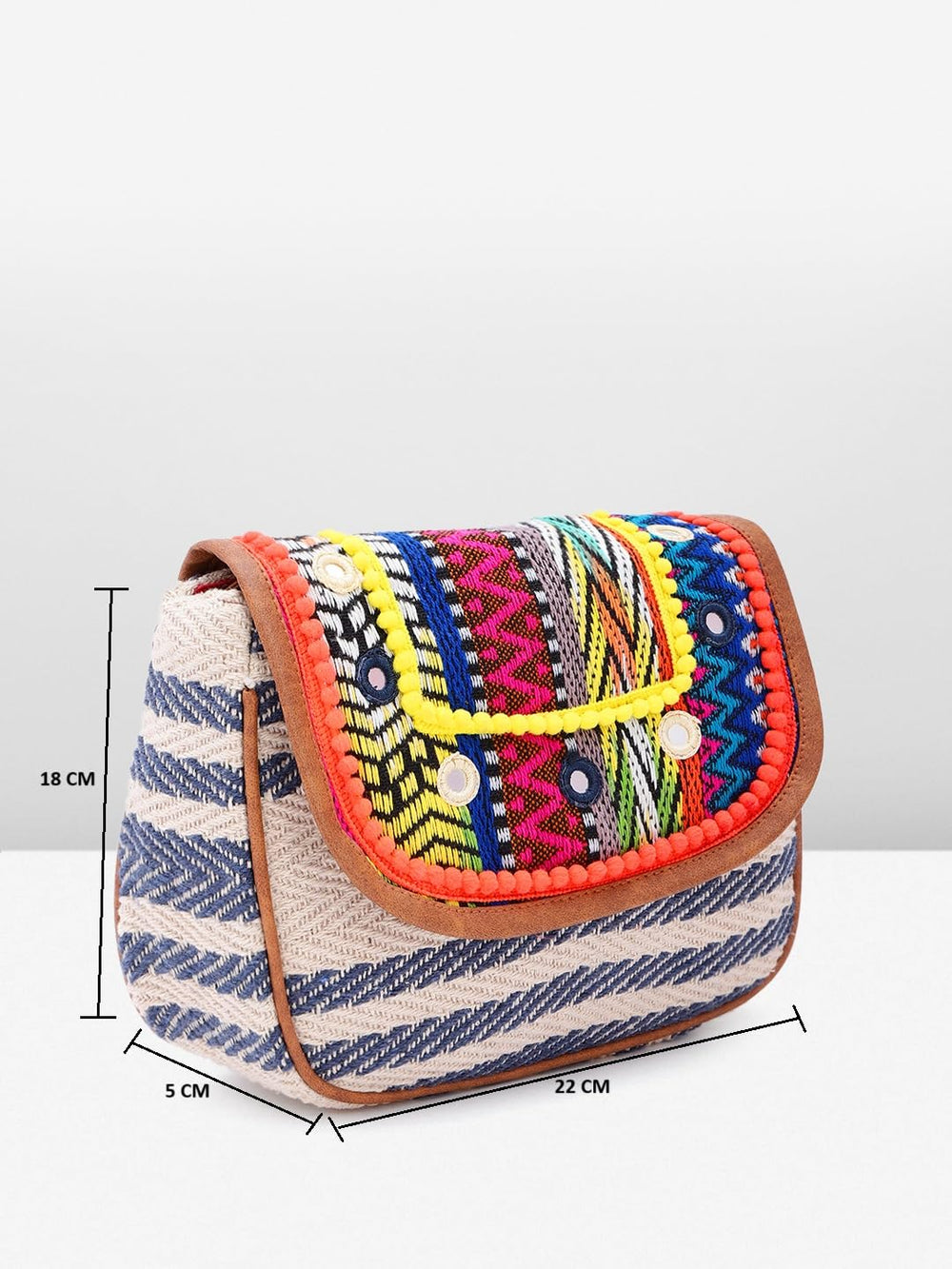 Embrace the vibrant hues and intricate patterns of this handcrafted shoulder bag, a true embodiment of artisanal craftsmanship. Meticulously woven with colourful threads, it showcases a mesmerising blend of traditional motifs and contemporary flair. The bag's exterior boasts a striking geometric design, featuring a harmonious interplay of orange, pink, yellow, and blue hues, complemented by earthy brown accents. Adorned with beaded embellishments and studded details, each element adds a touch of rustic charm. The interior is lined with a durable fabric, ensuring ample space for your essentials. Crafted with utmost care, this bag is not only a fashion statement but also a celebration of cultural heritage. Sling it across your shoulder and let it elevate your ensemble with its vibrant allure. Measurements: 22 cm (length) x 18 cm (height) x 5 cm (depth).