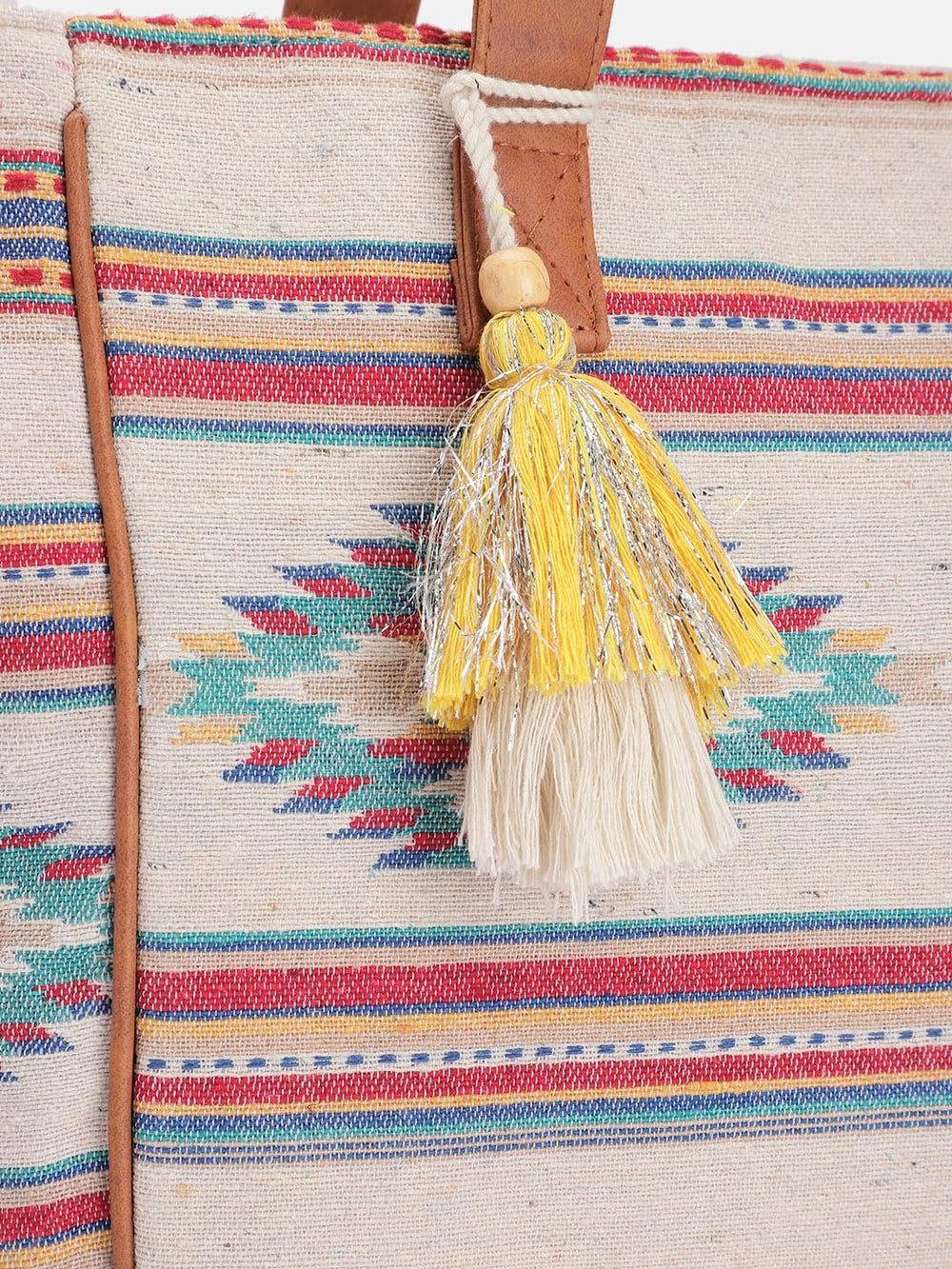 Elevate your style with this chic and trendy tote bag. Crafted with intricate woven patterns and vibrant hues, it exudes a bohemian flair that adds a touch of whimsy to any outfit. The spacious interior offers ample room for your daily essentials, while the sturdy leather handles provide a comfortable grip. A tasselled accent lends an elegant finishing touch, making this bag a true standout accessory. Lightweight yet durable, it's the perfect companion for your adventures, whether you're exploring the city streets or embarking on a weekend getaway. Embrace the spirit of wanderlust and let this stylish tote accompany you wherever life takes you.
