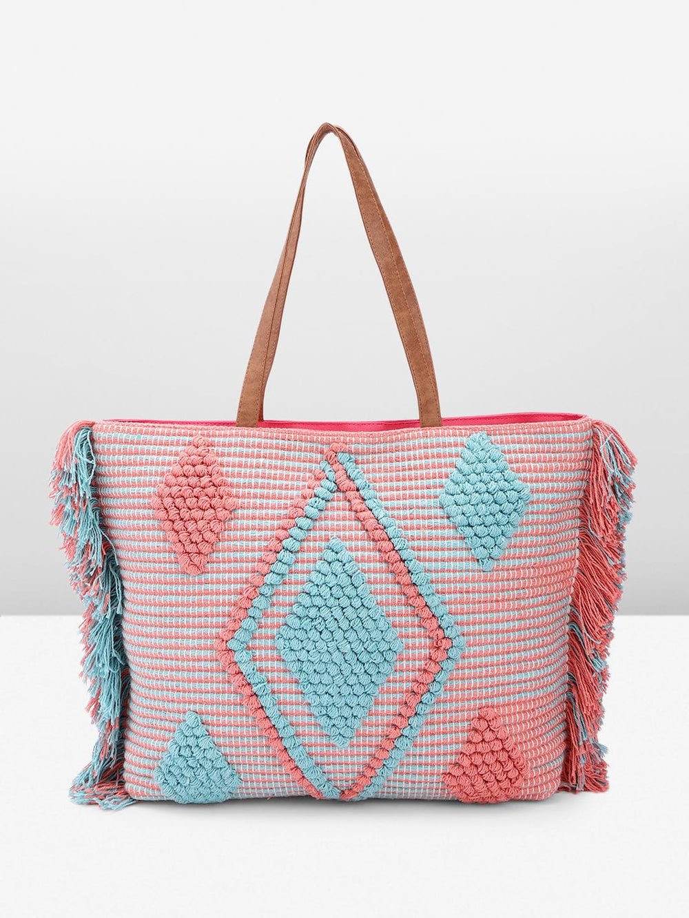 This vibrant and eye-catching tote bag is a true masterpiece of artisanal craftsmanship. Meticulously handwoven using traditional techniques, the bag features a captivating design with intricate diamond patterns in shades of coral and aqua adorning the beige woven body. Fringed tassels add a whimsical touch, while the sturdy leather handles ensure a comfortable and secure grip. This spacious tote is perfect for carrying all your daily essentials in style. With its unique and intricate design, this handcrafted bag is a statement piece that will elevate any outfit and turn heads wherever you go. Embrace the beauty of handmade artistry with this one-of-a-kind tote bag.