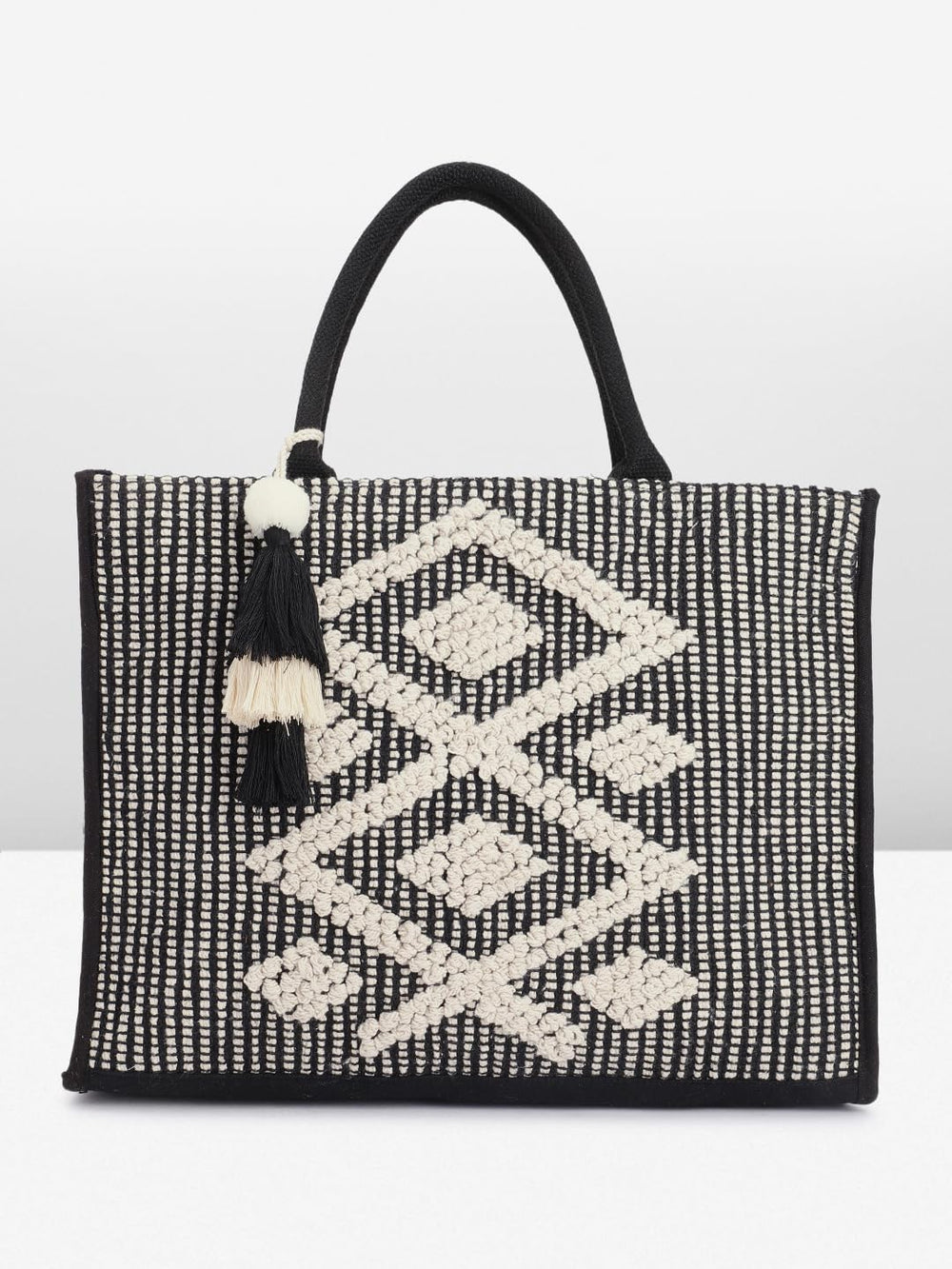 This handcrafted tote bag is a true masterpiece of artisanal craftsmanship. Meticulously woven with intricate black and white patterns, it exudes a timeless elegance that will elevate any ensemble. The contrasting textures and tasselled accents add a touch of bohemian flair, while the spacious interior and sturdy handles make it a practical choice for everyday use. Crafted with utmost attention to detail, this bag is a testament to the skill of its artisans, blending traditional techniques with contemporary design sensibilities. Whether you're running errands or attending a social gathering, this tote will undoubtedly turn heads and become a cherished addition to your accessory collection.