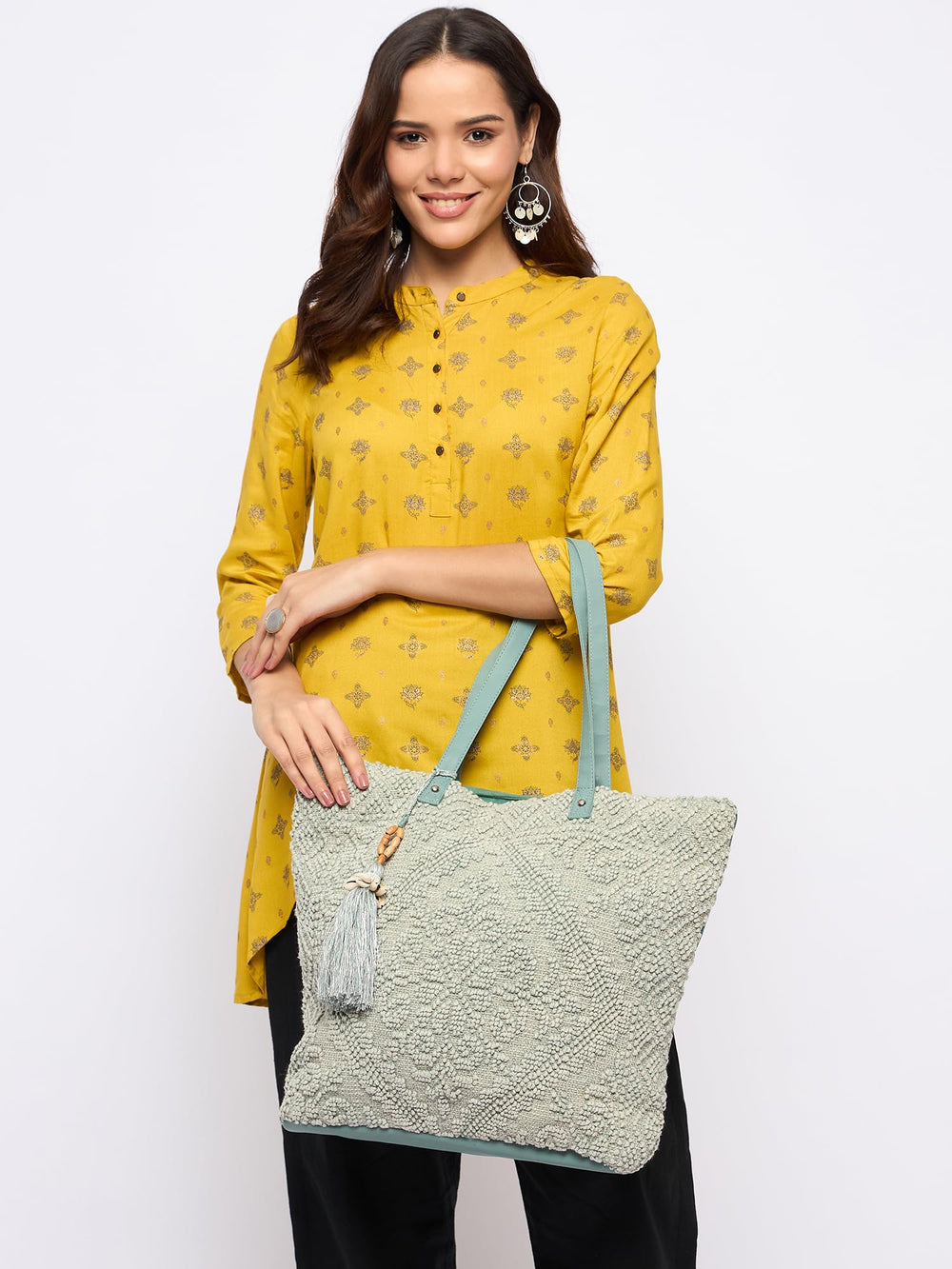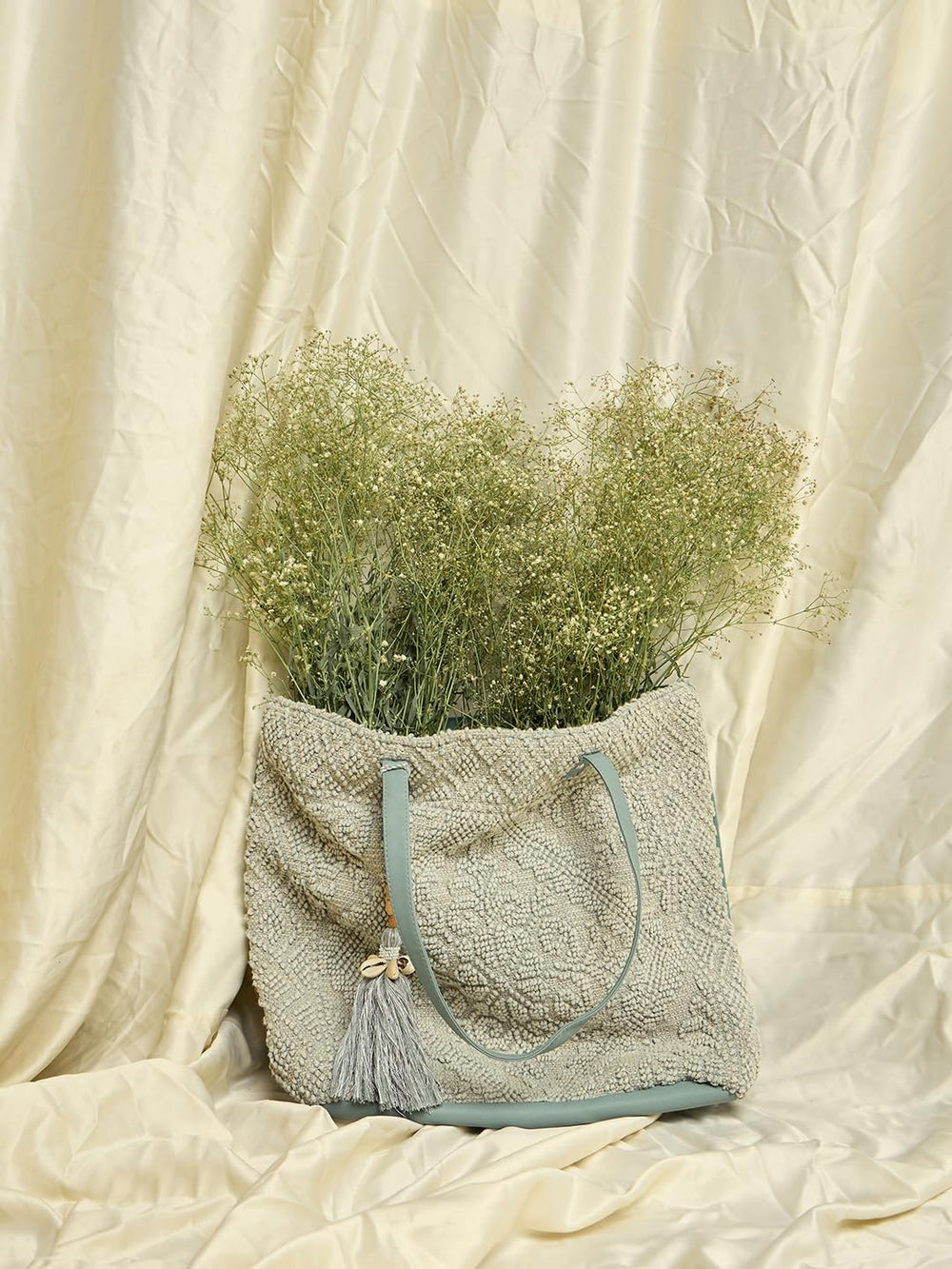 Elevate your style with this exquisite handcrafted tote bag. Crafted from intricately woven natural fibres, it exudes an earthy charm that complements any ensemble. The roomy interior offers ample space for your daily essentials, while the leather handles provide a comfortable grip. A tasselled charm adds a delightful touch of whimsy. Lightweight yet durable, this tote is perfect for work, travel, or casual outings. Embrace timeless sophistication with this versatile and chic accessory.