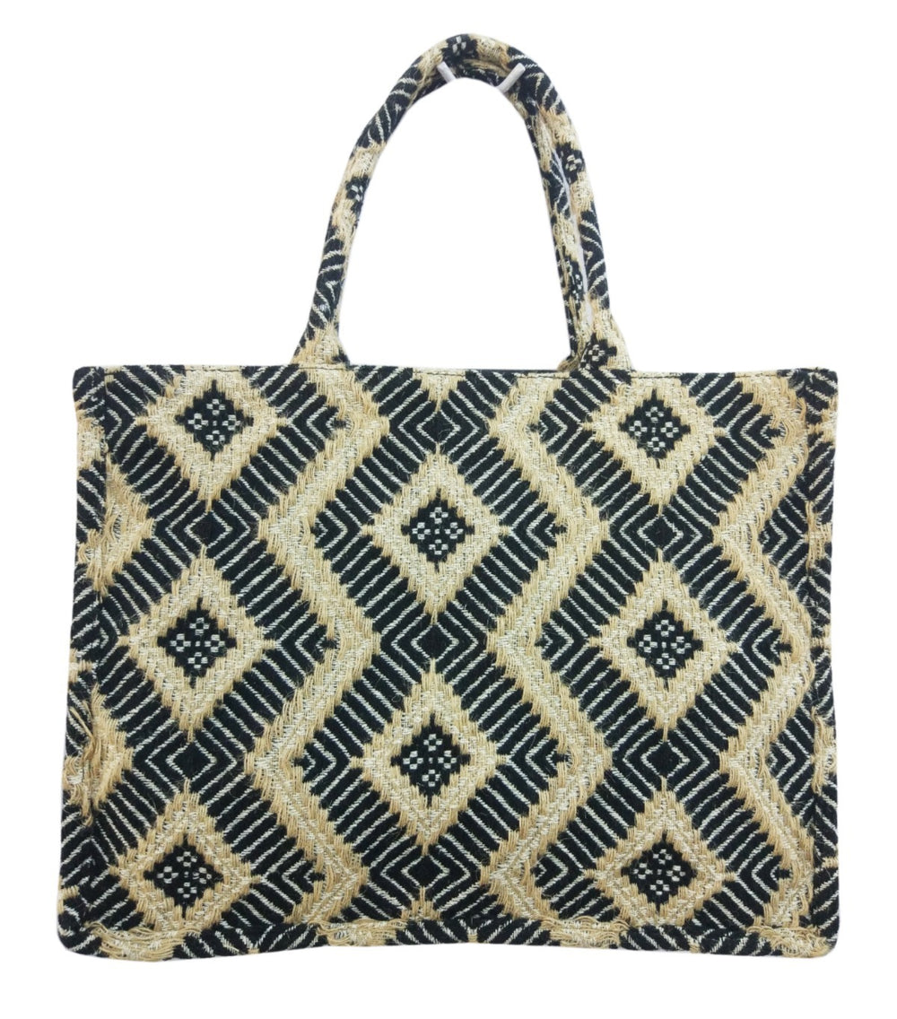 This handwoven jute tote bag combines style and functionality with its striking geometric diamond pattern in black and natural tones. The eye-catching design features intricate diagonal lines and diamond motifs that create a sophisticated, contemporary look whilst celebrating traditional craftsmanship. Perfect for everyday shopping, trips to the market, or as a stylish carry-all for your daily essentials, this spacious bag offers ample room for all your belongings. The sturdy jute construction ensures durability and longevity, making it ideal for regular use. The comfortable handles are thoughtfully designed to distribute weight evenly, allowing you to carry heavier items with ease. This versatile tote transitions seamlessly from practical shopping companion to fashionable accessory, complementing both casual and smart-casual outfits. The natural texture of jute adds an organic, artisanal touch to your ensemble whilst the geometric pattern provides visual interest. Each bag showcases the skill of traditional weaving techniques, making every piece unique. Whether you're heading to the grocery store, beach, or using it as your everyday bag, this handwoven jute tote combines practicality with distinctive style.