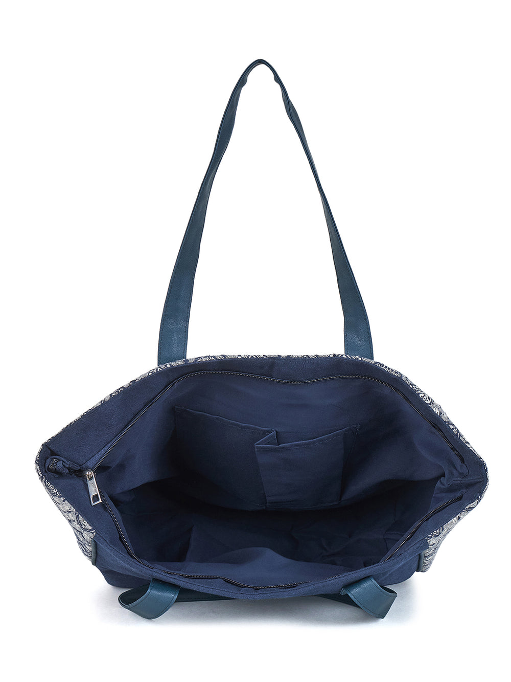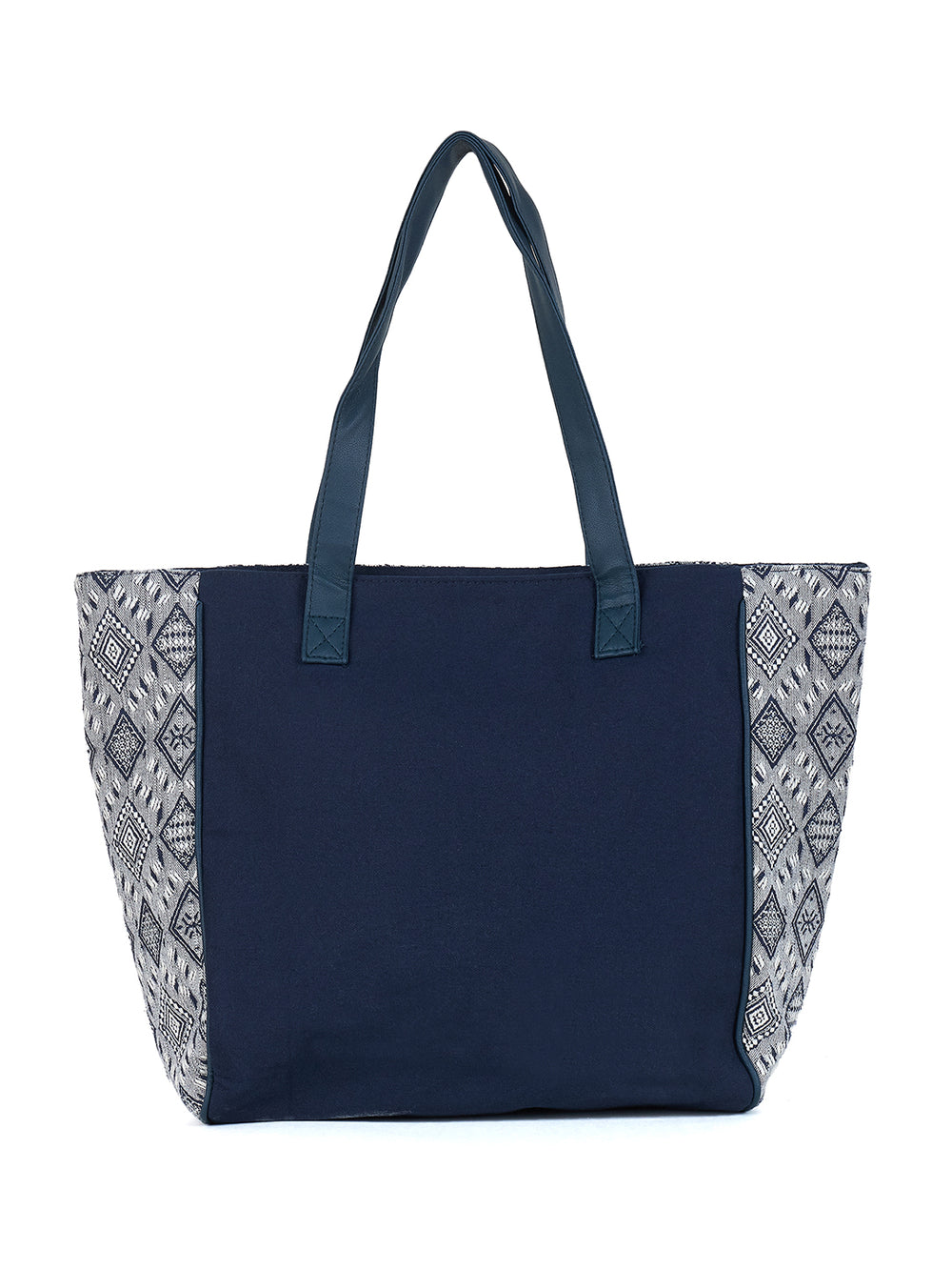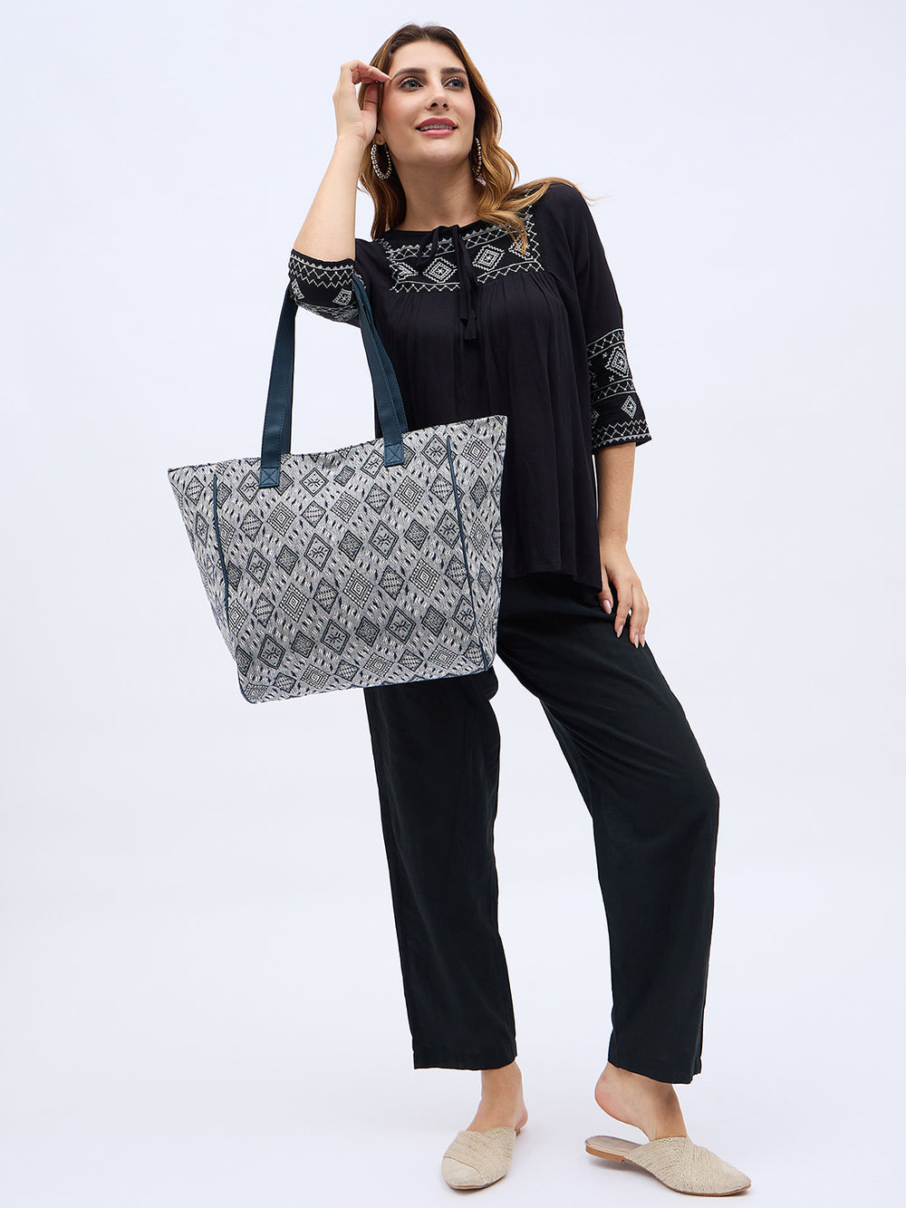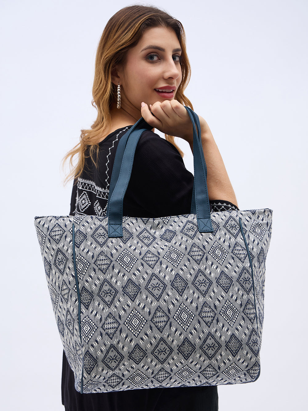 PRIMROSE Large Canvas Tote Bag, Grey and Navy Diamond Pattern, Geometric Print Shopping Shoulder Bag