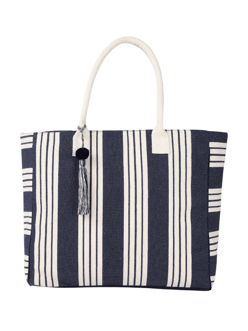 Make a stylish statement with this generously sized canvas tote bag featuring a timeless navy blue and white striped pattern. The sophisticated design combines bold vertical stripes with complementary geometric patterns along the sides, creating a versatile accessory perfect for both casual outings and beach adventures. The sturdy white handles ensure comfortable carrying, while the charming grey tassel detail adds a touch of whimsy and elegance. Crafted from durable canvas material, this spacious tote offers ample room for your shopping essentials, beach necessities, or daily items. The classic nautical colour scheme makes it an ideal companion for summer activities while remaining fashionable throughout the year. The bag's practical design includes a roomy main compartment that's perfect for organizing your belongings. Whether you're heading to the market, beach, or running daily errands, this tote combines functionality with maritime-inspired style that elevates any casual ensemble.