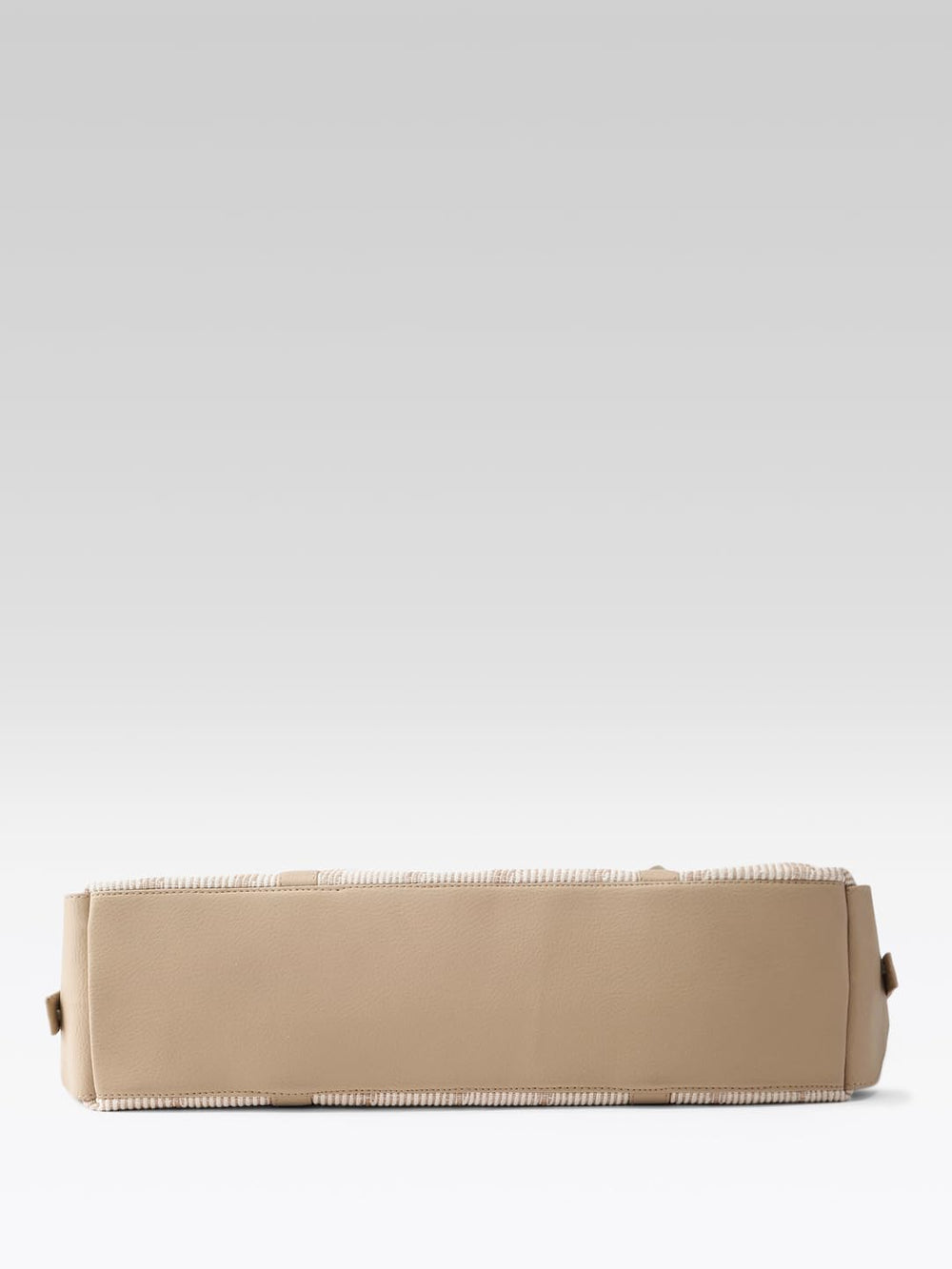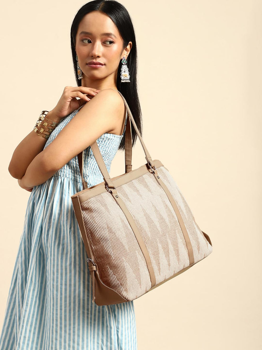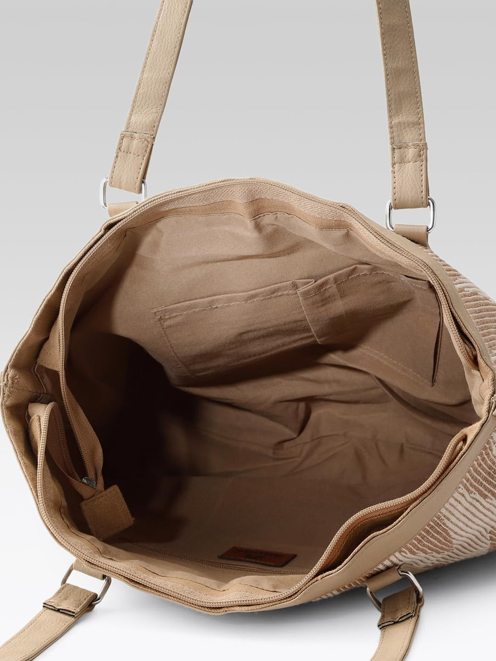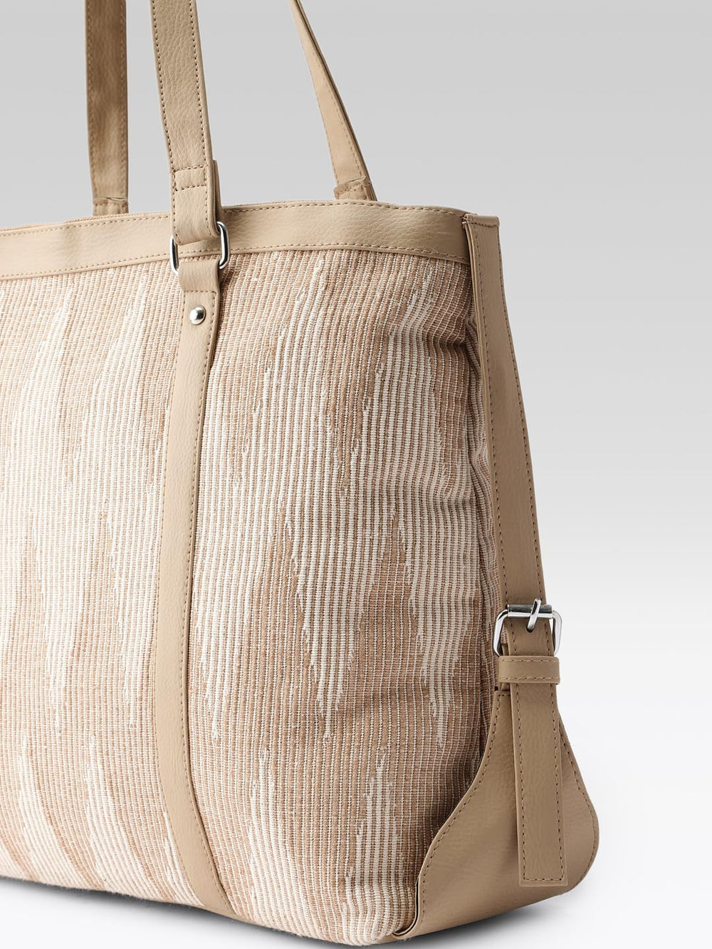 Elevate your everyday style with this sophisticated large canvas tote bag featuring an eye-catching textured pattern in elegant beige tones. The bag showcases a distinctive vertical striped design that adds visual interest while maintaining its versatility. Crafted with durable canvas material and reinforced with high-quality faux leather trim, this spacious tote offers both style and functionality. The double shoulder straps are thoughtfully designed for comfortable carrying, while the adjustable side ties allow you to customize the bag's shape. Perfect for work, shopping, or casual outings, this tote provides ample space for your daily essentials. The neutral colour palette ensures it complements any outfit, making it a versatile addition to your accessory collection. The bag's structured silhouette maintains its shape while the textured fabric adds a contemporary touch to this classic design. The metal hardware accents provide both durability and a polished finish to this sophisticated accessory.