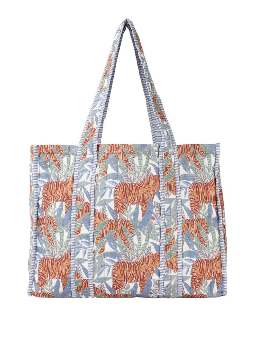 Make a bold style statement with this eye-catching large canvas tote bag featuring a stunning tropical tiger print design. The vibrant orange tigers prowl amidst lush botanical elements in soft blues and greens, creating a mesmerising jungle-inspired pattern. The bag is beautifully finished with coordinating striped trim that adds a sophisticated touch to the whimsical design. Perfect for shopping trips, beach outings, or as a fashionable everyday carry-all, this spacious tote offers ample room for all your essentials. The durable canvas construction ensures long-lasting use, while the comfortable shoulder straps make it easy to carry your belongings. The striking pattern combines classic blue and orange hues in a modern interpretation of tropical motifs, making it a versatile accessory that pairs well with both casual and smart casual outfits. Whether you're running errands or heading to a casual gathering, this distinctive tote bag adds a splash of artistic flair to any ensemble.