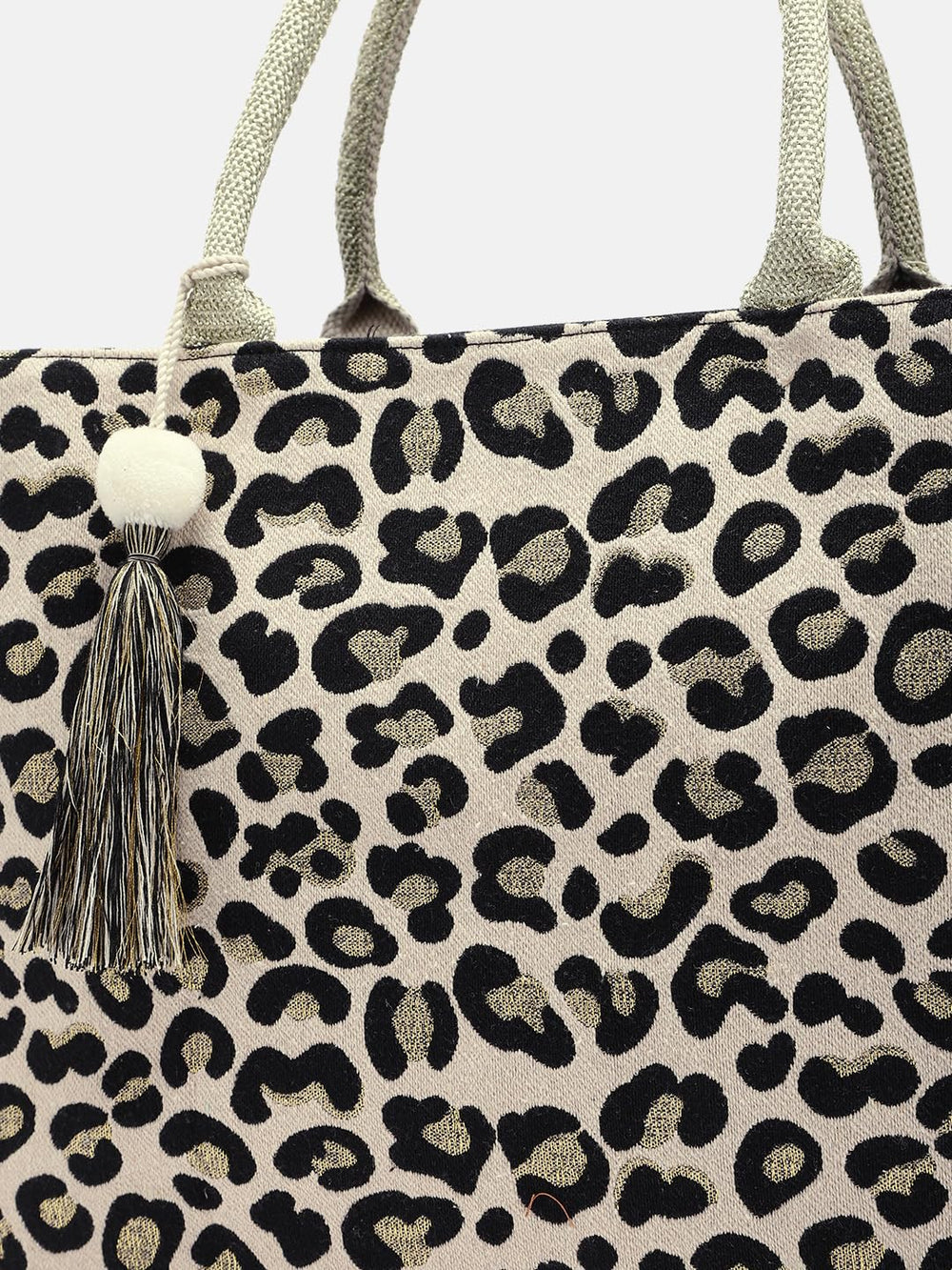 Embrace your wild side with this chic and stylish handbag that exudes a fierce and fashionable flair. Crafted with a luxurious leopard print canvas, this tote bag effortlessly combines elegance and edge. The roomy interior provides ample space for all your daily essentials, while the sturdy woven handles ensure a comfortable and secure grip. Accentuated with a playful tassel detail, this handbag adds a touch of whimsy to any ensemble. Whether you're dressing up for a night out or keeping it casual for a day of errands, this versatile accessory is sure to elevate your look with its bold and captivating design. Indulge in the timeless allure of animal prints and make a statement wherever you go.