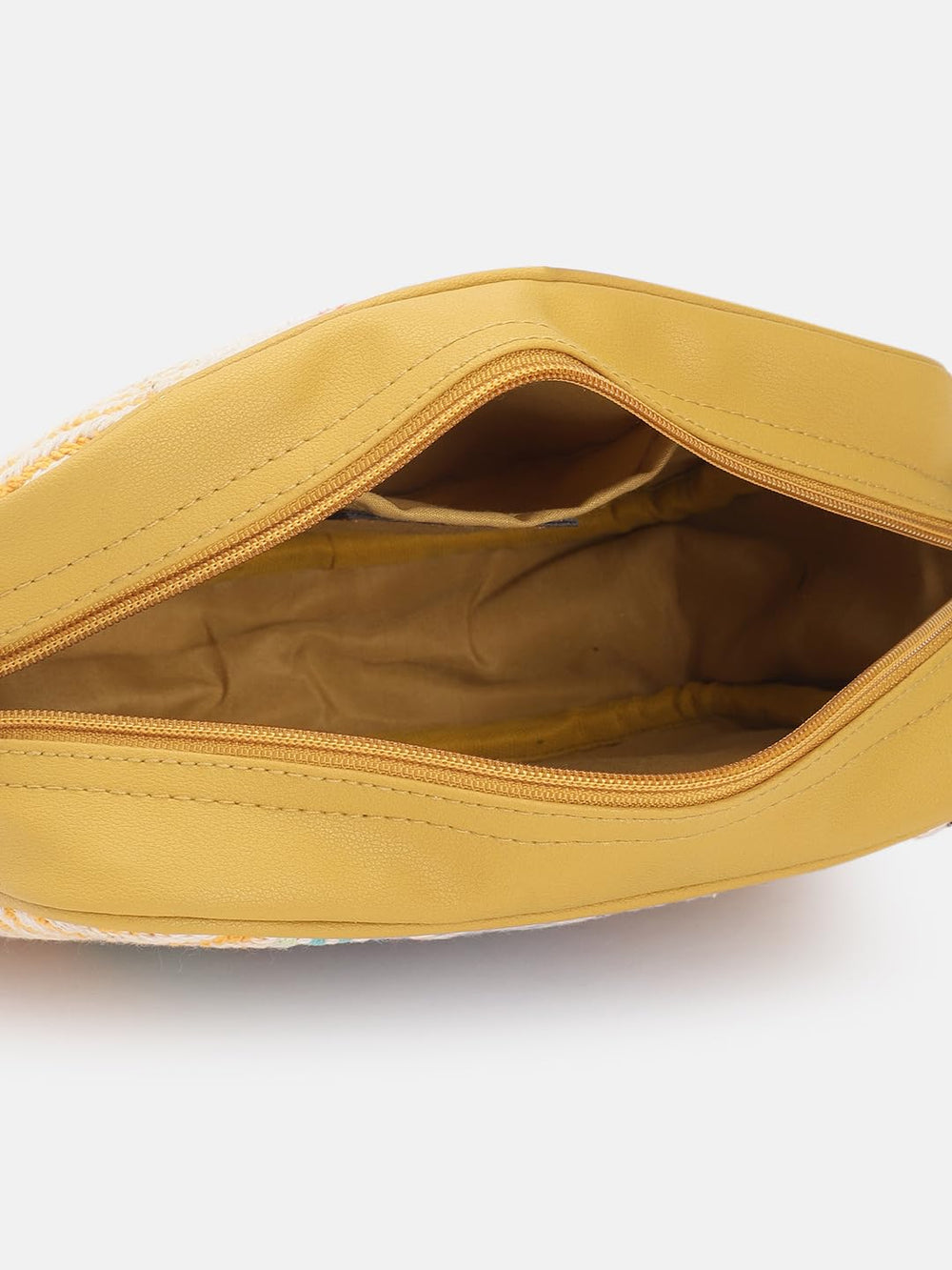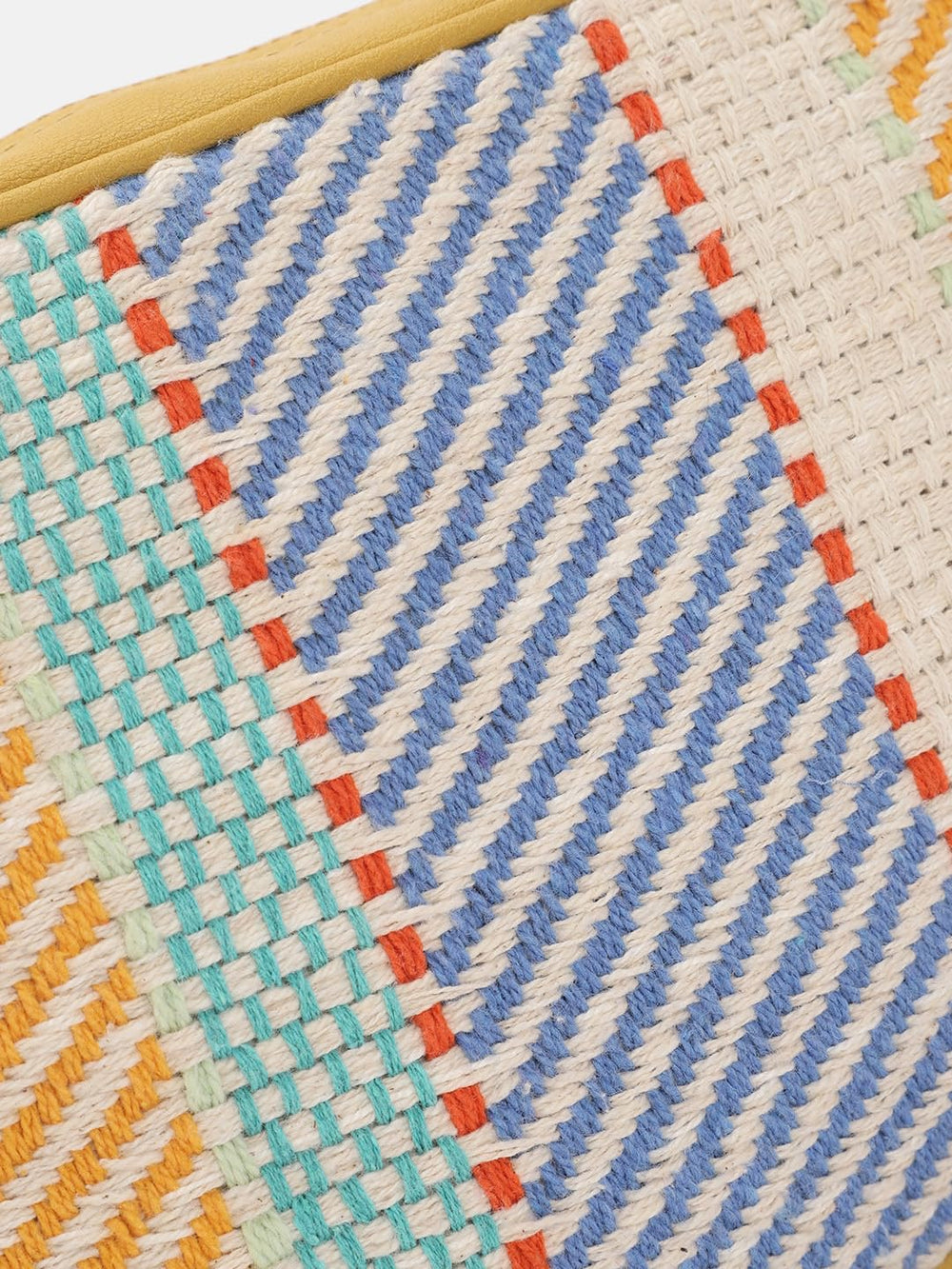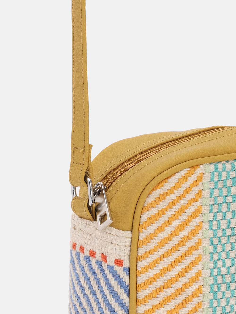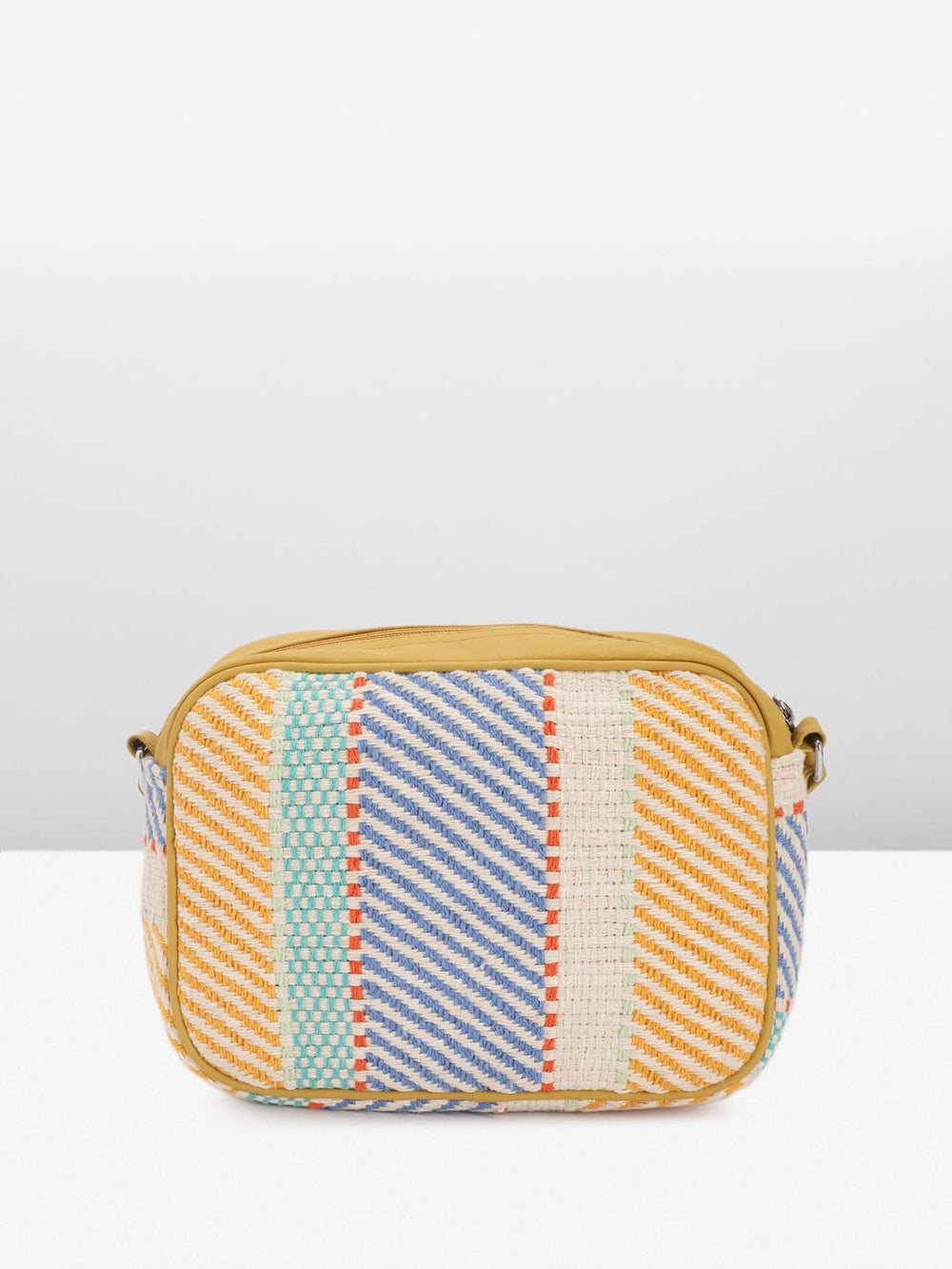 This stylish and vibrant handbag is a true fusion of traditional craftsmanship and contemporary design. Meticulously handcrafted, it features a striking pattern of stripes and geometric motifs in warm hues of yellow, orange, and blue, interspersed with intricate woven textures. The sturdy construction and quality materials ensure durability, while the adjustable strap offers versatility in carrying. This unique piece is not just a fashion statement but a celebration of artisanal skills passed down through generations. Whether you're dressing up for a festive occasion or adding a pop of colour to your everyday ensemble, this handbag is sure to turn heads and become a cherished accessory in your wardrobe.