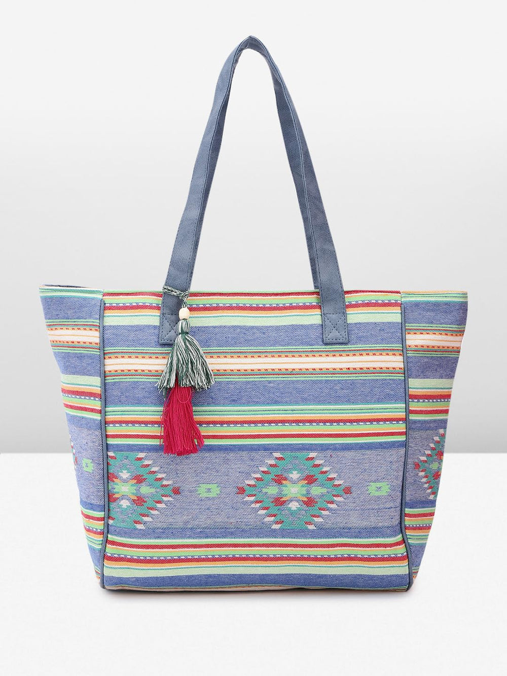 This vibrant and eye-catching tote bag is a true celebration of traditional Indian craftsmanship. Meticulously handwoven with intricate geometric patterns and a riot of colours, it exudes an unmistakable bohemian charm. The canvas material is durable and lightweight, making it perfect for everyday use or travel. A playful tassel adorns the side, adding a touch of whimsy. With its roomy interior and sturdy handles, this bag strikes a perfect balance between style and functionality. Whether you're running errands or heading to the beach, this tote is sure to be a conversation starter and a cherished companion. Embrace the spirit of wanderlust and elevate your look with this artisanal masterpiece. Dimensions: 34cm x 31cm x 16cm.