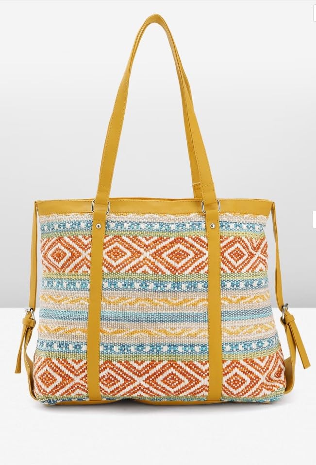 Elevate your style with this stunning hand bag for women. Crafted with a vibrant and intricate woven pattern, it seamlessly blends traditional artistry with modern fashion. The earthy tones of orange, yellow, and blue create a captivating ethnic design that exudes warmth and character. Complemented by rich mustard-hued leather handles and accents, this tote effortlessly transitions from casual outings to semi-formal events. Spacious and practical, it offers ample room for your daily essentials, making it a versatile companion. Embrace the beauty of handcrafted artisanal work and add a touch of cultural charm to your ensemble with this eye-catching hand bag.