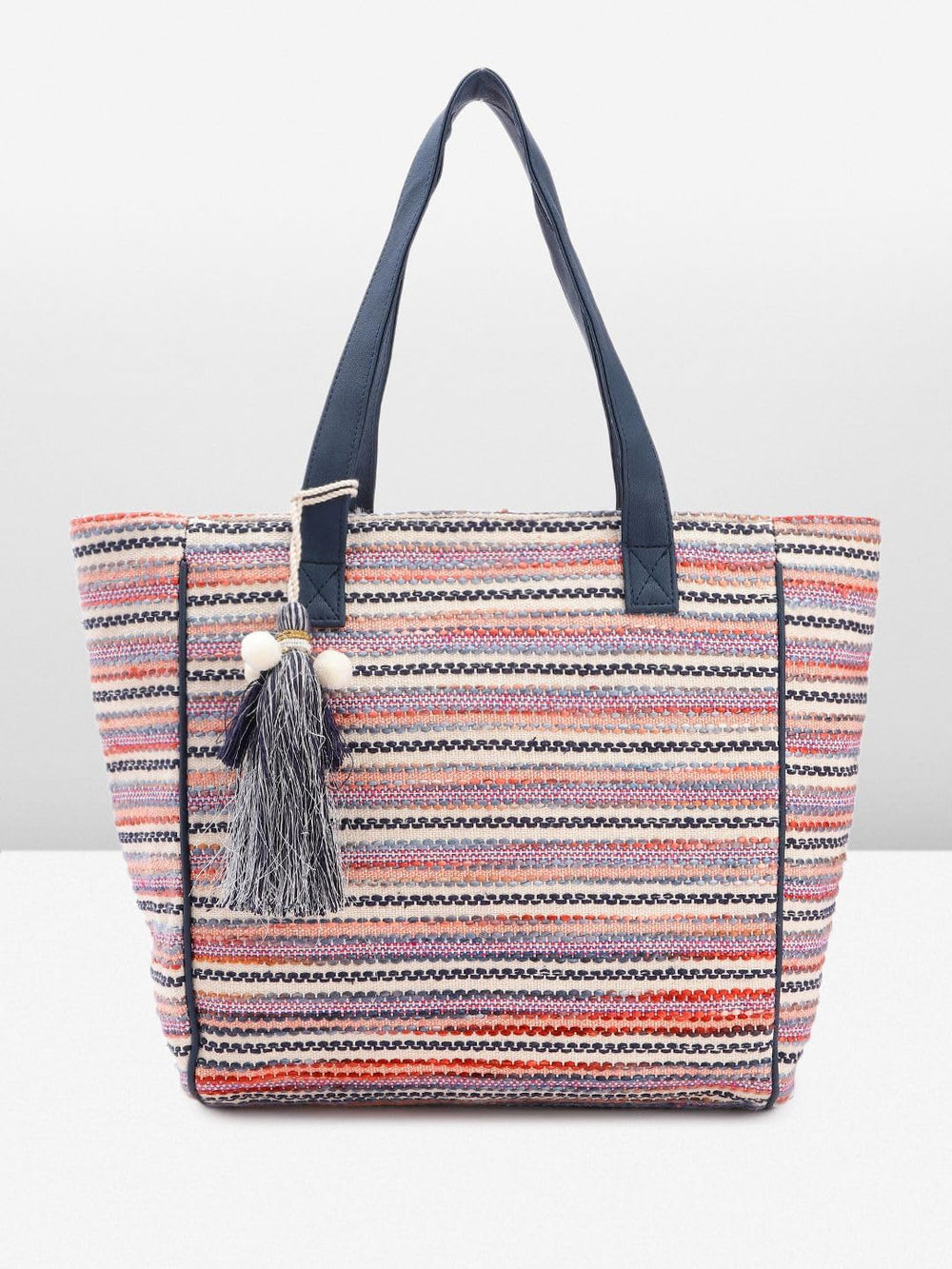 Elevate your style with this chic and trendy tote bag. Crafted with intricate woven patterns in a vibrant array of colours, this bag exudes a bohemian flair that will perfectly complement your casual or semi-formal outfits. The spacious interior provides ample room for your daily essentials, while the durable fabric ensures long-lasting use. The addition of a tasselled charm adds a touch of playfulness to the design. Whether you're running errands or attending a social gathering, this tote bag will be your stylish companion. Dimensions: 32 cm (length) x 35 cm (height) x 15 cm (Width).
